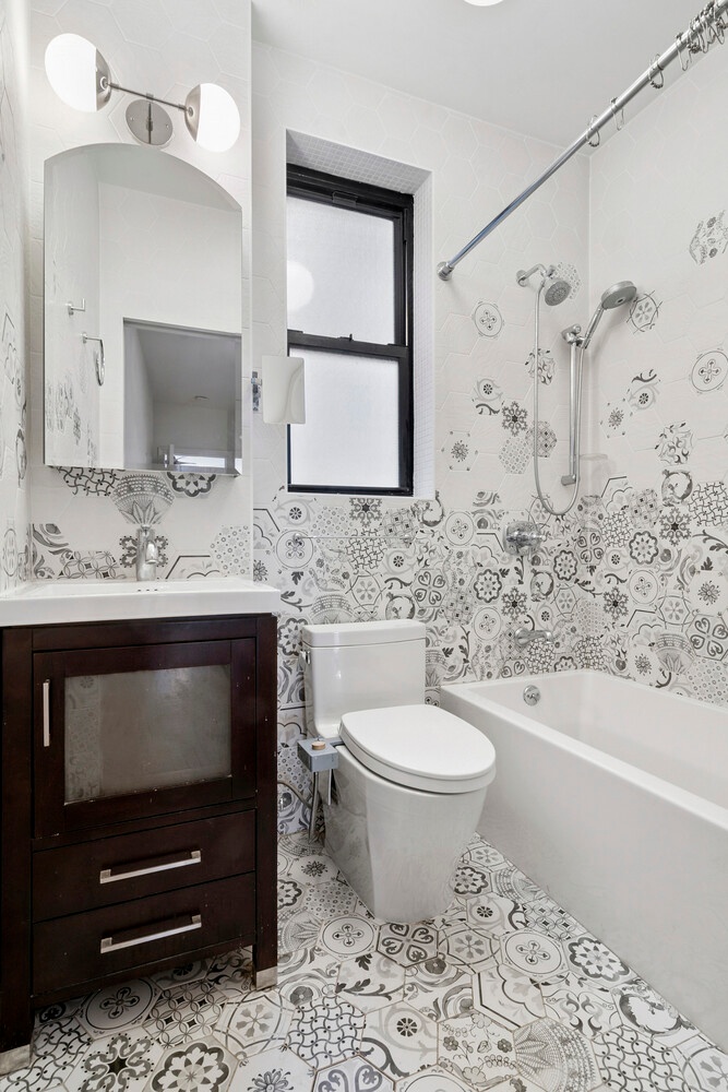 The bedroom suite offers rare privacy and comfort, featuring a walk-in closet and a windowed en-suite bath. The bathroom is an extension of the home's refined artistry, clad in elegantly patterned tiles that wrap the walls and floor in a modern monochrome motif. A floating vanity, medicine cabinet, custom lighting, and clean chrome fixtures complete the space with spa-like sensibility.