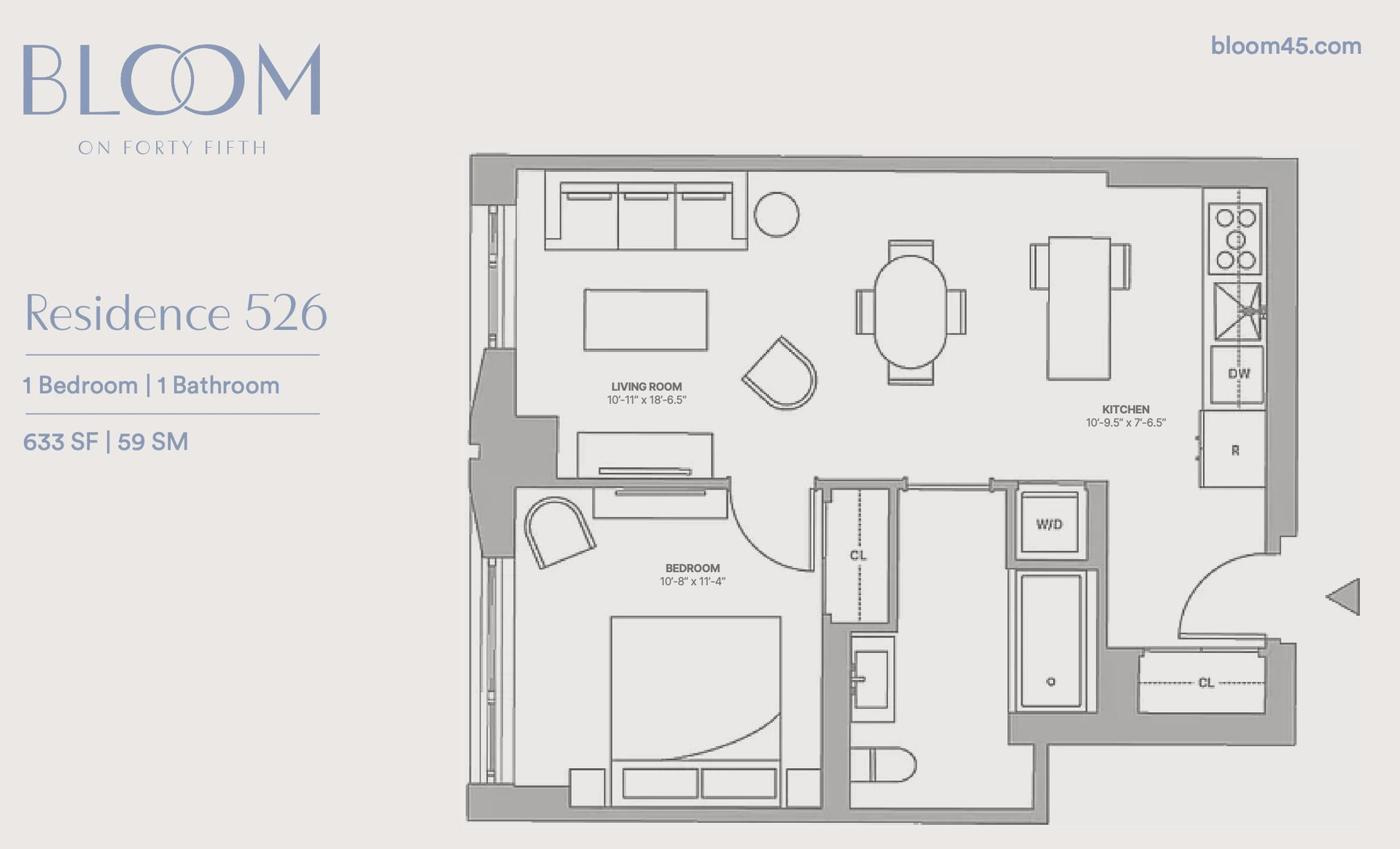 Welcome to unit 526 at The Bloom on 45. Thoughtfully designed to redefine modern urban living, this luxurious home combines spaciousness, light, and style to create a true haven in the heart of Midtown West.