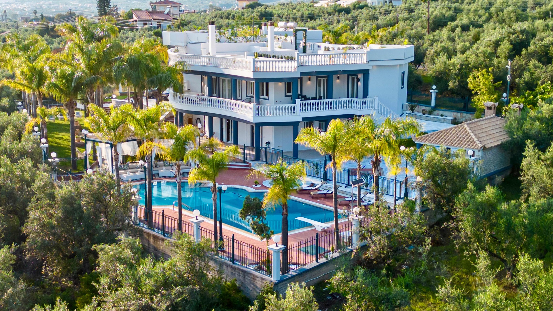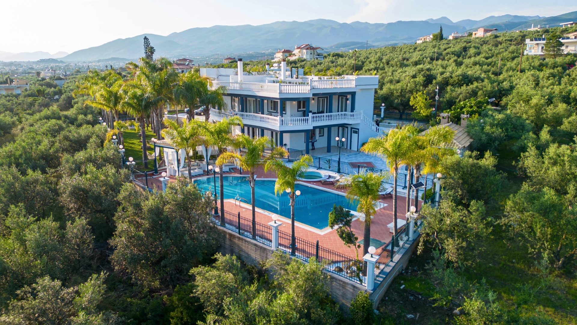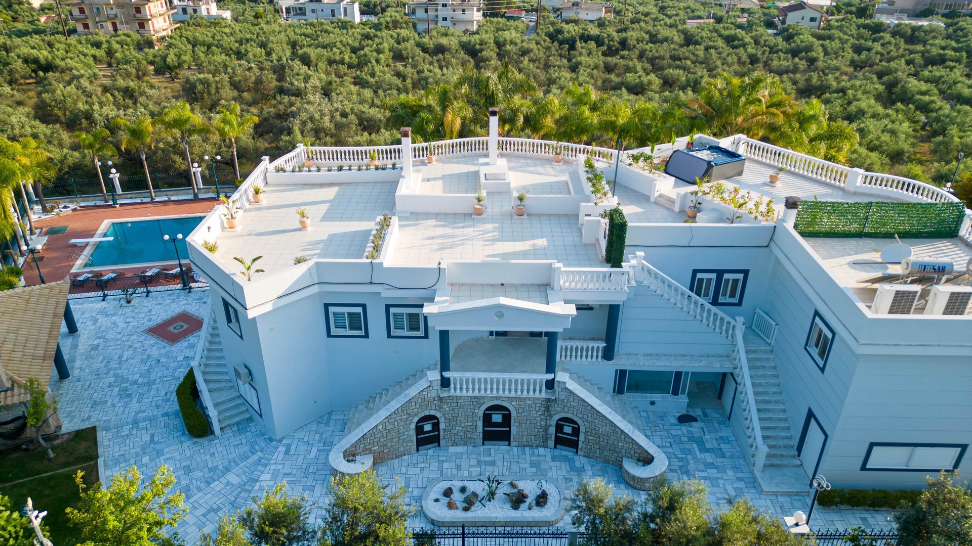 The grounds span 6,000 sqm in total: 2,000 sqm are landscaped with marble, stone and lawn pathways, complemented by a private swimming pool and two Jacuzzis. In addition, there are four enclosed garages with storage and a separate 4,000 sqm private olive grove containing roughly 100 mature olive trees.