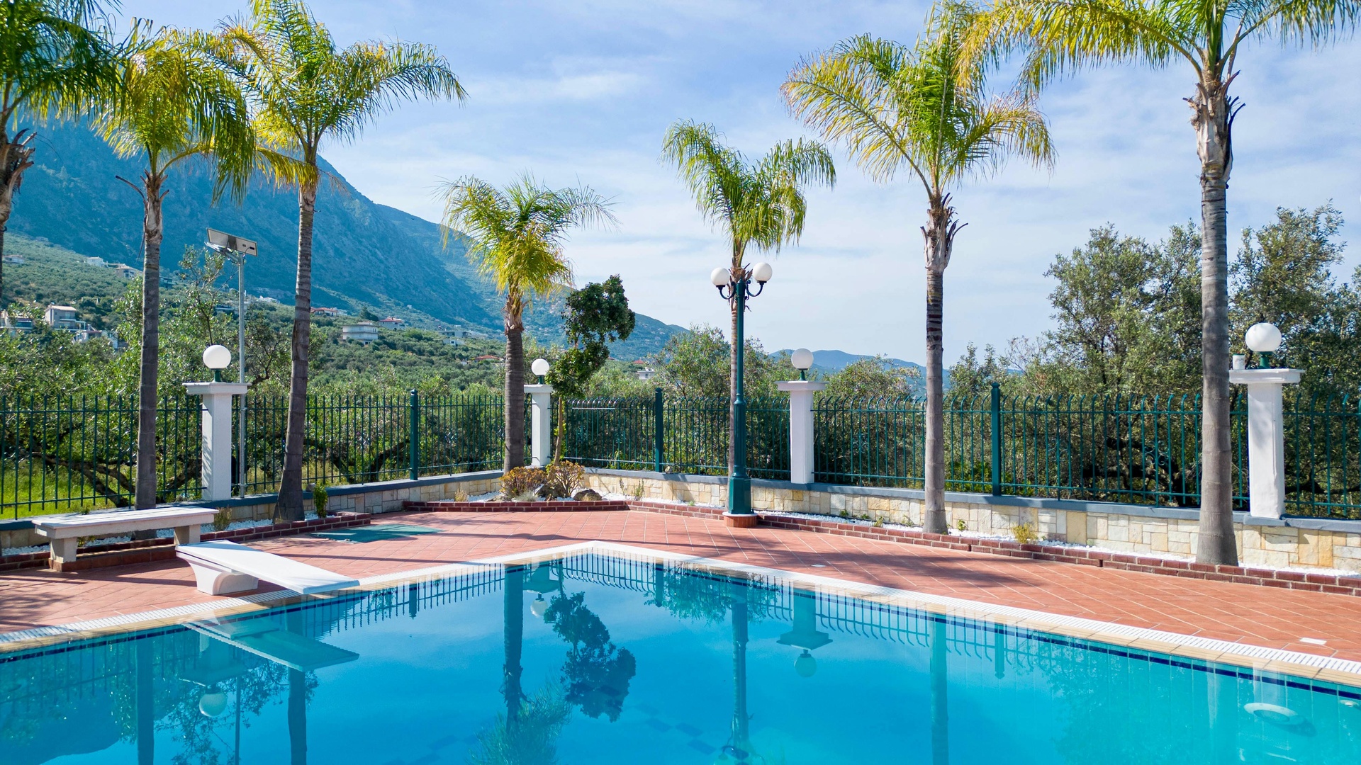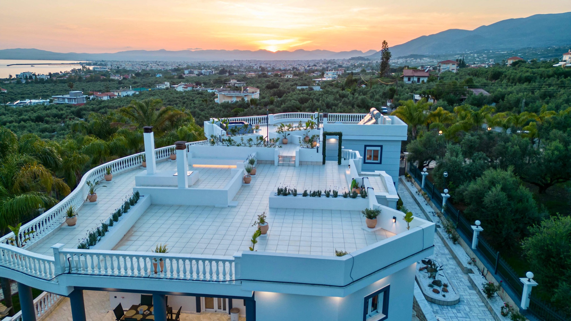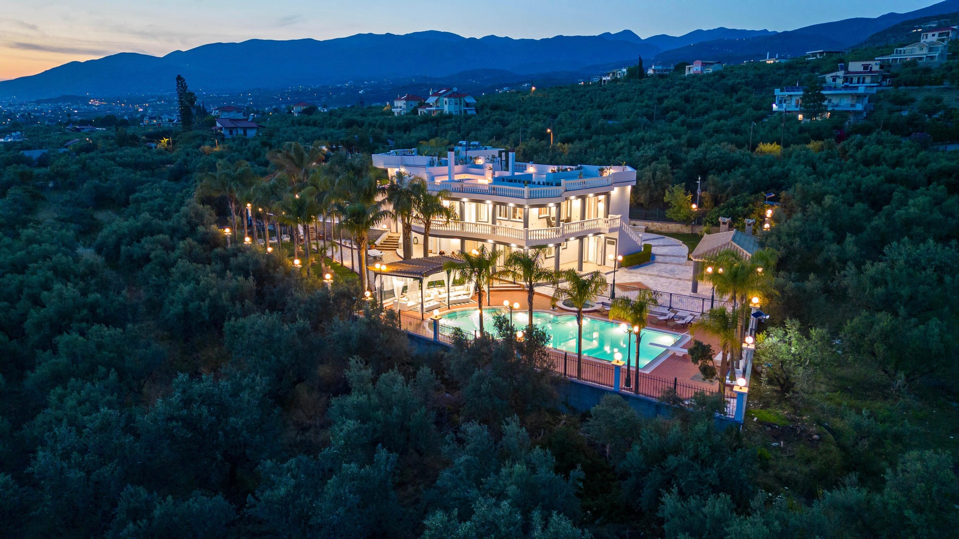 The grounds span 6,000 sqm in total: 2,000 sqm are landscaped with marble, stone and lawn pathways, complemented by a private swimming pool and two Jacuzzis. In addition, there are four enclosed garages with storage and a separate 4,000 sqm private olive grove containing roughly 100 mature olive trees.