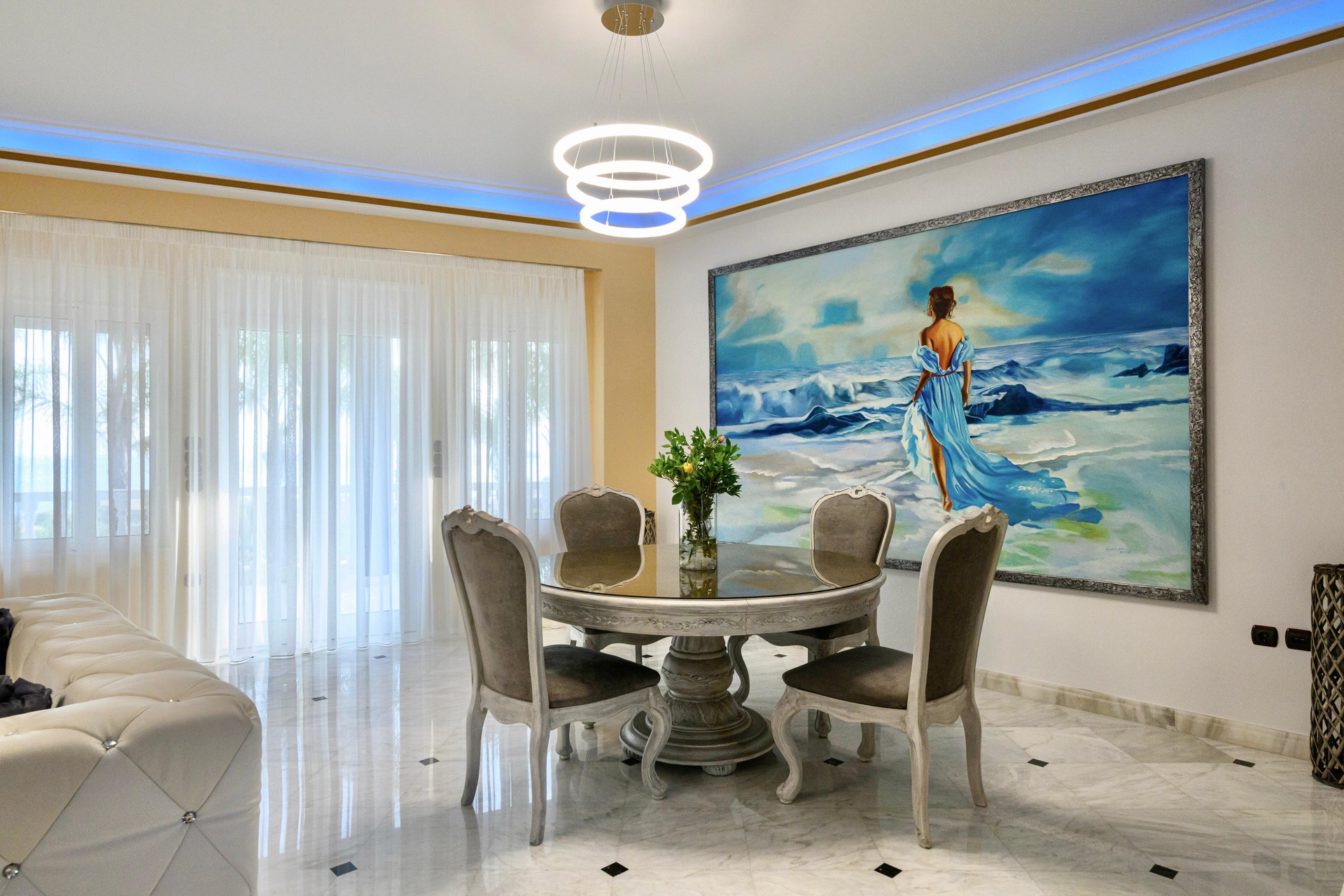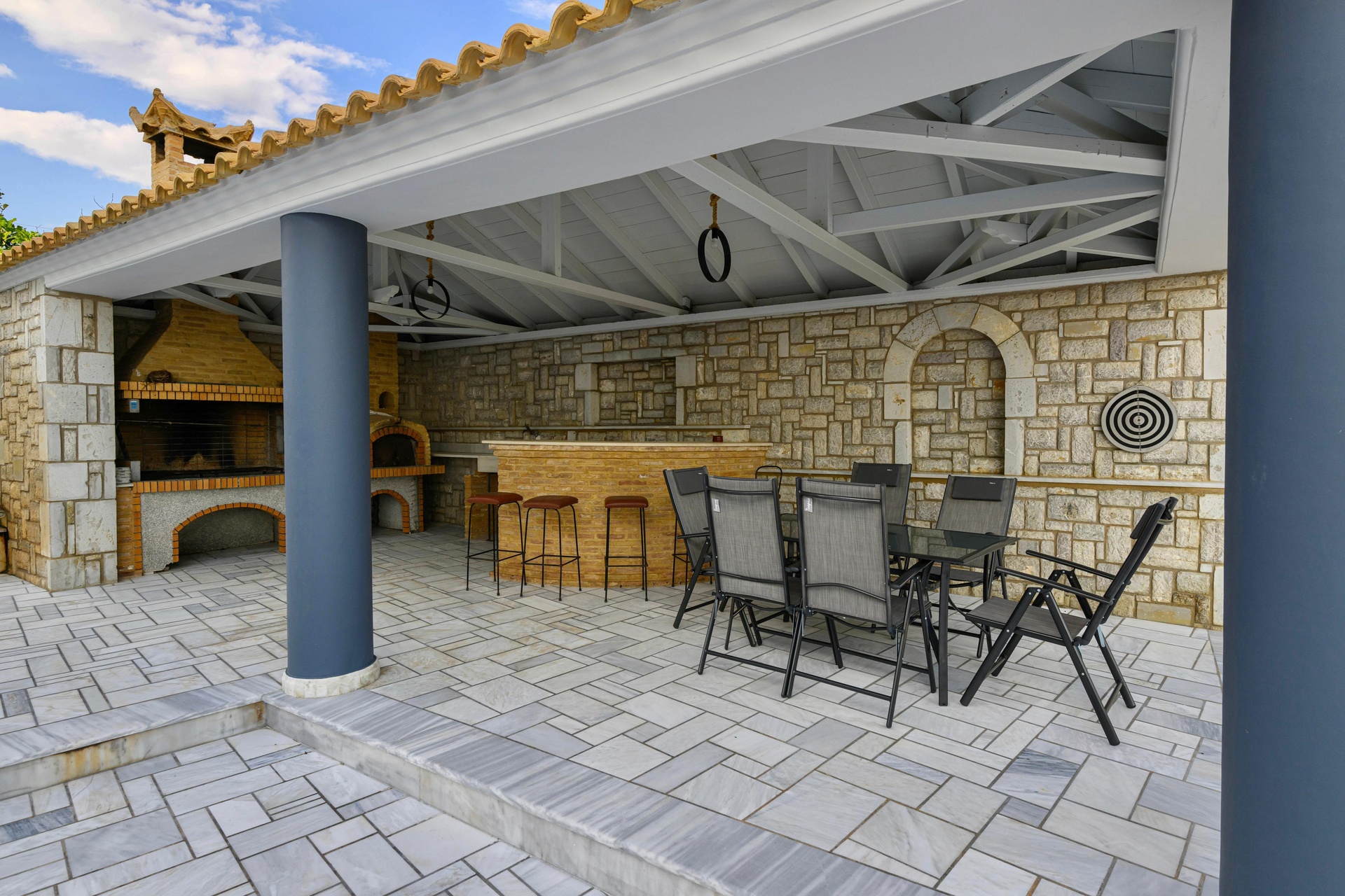 This villa represents a rare blend of regal architecture and Mediterranean beauty. The residence covers 500 sqm across two distinct levels: the upper floor exudes a “Scarface” ambience with luxurious marble finishes and grand proportions, while the ground level recalls a traditional stone villa, featuring natural materials and warm textures. The interiors flow seamlessly onto imposing terraces and manicured gardens, creating the perfect setting for elegant social gatherings or quiet moments by the pool.