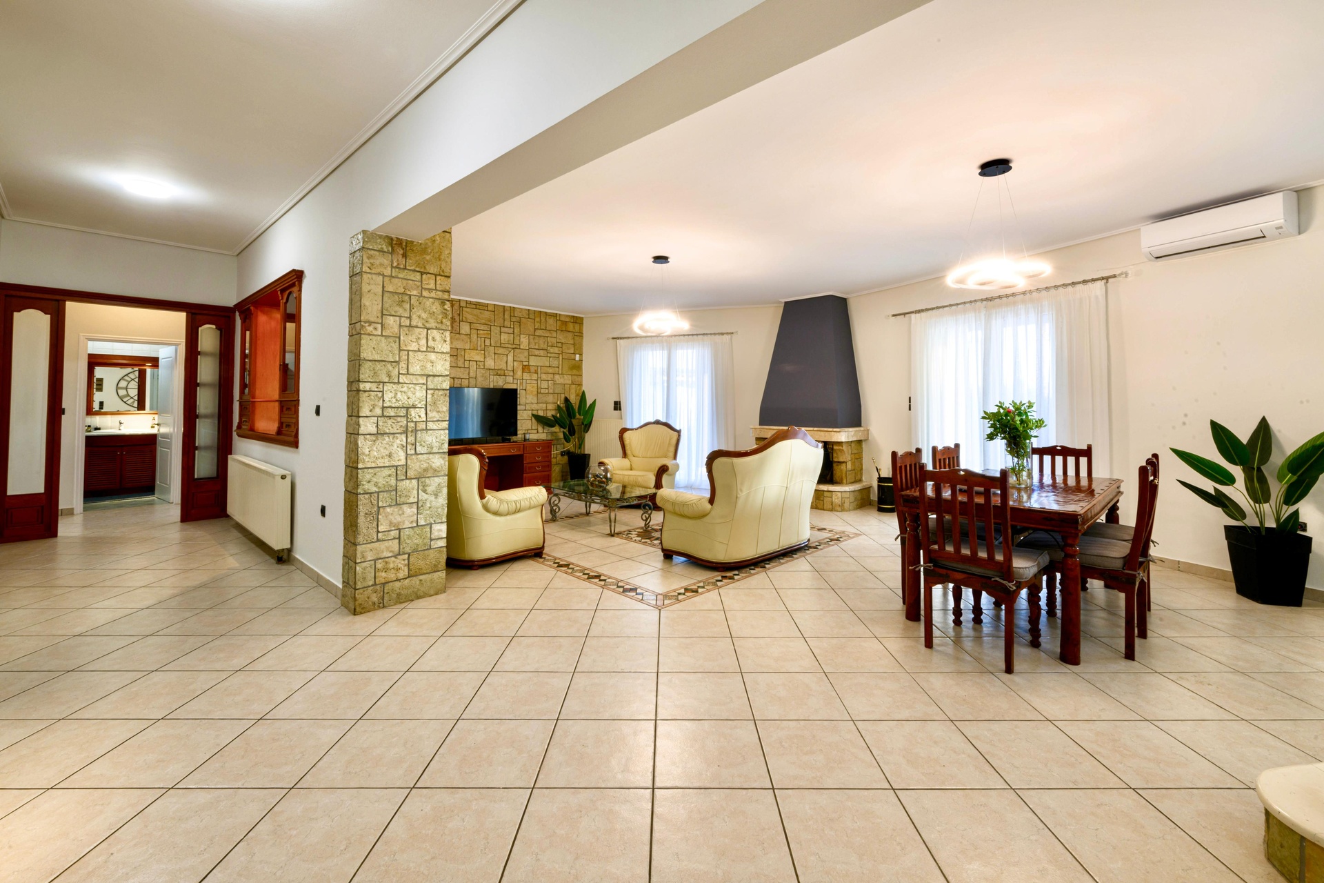 The estate offers six generous bedrooms (including a lavish master suite), four elegant bathrooms and a guest WC. There are three expansive living rooms, two fully equipped kitchens and two refined dining areas capable of hosting anything from family meals to striking dinner parties.