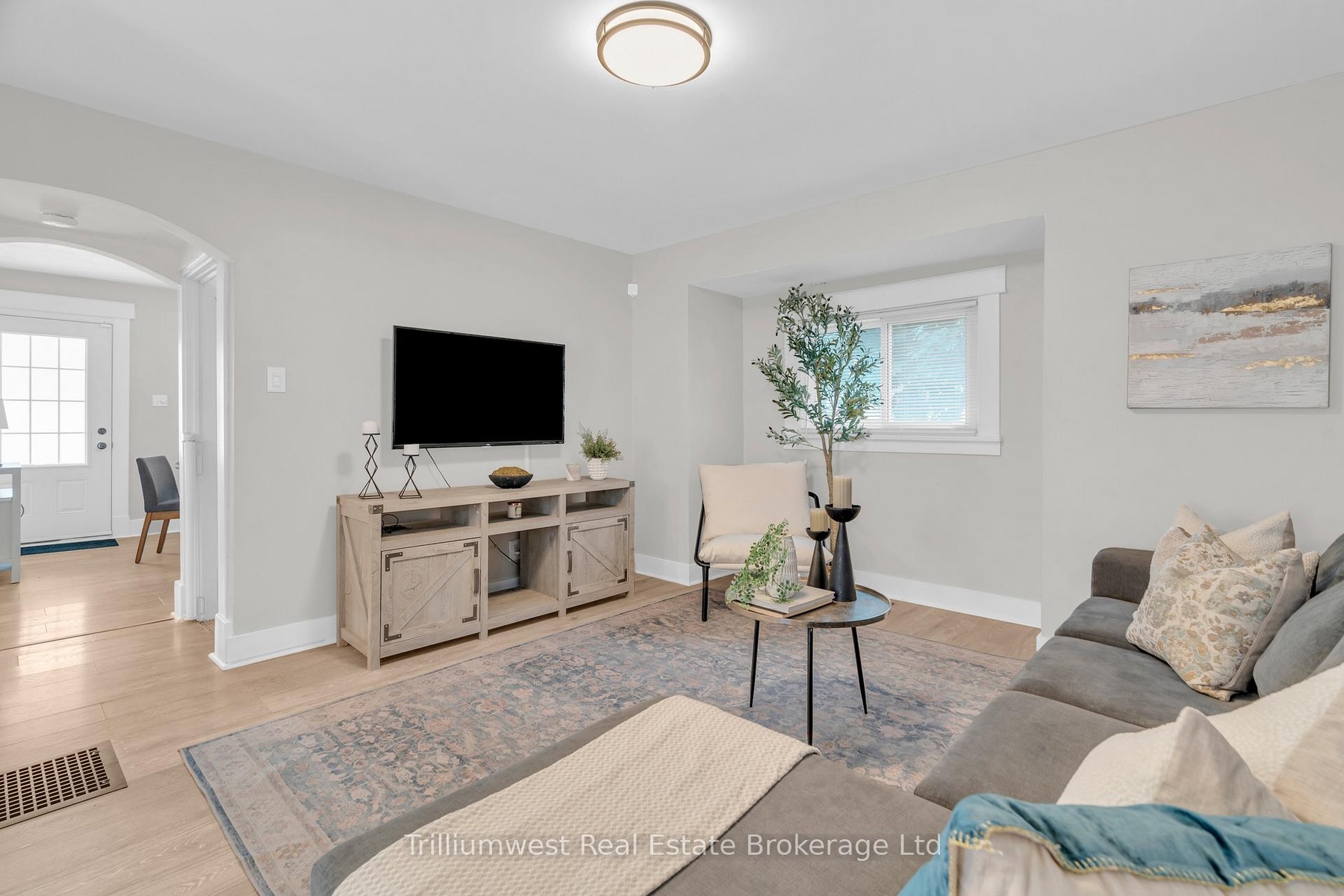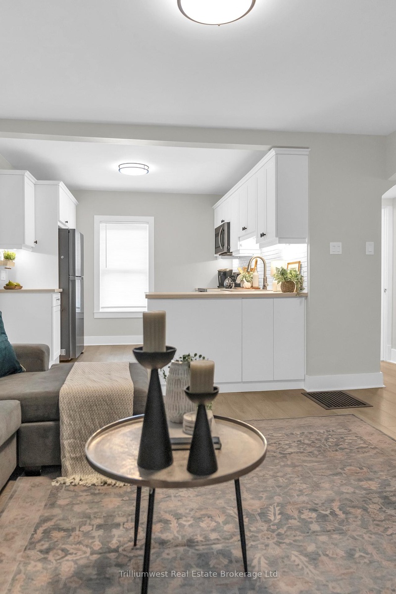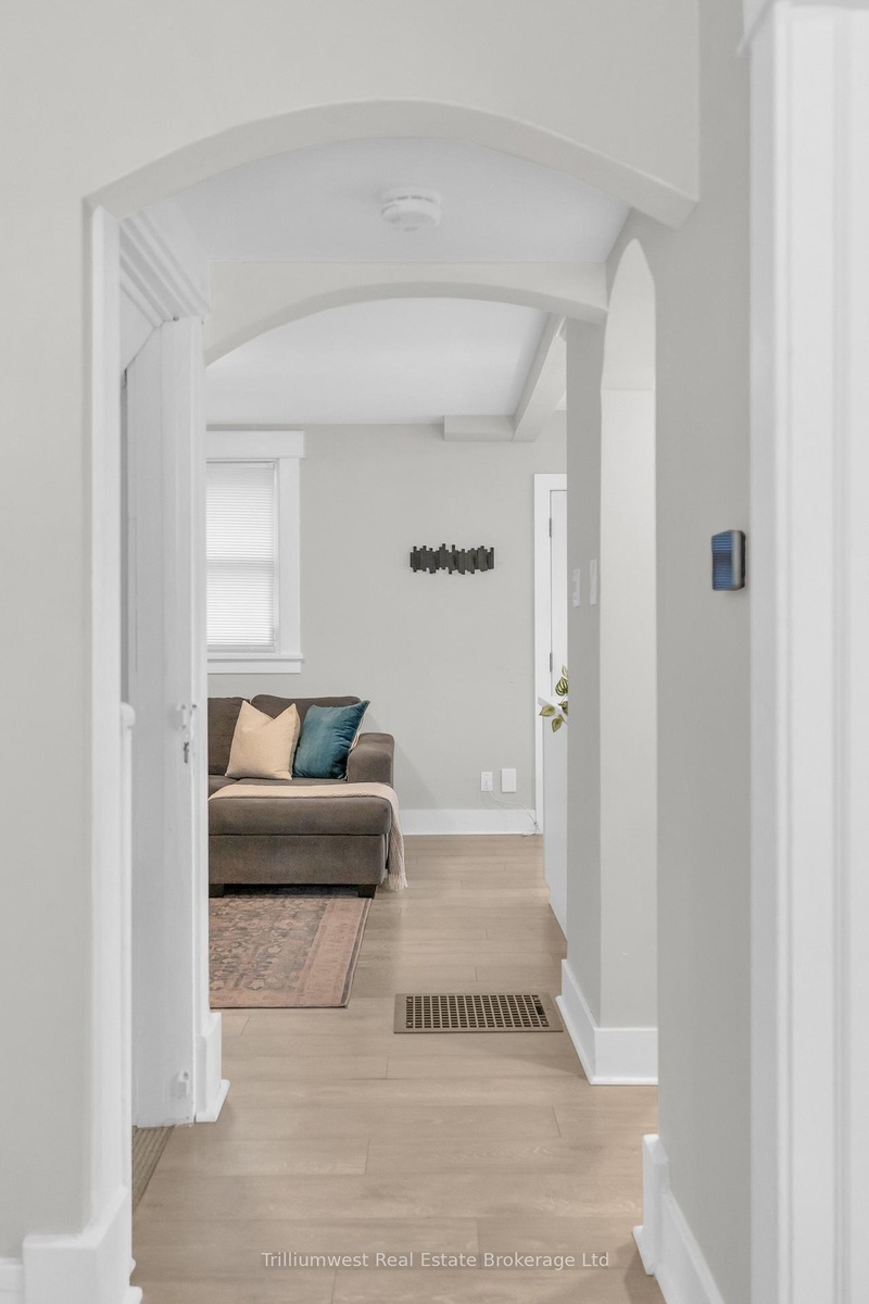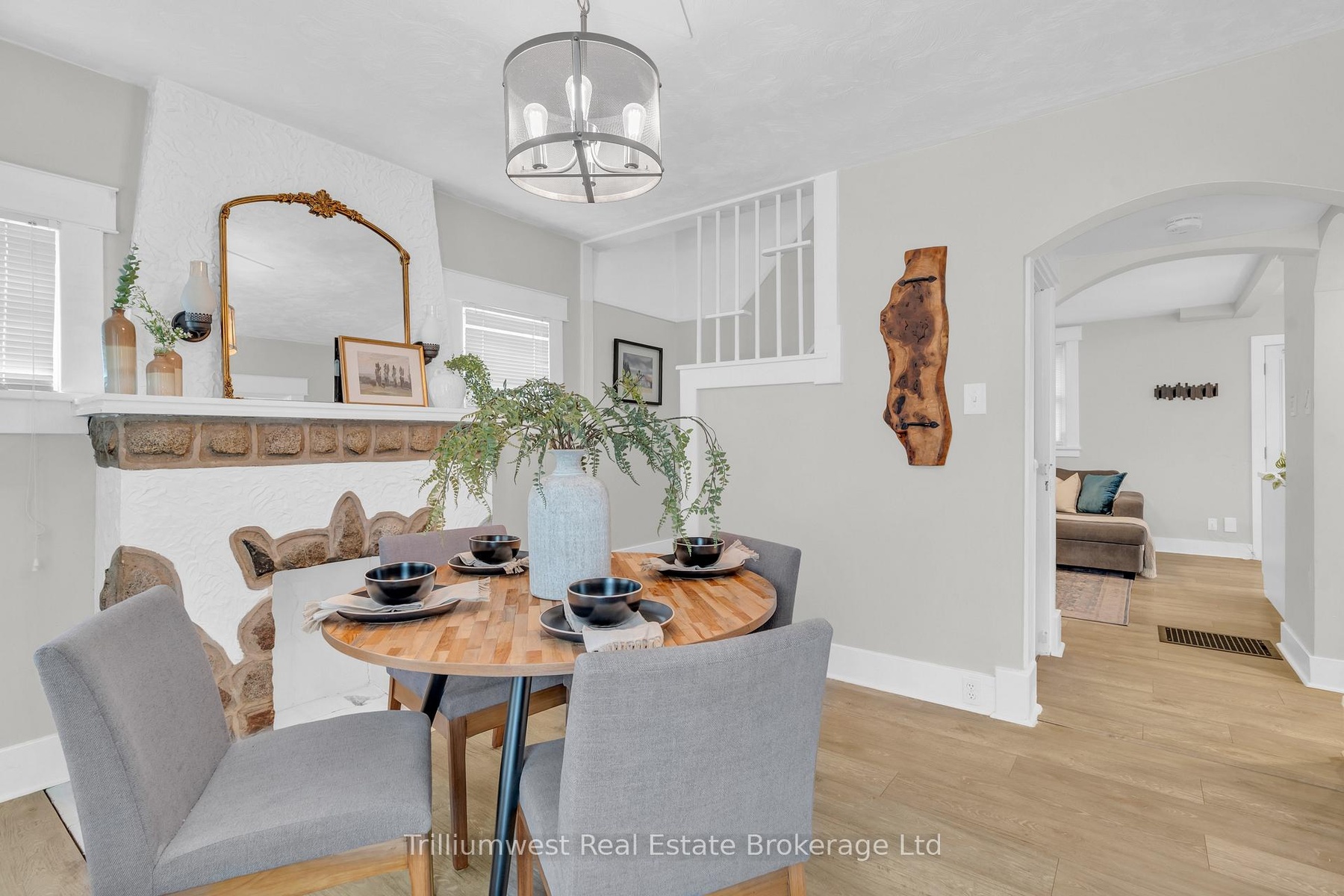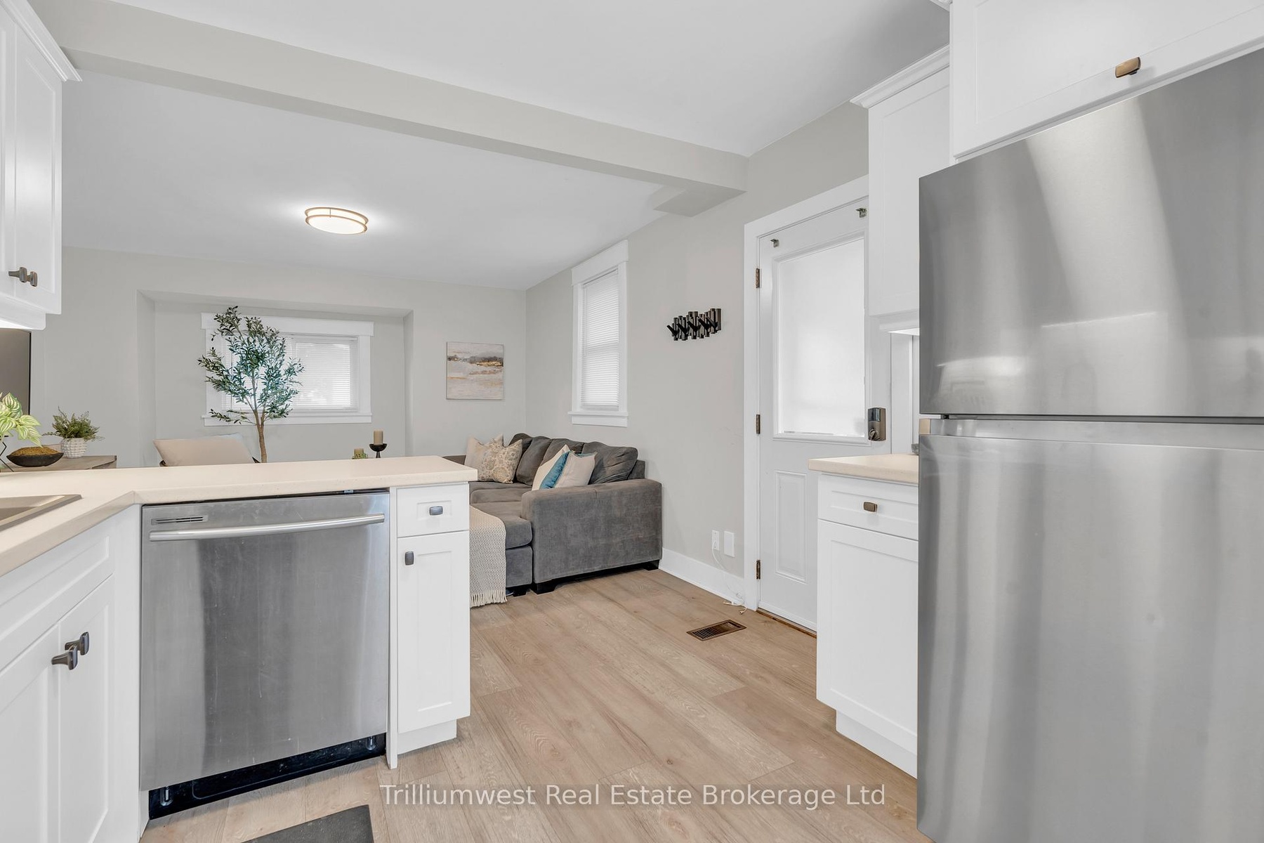 This beautifully updated cottage-style home in desirable East Galt seamlessly blends timeless character with contemporary finishes. The inviting exterior showcases modern stucco paired with expertly crafted stonework, setting the tone for what awaits inside. Step onto the spacious covered front porch and enter a home where every detail has been thoughtfully updated. The stunning fireplace in the front room echoes the homes exterior, featuring a unique stucco and stone façade with a vintage electric log insertadding both warmth and charm. This versatile space can serve as a formal dining area or a cozy sitting room. Elegant arched doorways and new laminate flooring lead to an open-concept living room and an updated kitchen complete with white cabinetry, stainless appliances, ample storage, under-cabinet lighting, a built-in fridge, beveled subway tile backsplash, and a Silgranit sink. Just off the kitchen, a new rear deck provides ideal space for outdoor dining and entertaining. The main floor also includes a spacious bedroom with a large window and a stunning modern farmhouse bathroom featuring a wood-accented ceiling, subway tile tub surround with dark grout, and a sleek vanity with an integrated sink. Upstairs, you'll find two additional well-appointed bedrooms with stylish accent walls and ample storage. The basementwith a separate entranceoffers potential for an in-law suite, income property, or extended living space. Situated on a generous 132-foot deep lot, the property offers parking for 8+ vehicles, plus an oversized two-car garage/workshop with electricalperfect for hobbyists or trades. The new fully fenced backyard includes a custom rolling gate, a new deck with privacy screens, and plenty of room for entertaining or play. Additional upgrades include newer windows, furnace, electrical, and plumbing making this home truly move-in ready. Ideally located near parks, trails, schools, and major amenities, this is East Galt living at its finest