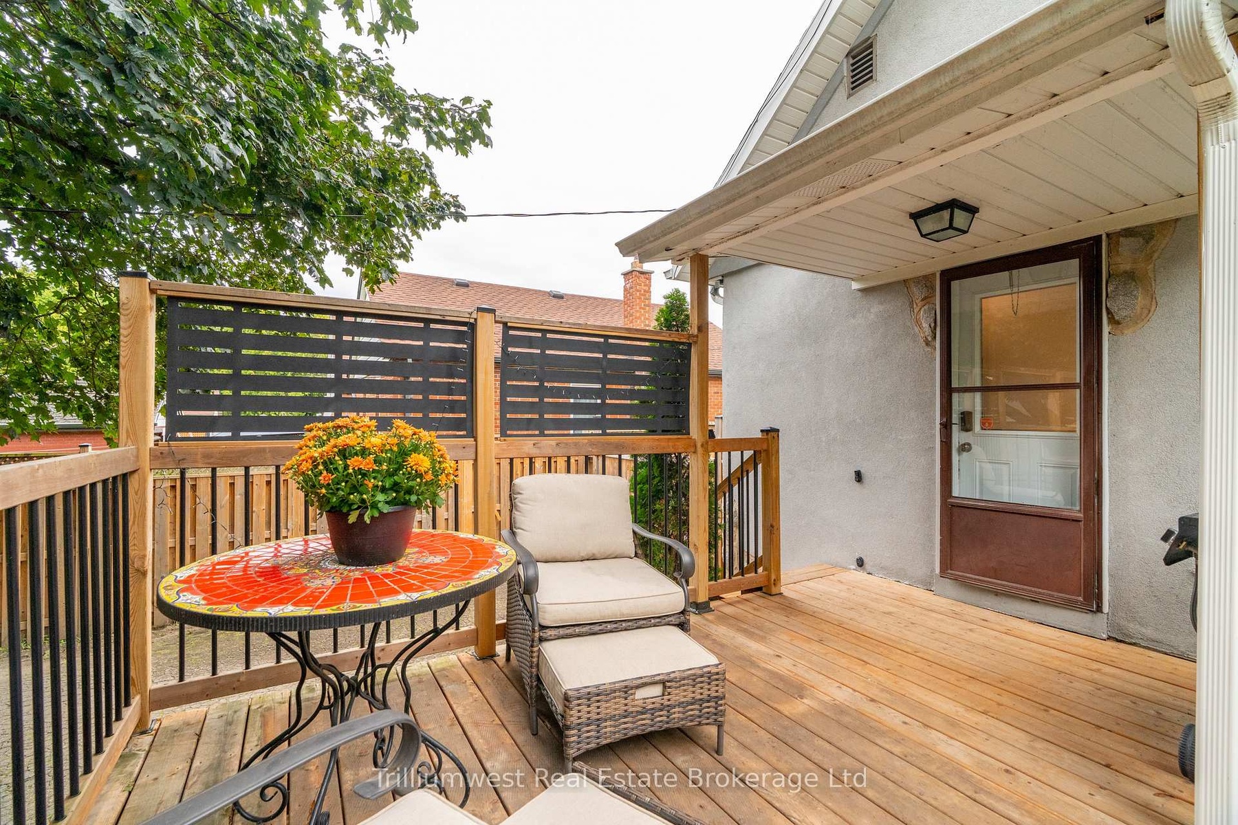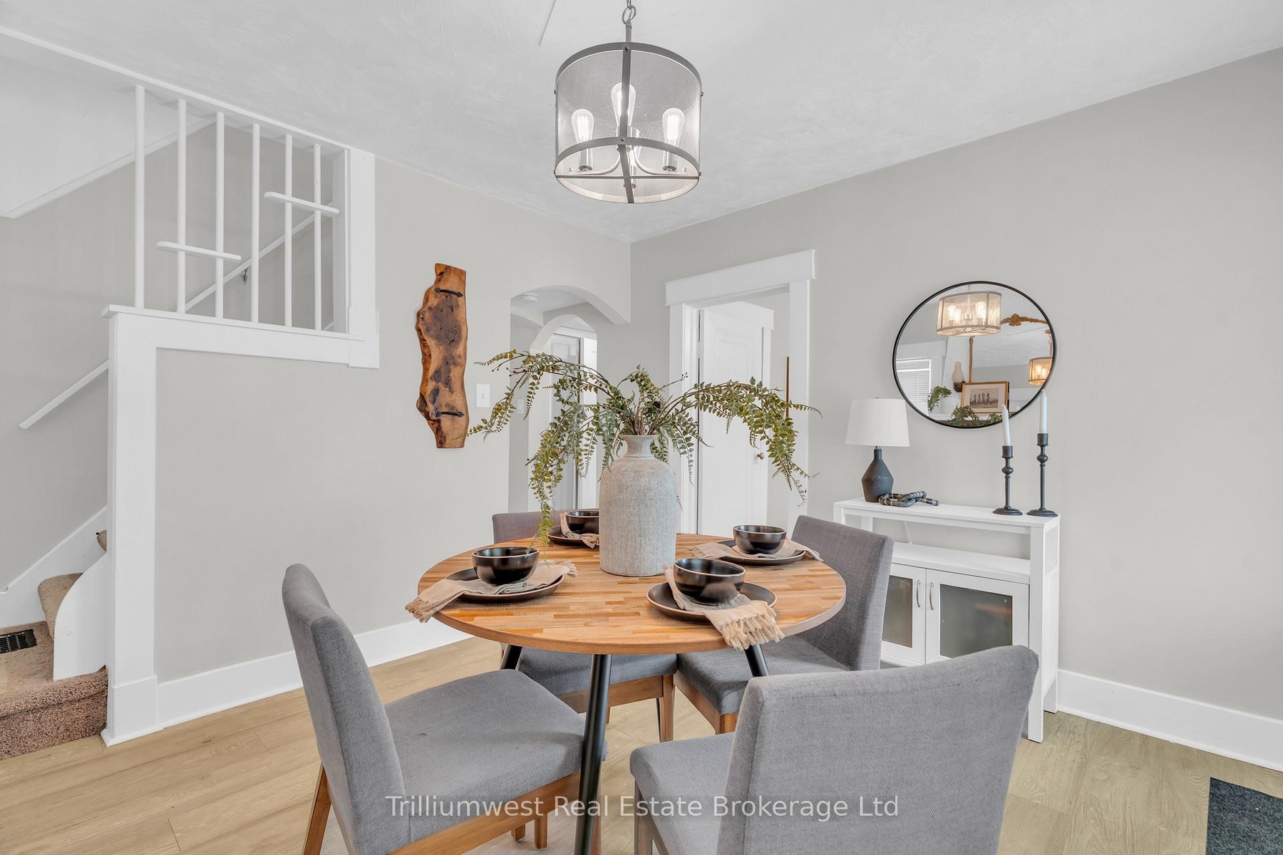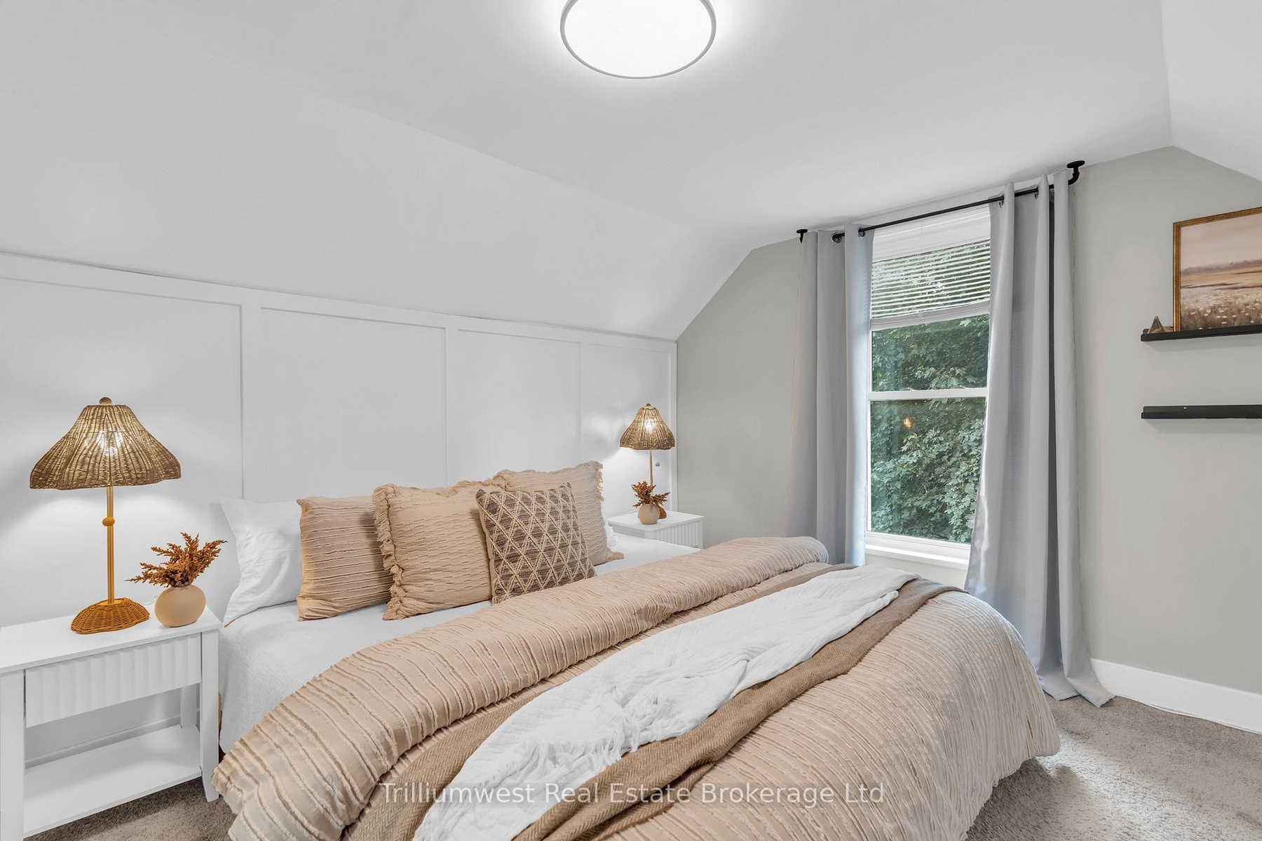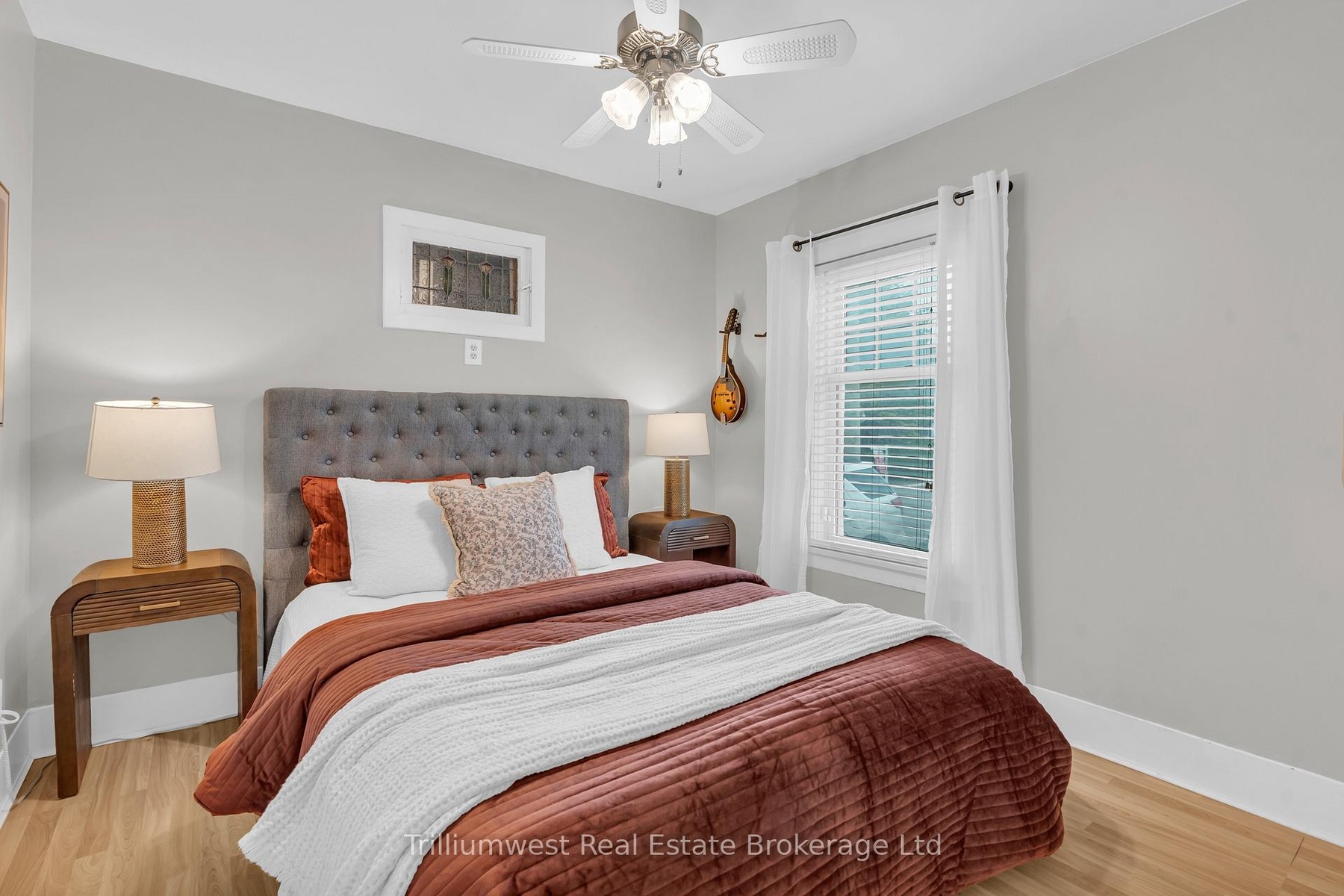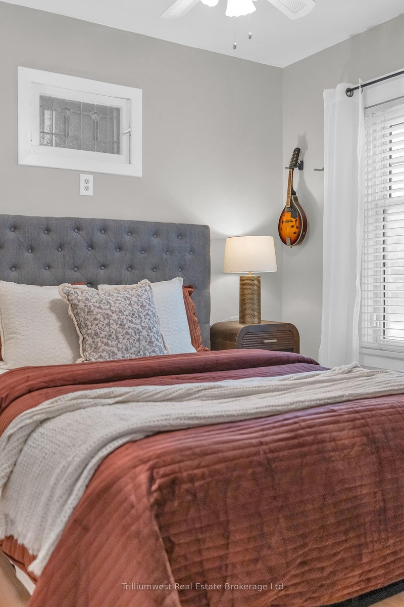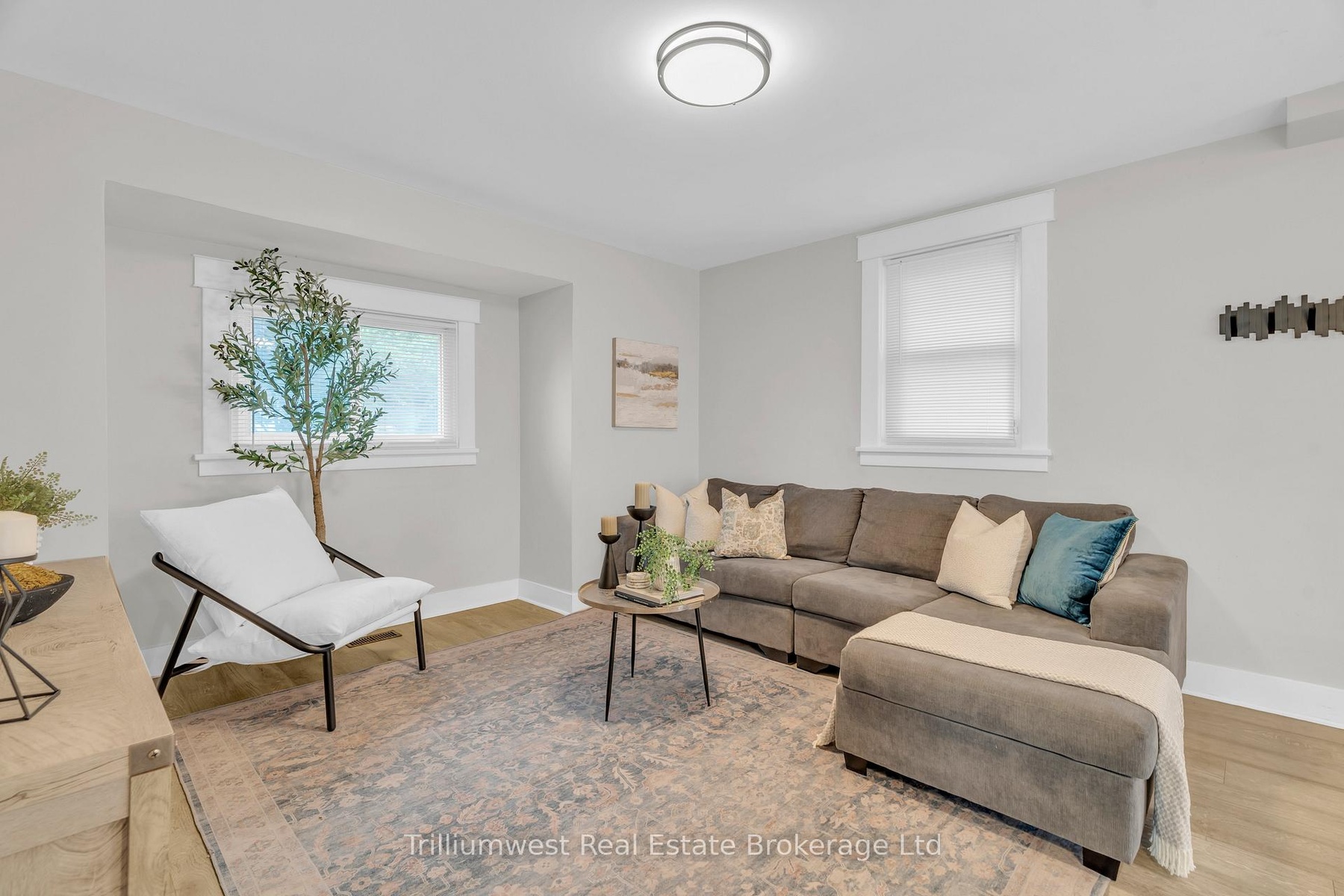 This beautifully updated cottage-style home in desirable East Galt seamlessly blends timeless character with contemporary finishes. The inviting exterior showcases modern stucco paired with expertly crafted stonework, setting the tone for what awaits inside. Step onto the spacious covered front porch and enter a home where every detail has been thoughtfully updated. The stunning fireplace in the front room echoes the homes exterior, featuring a unique stucco and stone façade with a vintage electric log insertadding both warmth and charm. This versatile space can serve as a formal dining area or a cozy sitting room. Elegant arched doorways and new laminate flooring lead to an open-concept living room and an updated kitchen complete with white cabinetry, stainless appliances, ample storage, under-cabinet lighting, a built-in fridge, beveled subway tile backsplash, and a Silgranit sink. Just off the kitchen, a new rear deck provides ideal space for outdoor dining and entertaining. The main floor also includes a spacious bedroom with a large window and a stunning modern farmhouse bathroom featuring a wood-accented ceiling, subway tile tub surround with dark grout, and a sleek vanity with an integrated sink. Upstairs, you'll find two additional well-appointed bedrooms with stylish accent walls and ample storage. The basementwith a separate entranceoffers potential for an in-law suite, income property, or extended living space. Situated on a generous 132-foot deep lot, the property offers parking for 8+ vehicles, plus an oversized two-car garage/workshop with electricalperfect for hobbyists or trades. The new fully fenced backyard includes a custom rolling gate, a new deck with privacy screens, and plenty of room for entertaining or play. Additional upgrades include newer windows, furnace, electrical, and plumbing making this home truly move-in ready. Ideally located near parks, trails, schools, and major amenities, this is East Galt living at its finest