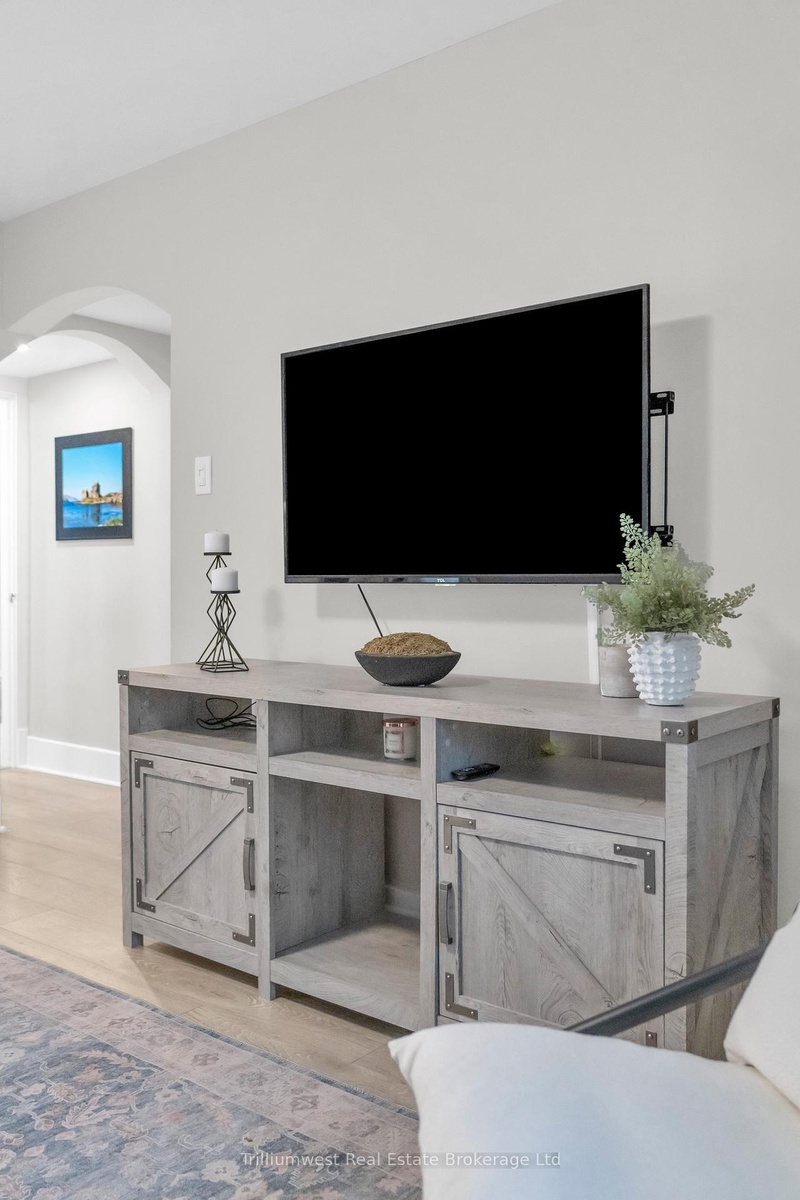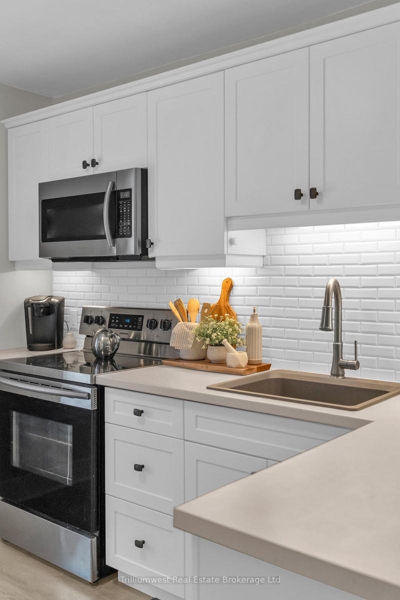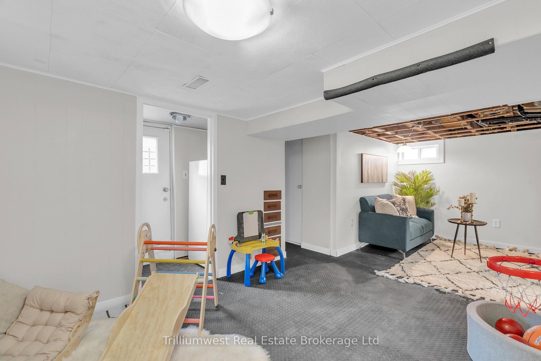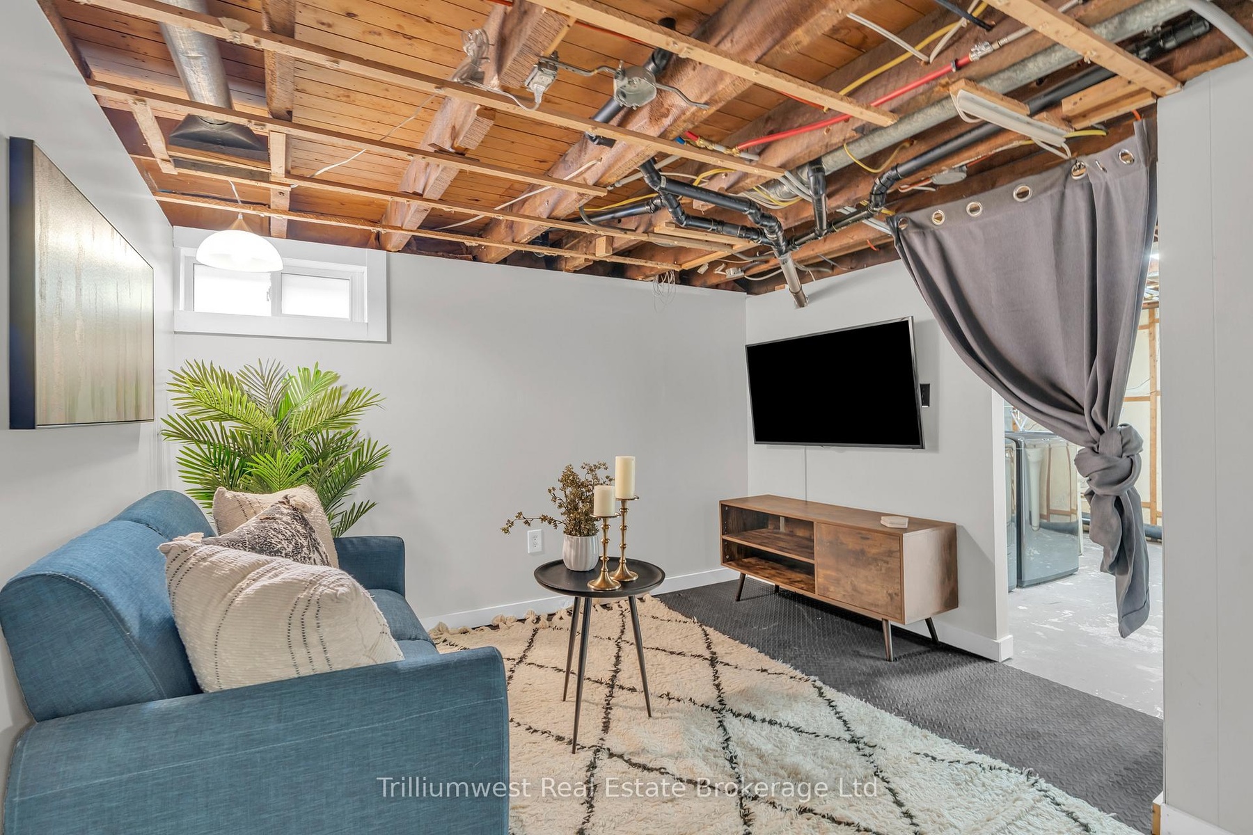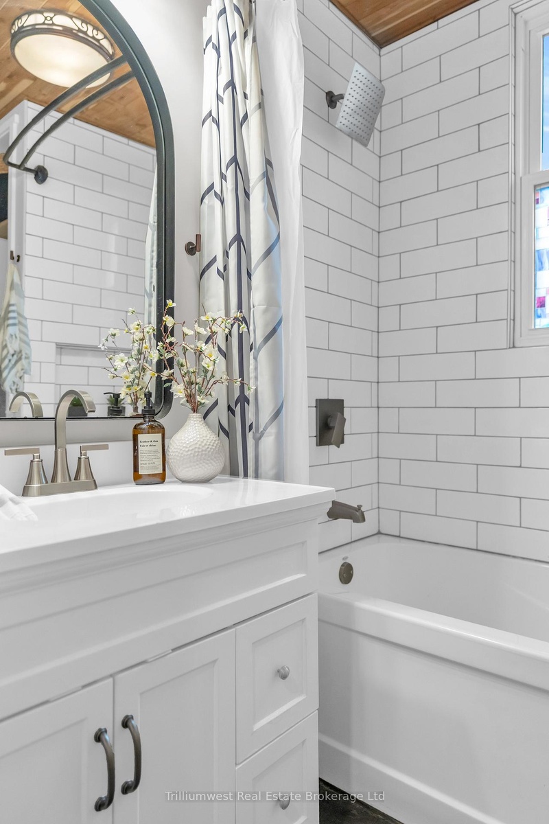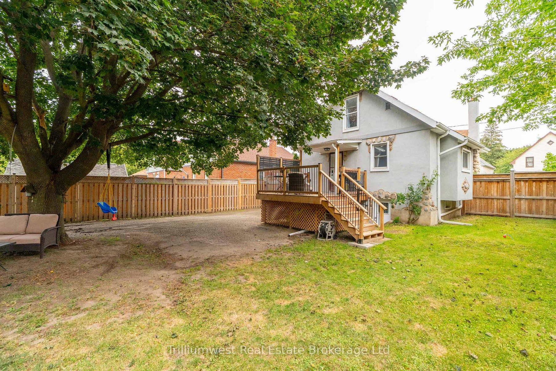 This beautifully updated cottage-style home in desirable East Galt seamlessly blends timeless character with contemporary finishes. The inviting exterior showcases modern stucco paired with expertly crafted stonework, setting the tone for what awaits inside. Step onto the spacious covered front porch and enter a home where every detail has been thoughtfully updated. The stunning fireplace in the front room echoes the homes exterior, featuring a unique stucco and stone façade with a vintage electric log insertadding both warmth and charm. This versatile space can serve as a formal dining area or a cozy sitting room. Elegant arched doorways and new laminate flooring lead to an open-concept living room and an updated kitchen complete with white cabinetry, stainless appliances, ample storage, under-cabinet lighting, a built-in fridge, beveled subway tile backsplash, and a Silgranit sink. Just off the kitchen, a new rear deck provides ideal space for outdoor dining and entertaining. The main floor also includes a spacious bedroom with a large window and a stunning modern farmhouse bathroom featuring a wood-accented ceiling, subway tile tub surround with dark grout, and a sleek vanity with an integrated sink. Upstairs, you'll find two additional well-appointed bedrooms with stylish accent walls and ample storage. The basementwith a separate entranceoffers potential for an in-law suite, income property, or extended living space. Situated on a generous 132-foot deep lot, the property offers parking for 8+ vehicles, plus an oversized two-car garage/workshop with electricalperfect for hobbyists or trades. The new fully fenced backyard includes a custom rolling gate, a new deck with privacy screens, and plenty of room for entertaining or play. Additional upgrades include newer windows, furnace, electrical, and plumbing making this home truly move-in ready. Ideally located near parks, trails, schools, and major amenities, this is East Galt living at its finest