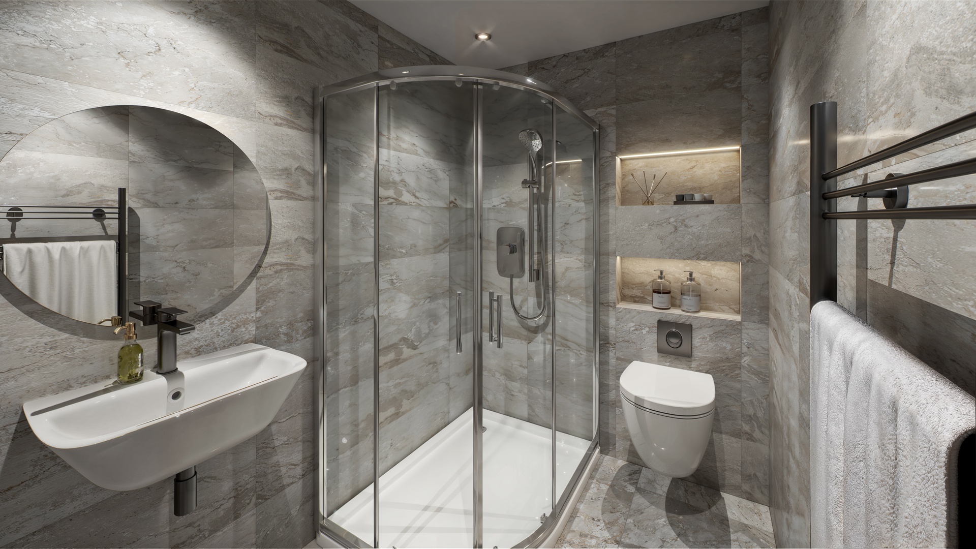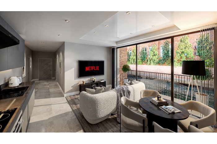 Interiors are finished with Porcelanosa tiled bathrooms, Lamona integrated appliances, and matte black fittings that provide a sleek, contemporary edge. Many apartments benefit from private balconies offering serene riverfront views, while all residents have access to the communal rooftop terrace and riverside courtyard garden.