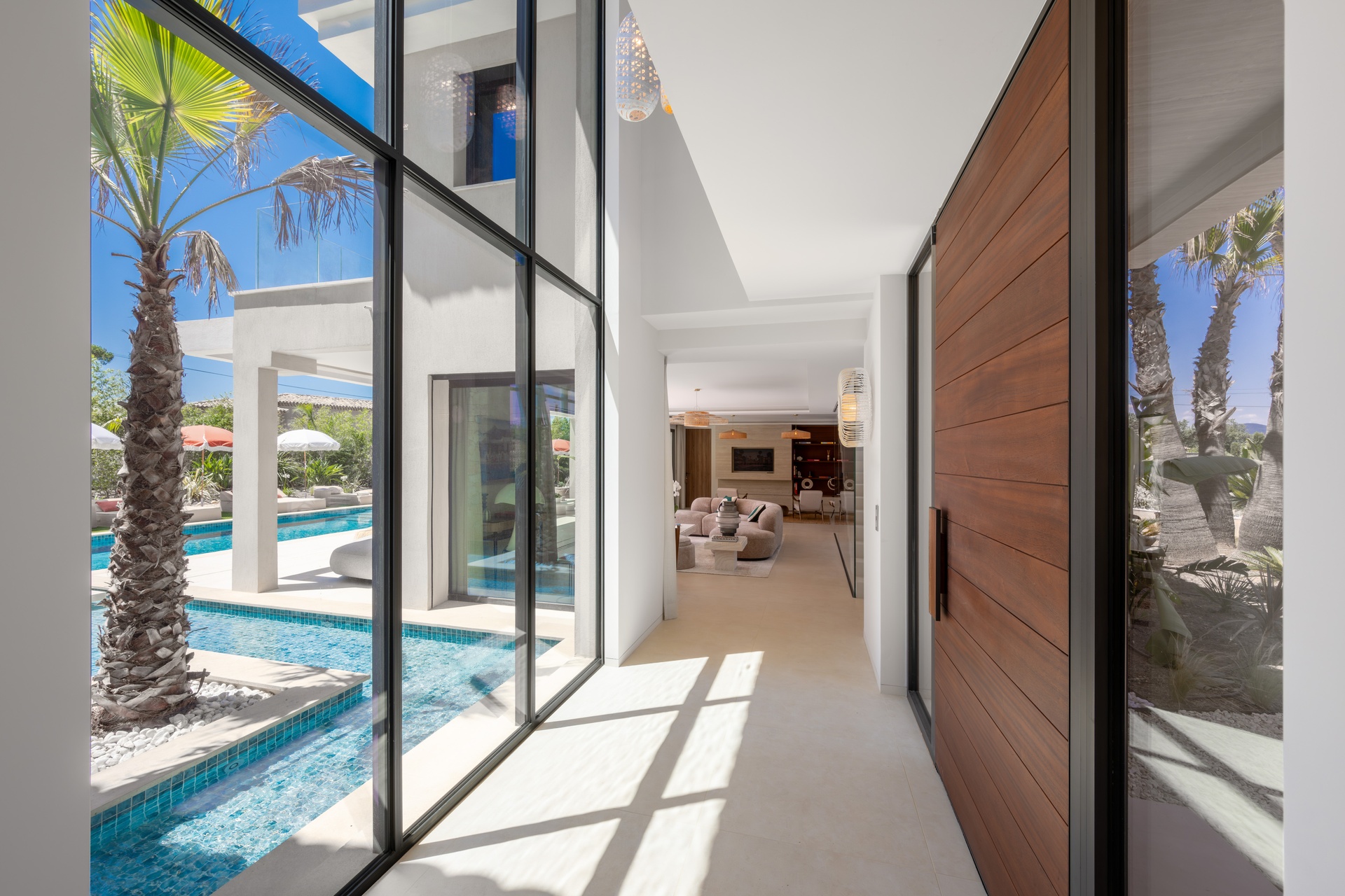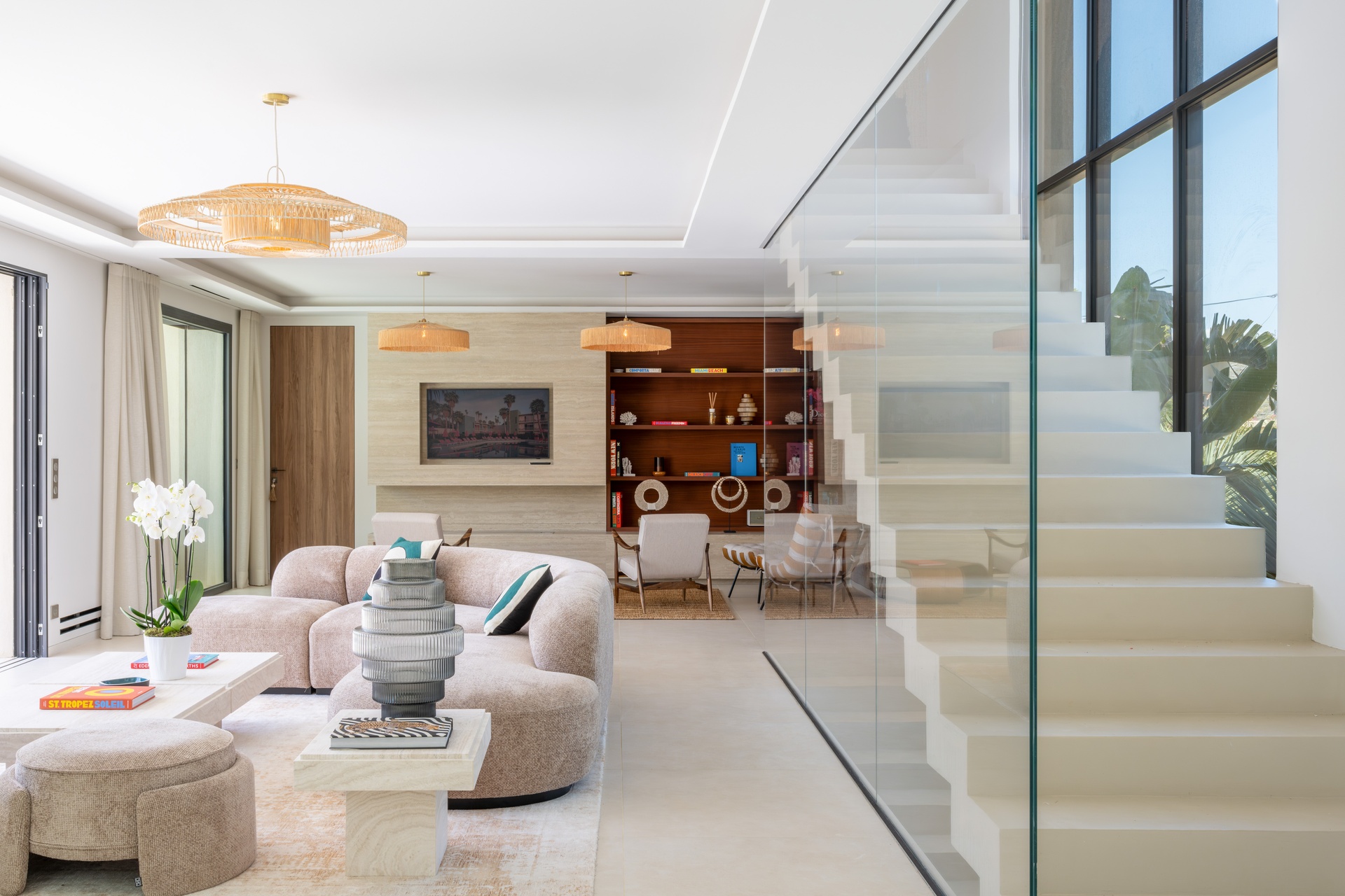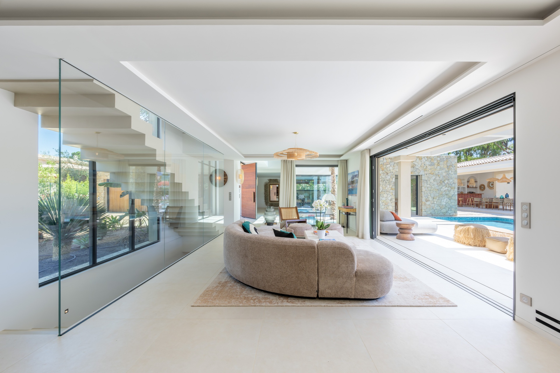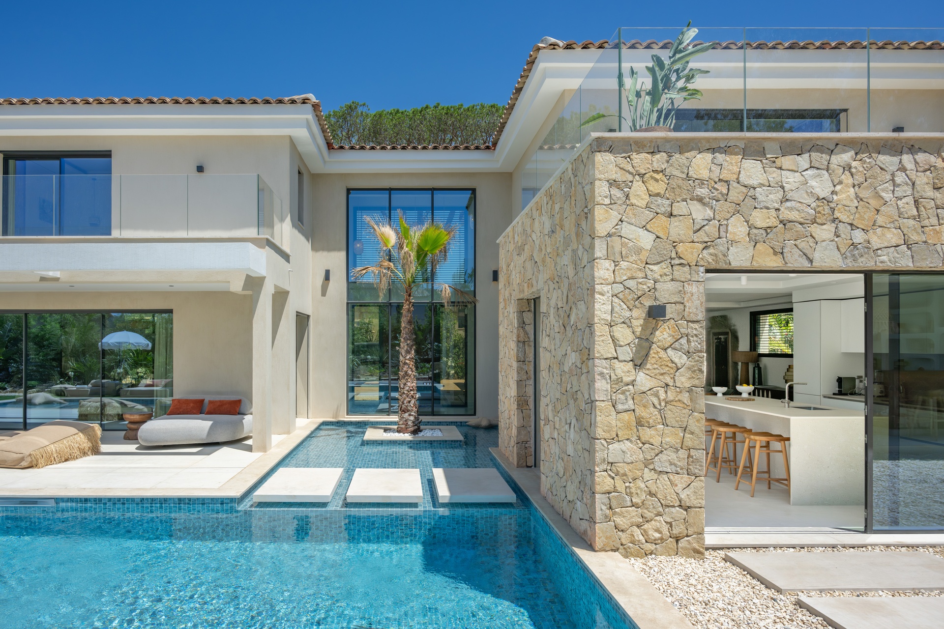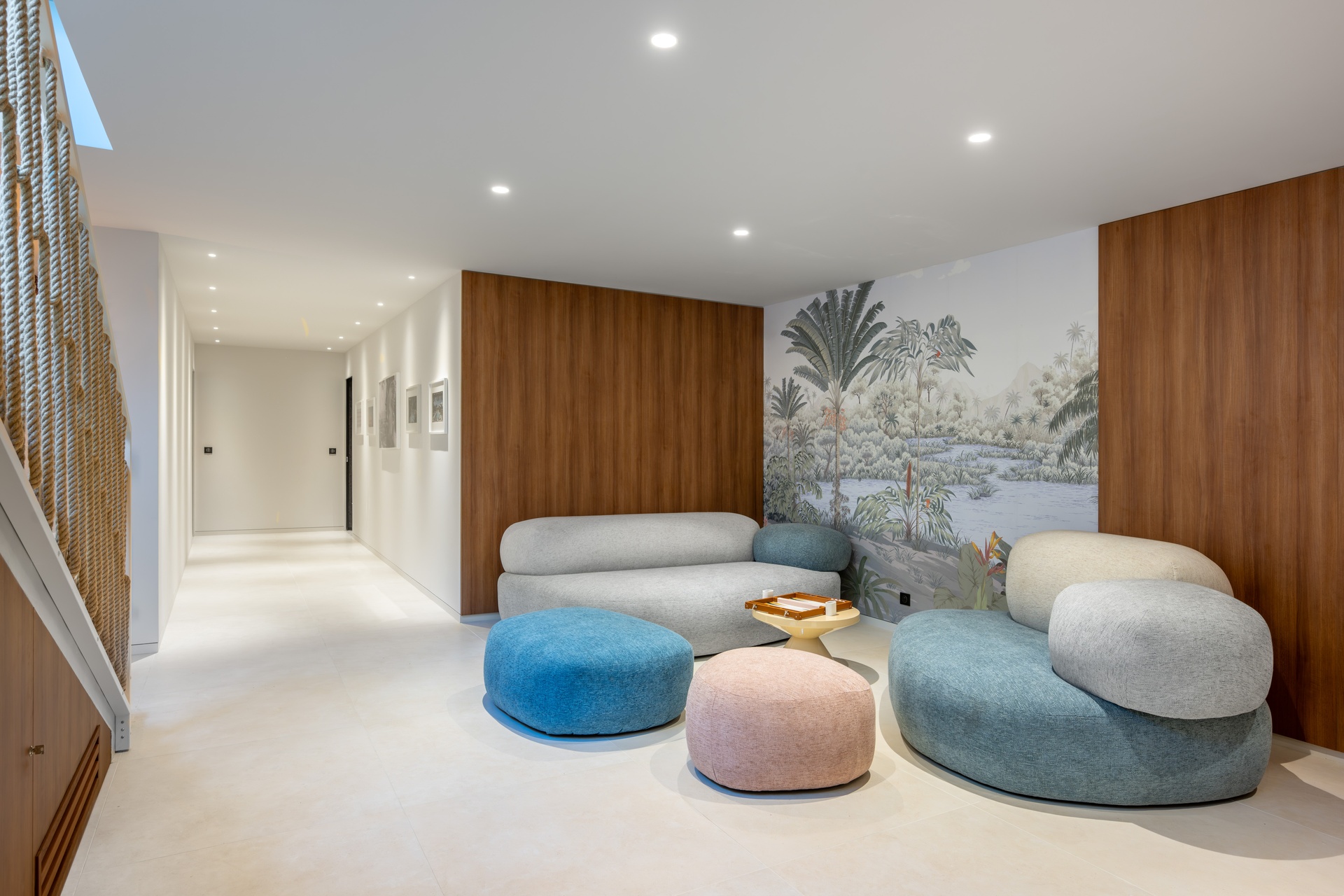 From the moment you enter, the architecture is reminiscent of a Californian villa, with its majestic palm trees and clean lines. Inside, the art-deco style reigns supreme, creating a warm, elegant ambience. The vast living room, adorned with carefully selected furnishings, opens onto the outside, where indoor-outdoor living takes on its full meaning thanks to the large picture windows. Upstairs, the bedrooms have terraces with uninterrupted views over the heated swimming pool. In the basement, a private cinema offers unrivalled entertainment.