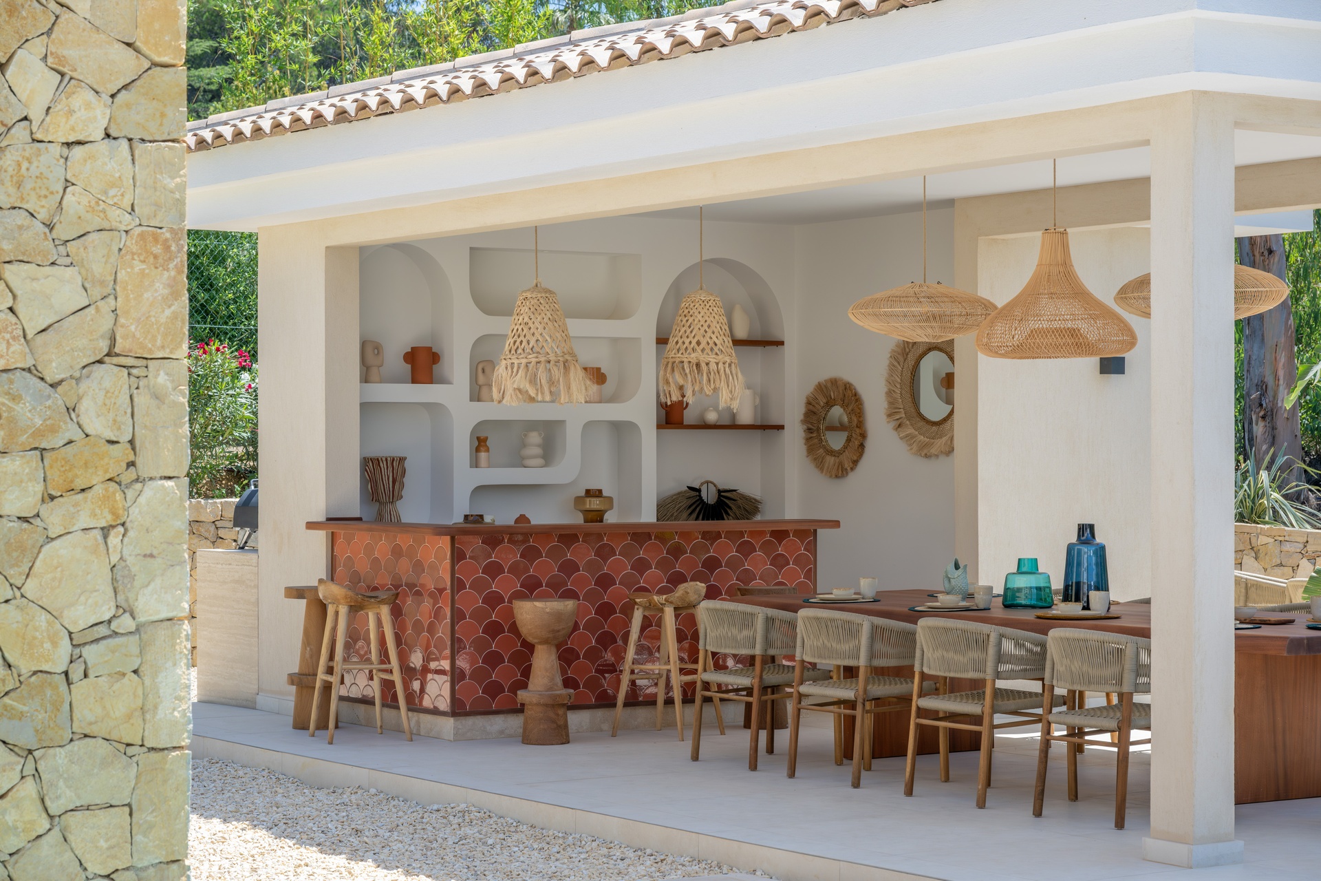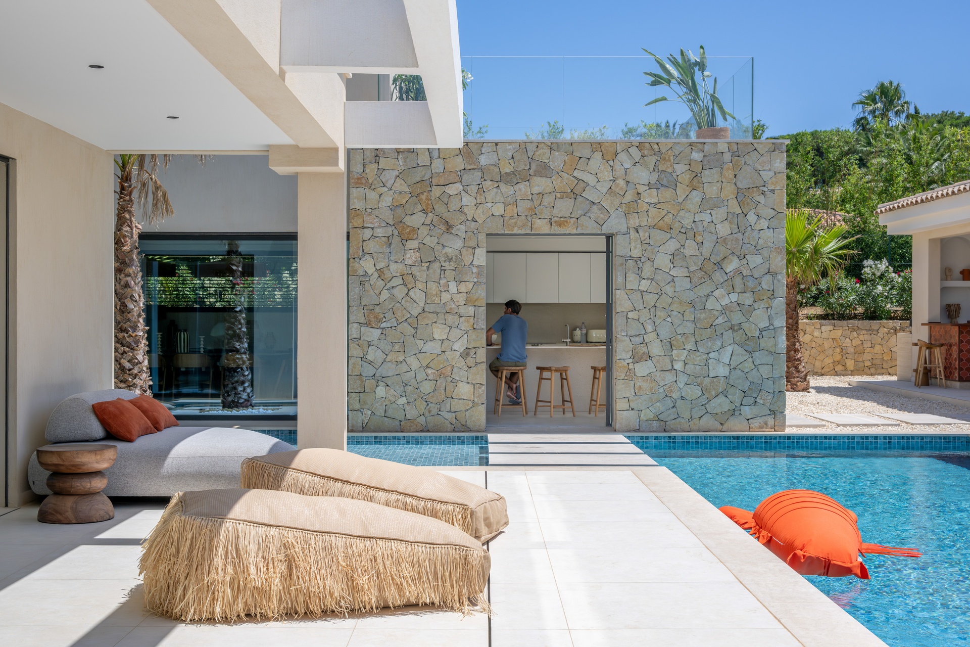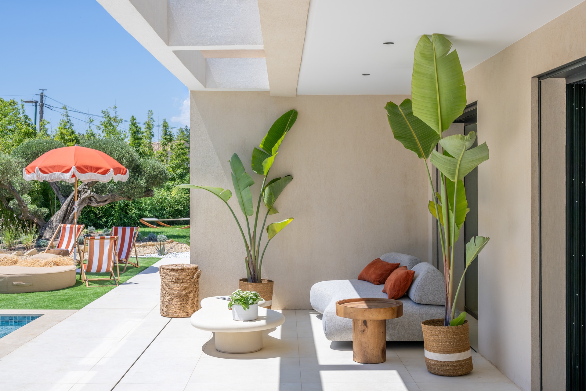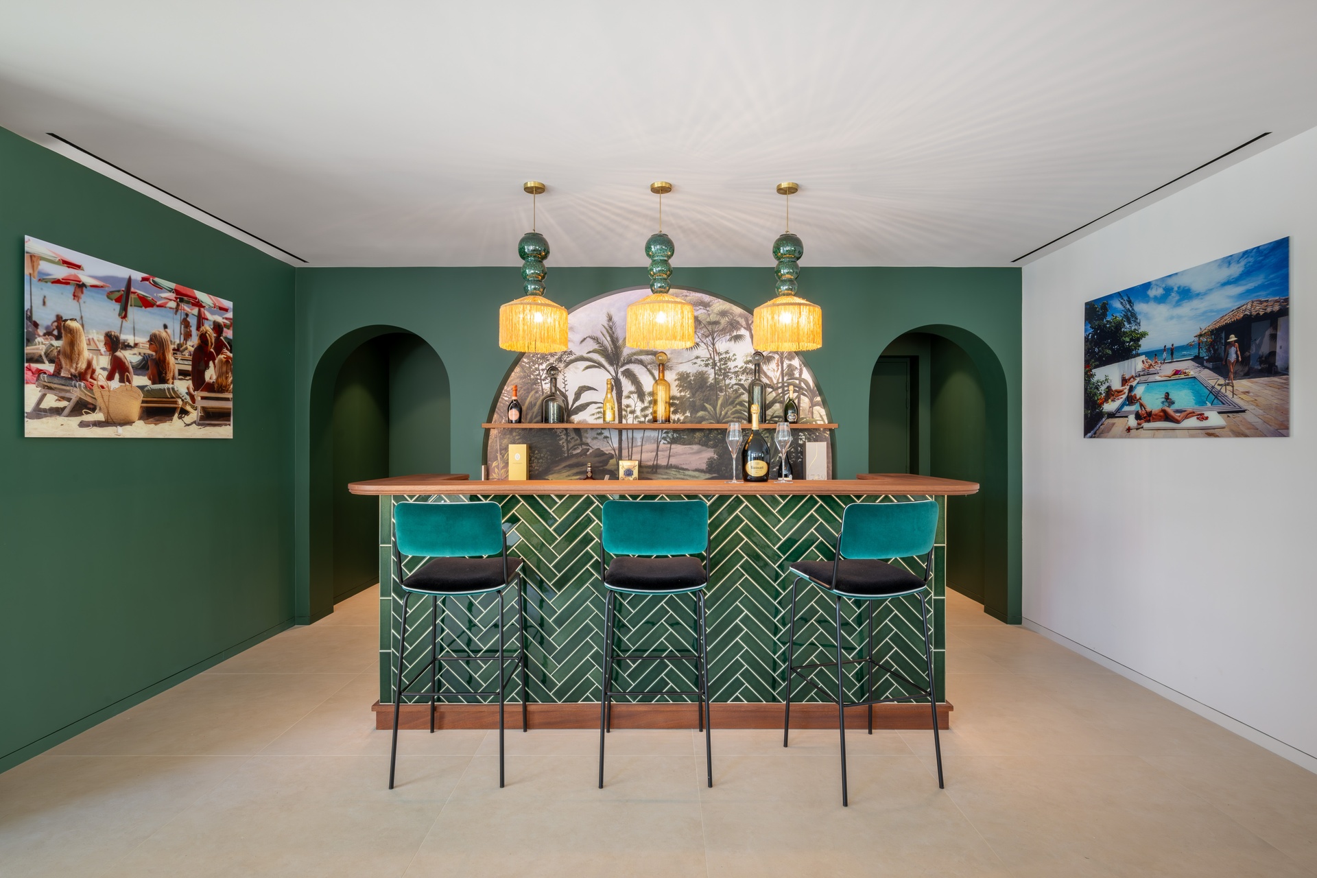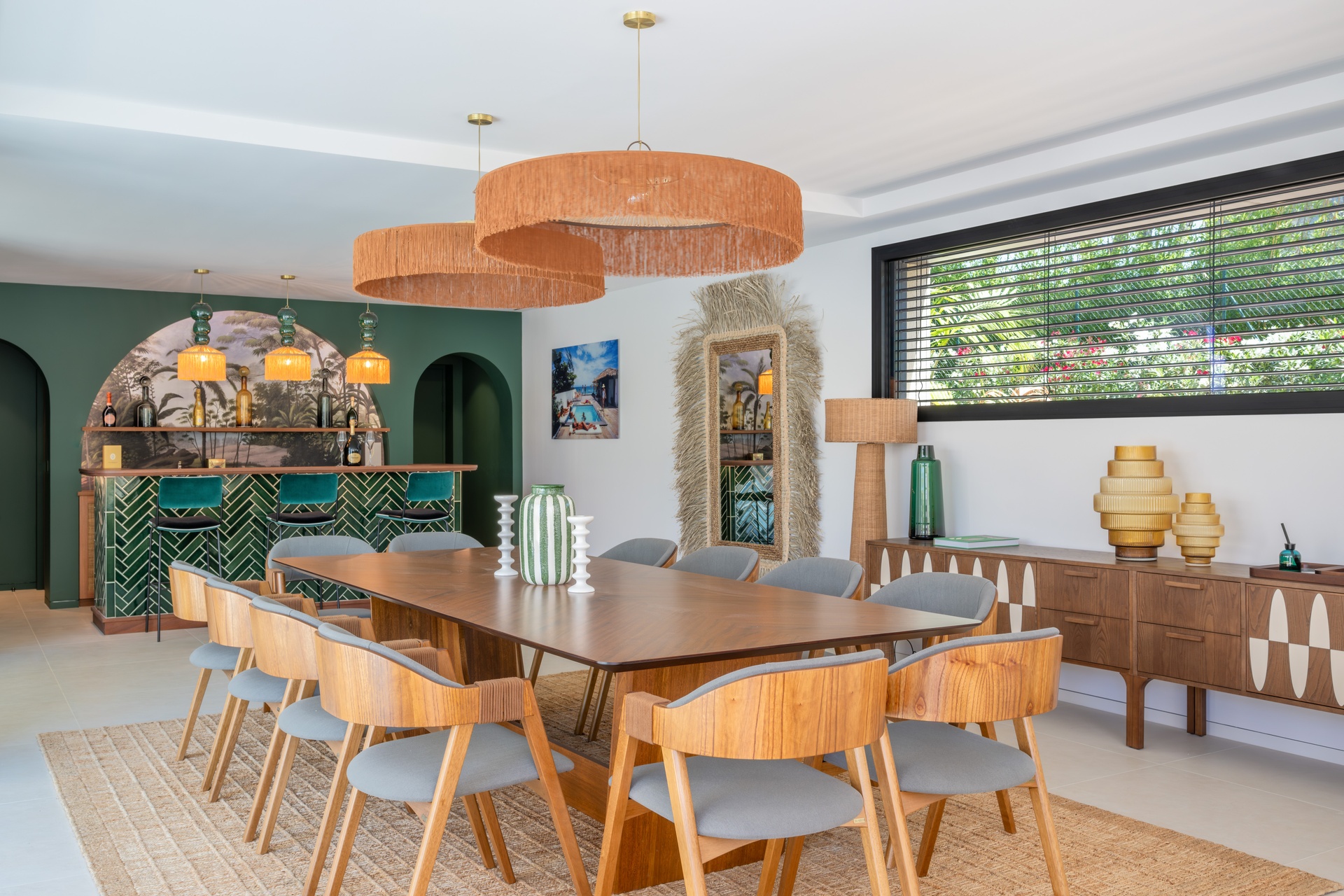 The pool area, a veritable oasis of relaxation, is complemented by a pétanque court. The pool house boasts a bar and a beautiful sheltered table that can accommodate guests from breakfast to dinner. Here, too, the atmosphere is personalized. The decor is organic, and the art-deco style blends perfectly with the Bohemian chic atmosphere of Saint-Tropez. The atmosphere is so seaside that it might make you hesitate before heading to the beaches of Pampelonne.