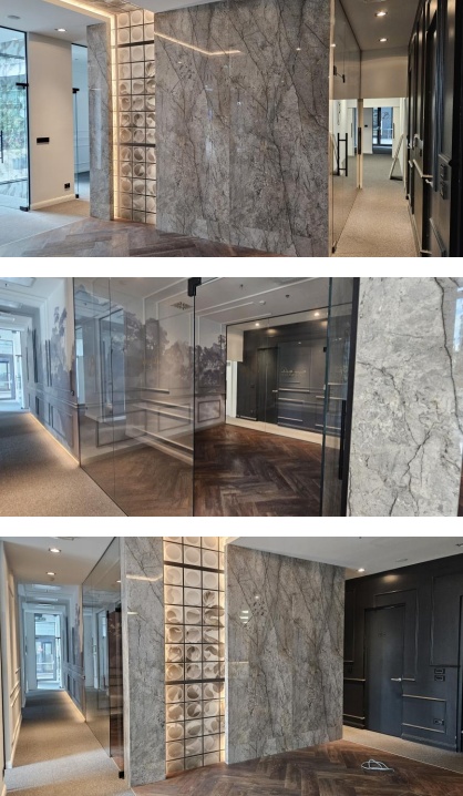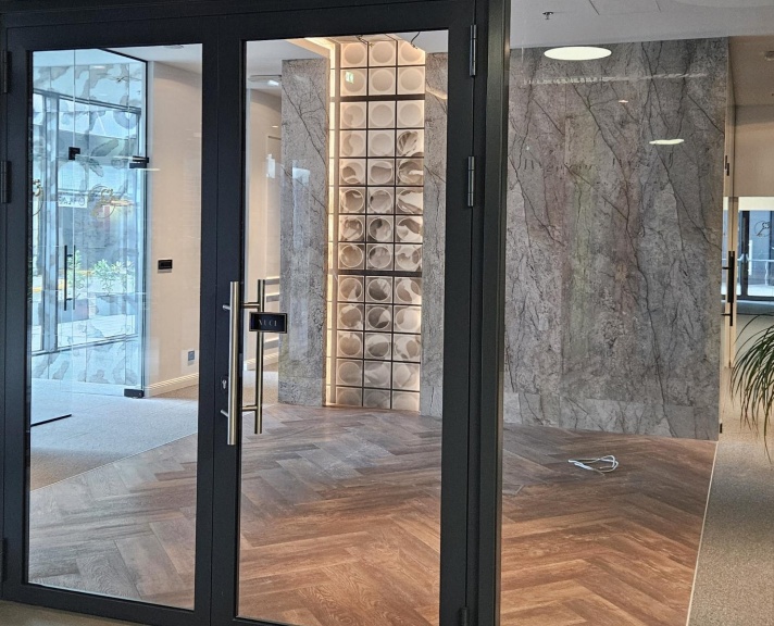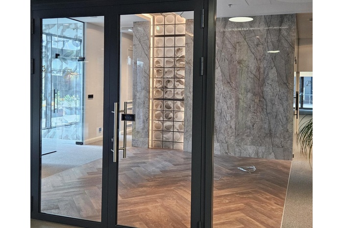 Located on the ground floor of a representative new building, the space stands out with its elegant glass façade that provides an abundance of natural light and a distinctive, modern appearance.