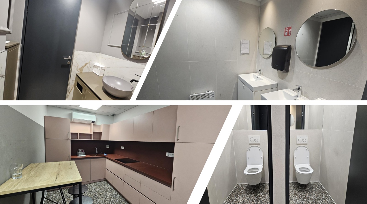 The office is contemporary and functionally designed, consisting of an open-plan workspace that can be adapted to the tenant’s needs, separate men’s and women’s restrooms, and a kitchen area. High-quality materials, clean lines, and bright tones create a pleasant and professional working atmosphere.