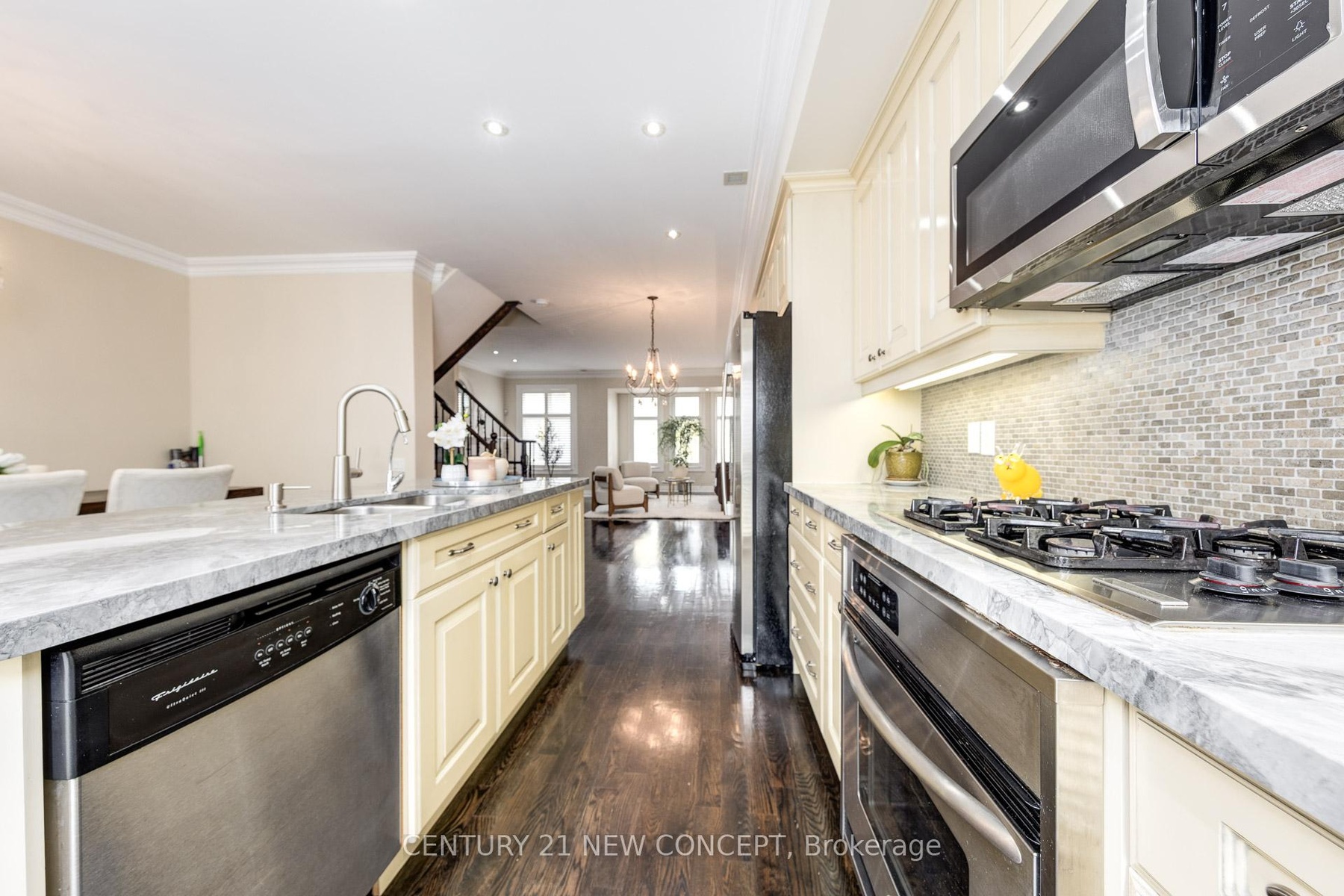 Experience luxury living in this rare freehold 4-bedroom executive townhouse with over 2100 sq.ft plus a finished basement. Bright open-concept layout with walkout to a large deck-ideal for barbecues and outdoor dining. Modern custom kitchen with built-in stainless steel appliances and premium finishes.Main floor bedroom with 3-piece bath, perfect for guests or a home office. Spacious double garage with direct access. Finished lower level with 4-piece bath and a private rooftop deck for relaxation or entertaining.Steps to waterfront trails, parks, transit, and just minutes to downtown and airports. A rare opportunity to own luxury living in a sought-after lakeside community!
