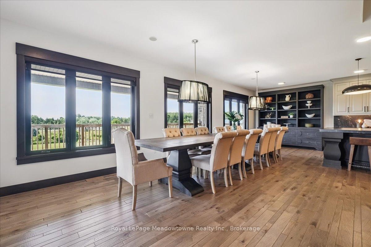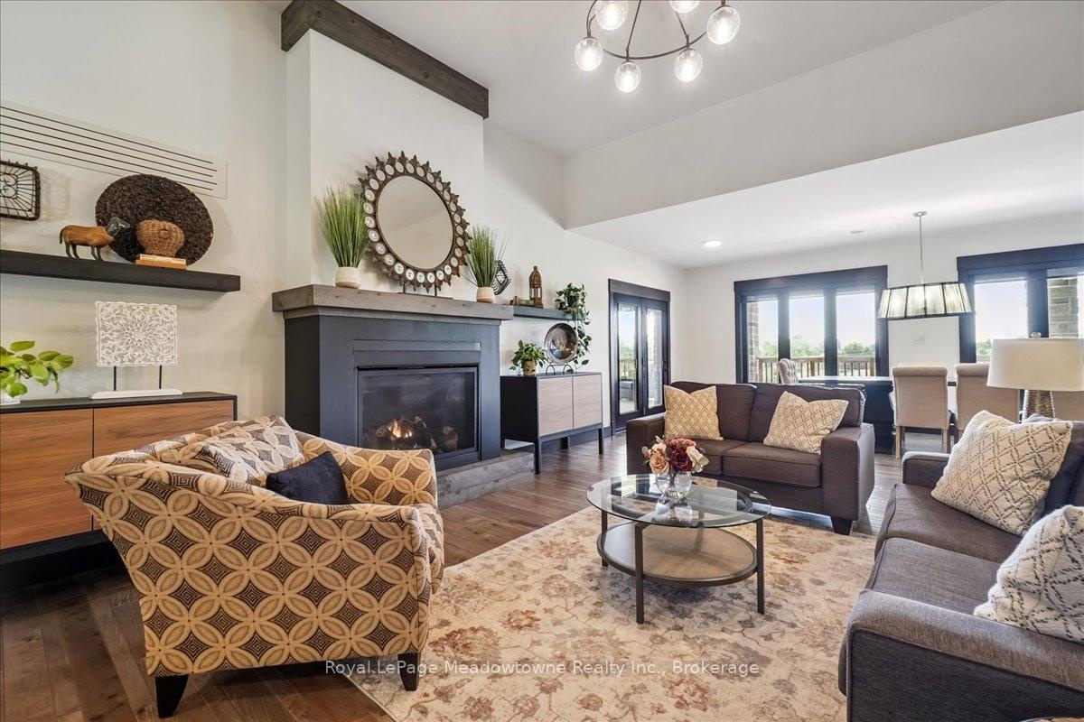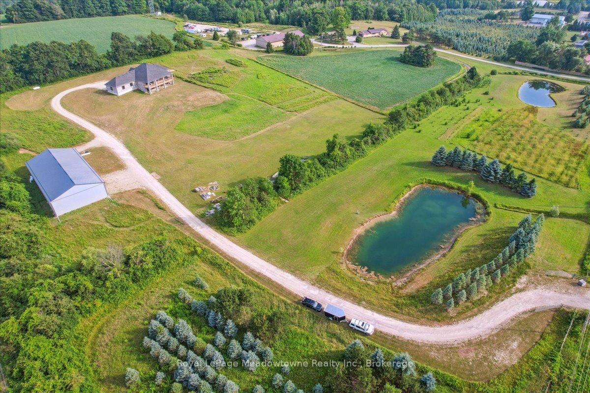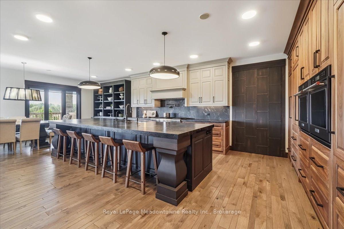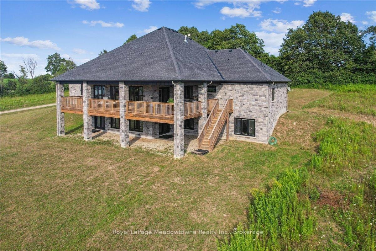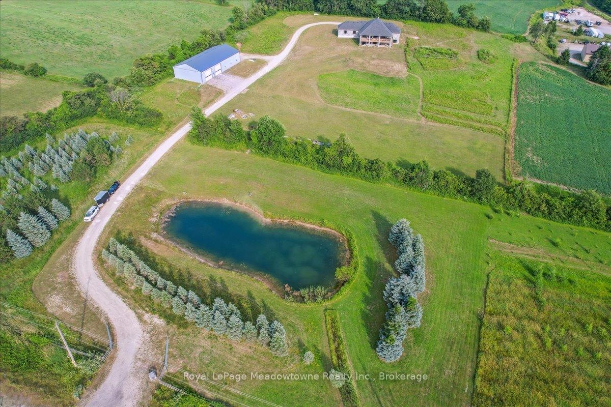 This custom-built country bungalow, where craftsmanship meets comfort is an exceptional family home nestled in the rolling hills of Erin. Set on just under 9 acres of gently sloping lawns, a spring-fed pond, and endless outdoor beauty. From the moment you step inside, you'll feel the care and quality that went into this cabinetmakers personal residence. Striking details, soaring ceilings, and an open-concept layout set the stage, while over 200+ custom-built storage drawers keep family life beautifully organized. The heart of the home is a chefs dream kitchen, featuring solid wood cabinetry, high-end appliances, a massive quartz island with breakfast bar, and endless cupboard space. Gather in the great room around the fireplace, or share meals in the dining room as you soak in panoramic views of the countryside through the windows. Step outside to the elevated, covered balcony and catch unforgettable sunsets, your new favourite place to unwind. The main-floor primary suite is your own private retreat, with a coffered ceiling, spa-inspired ensuite, and a walk-in closet with built-ins that maximize both function and style. Two additional bedrooms offer the same high-quality finishes and thoughtful design. Head downstairs to discover the ultimate entertainment zone, a fully finished walk-out lower level with a large wet bar, cozy fireplace, theatre room, home office, and even a sauna. And then there's the workshop, an incredible 5,000 sq. ft. heated building with three 16x16 insulated doors, ideal for car enthusiasts, hobbyists, or entrepreneurs. Add in a 3-car garage, geo-thermal heating and cooling, in-floor heating throughout the basement and shop, fire pit & your family has found a forever home. This property doesn't just offer a place to live, it offers a lifestyle. From peaceful birdwatching by the pond to hosting unforgettable gatherings, this is country living reimagined for the modern family. This is where your family story continues.
