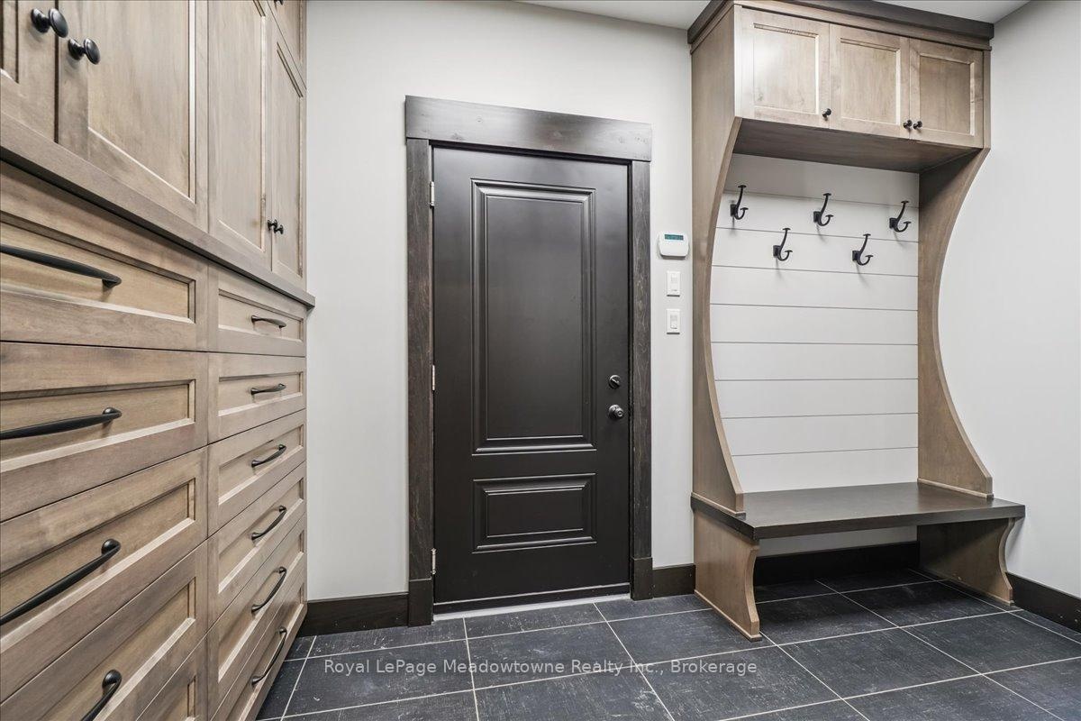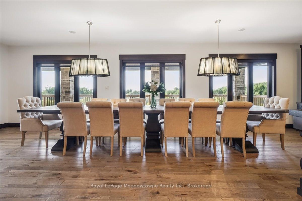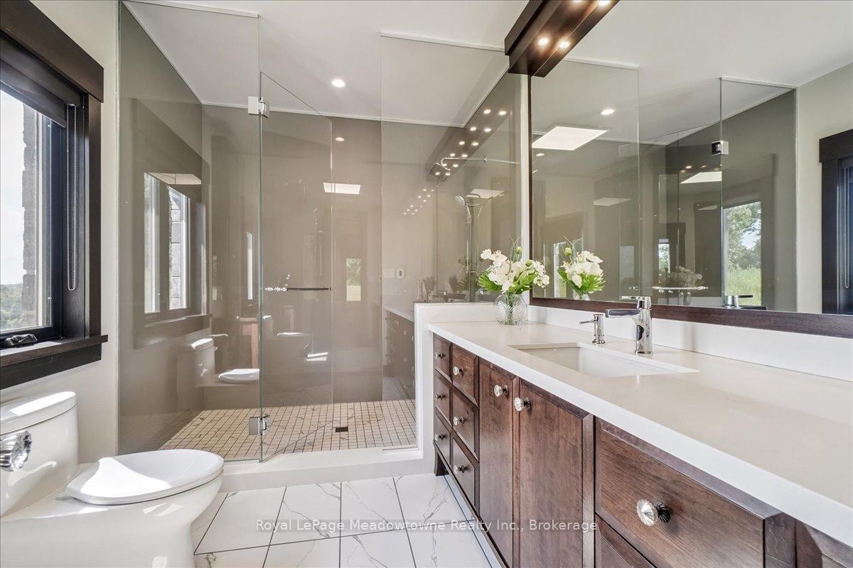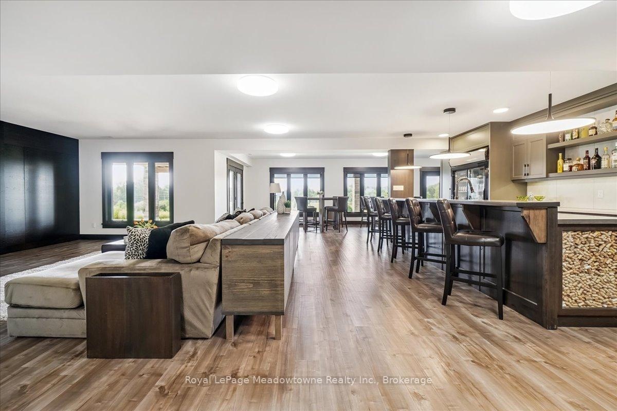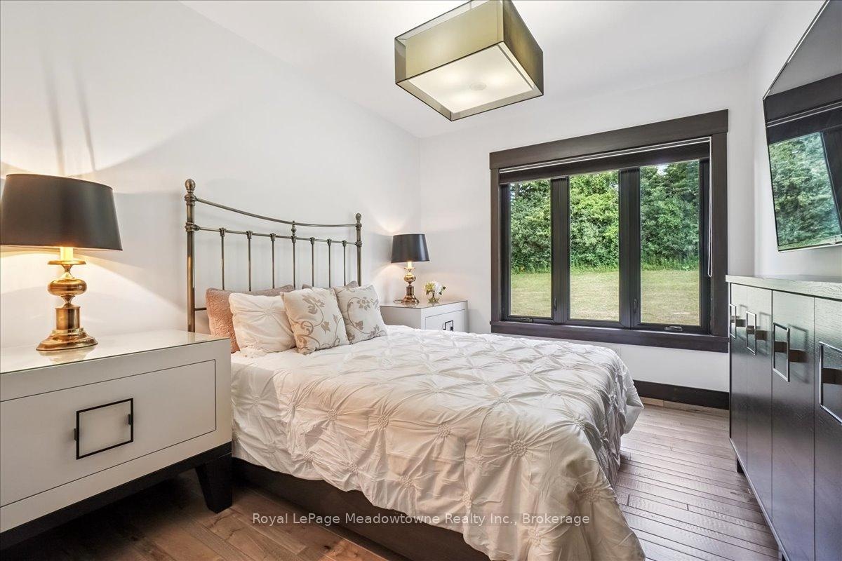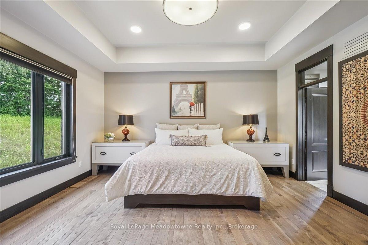 This custom-built country bungalow, where craftsmanship meets comfort is an exceptional family home nestled in the rolling hills of Erin. Set on just under 9 acres of gently sloping lawns, a spring-fed pond, and endless outdoor beauty. From the moment you step inside, you'll feel the care and quality that went into this cabinetmakers personal residence. Striking details, soaring ceilings, and an open-concept layout set the stage, while over 200+ custom-built storage drawers keep family life beautifully organized. The heart of the home is a chefs dream kitchen, featuring solid wood cabinetry, high-end appliances, a massive quartz island with breakfast bar, and endless cupboard space. Gather in the great room around the fireplace, or share meals in the dining room as you soak in panoramic views of the countryside through the windows. Step outside to the elevated, covered balcony and catch unforgettable sunsets, your new favourite place to unwind. The main-floor primary suite is your own private retreat, with a coffered ceiling, spa-inspired ensuite, and a walk-in closet with built-ins that maximize both function and style. Two additional bedrooms offer the same high-quality finishes and thoughtful design. Head downstairs to discover the ultimate entertainment zone, a fully finished walk-out lower level with a large wet bar, cozy fireplace, theatre room, home office, and even a sauna. And then there's the workshop, an incredible 5,000 sq. ft. heated building with three 16x16 insulated doors, ideal for car enthusiasts, hobbyists, or entrepreneurs. Add in a 3-car garage, geo-thermal heating and cooling, in-floor heating throughout the basement and shop, fire pit & your family has found a forever home. This property doesn't just offer a place to live, it offers a lifestyle. From peaceful birdwatching by the pond to hosting unforgettable gatherings, this is country living reimagined for the modern family. This is where your family story continues.