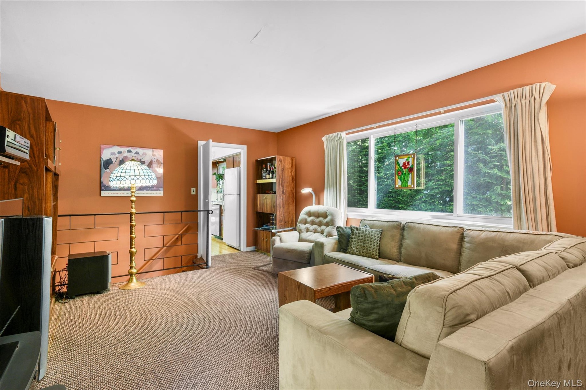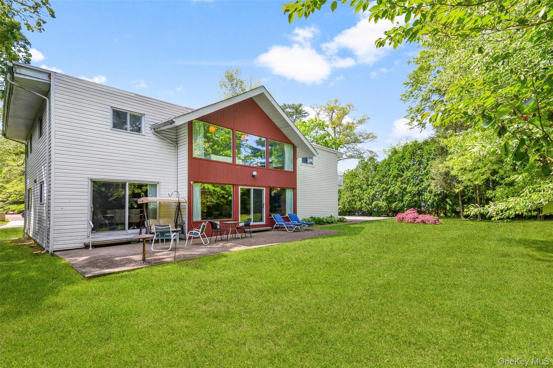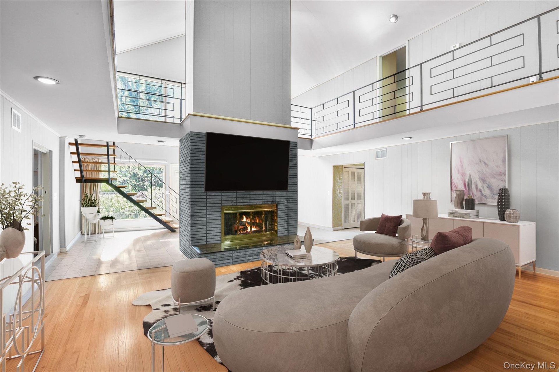 161 Morris Lane South is located on one of the most prestigious streets in the Scarsdale Post Office Estate area (New Rochelle School District). This charming Mid-Century Modern residence offers an exceptional opportunity to live in a truly A+ location. Set on a stunning and level .33-acre surrounded by mature evergreens and specimen trees, this much beloved home offers serenity and privacy, yet is close to all. Step inside the light-filled interior and be welcomed by a dramatic two-story entry foyer and great room featuring a striking modern staircase that sets the tone for the rest of this architecturally distinctive home. The open-concept great room with living and dining spaces combined features a fabulous double-height brick fireplace, and expansive floor-to-ceiling windows that flood the space with natural light while creating a seamless indoor-outdoor connection. This space is exceptional for entertaining with ample space for holiday gatherings, or simply enjoy a cozy evening by the fireplace. The eat-in kitchen offers generous prep space and features sliders to the spacious yard, great for play and entertaining. Next to the kitchen is a cozy family room/den featuring an open staircase leading to a lower-level rec room. An added bonus is a super convenient first-level home office/bedroom with a full bath, perfect for guests or as a nanny room.