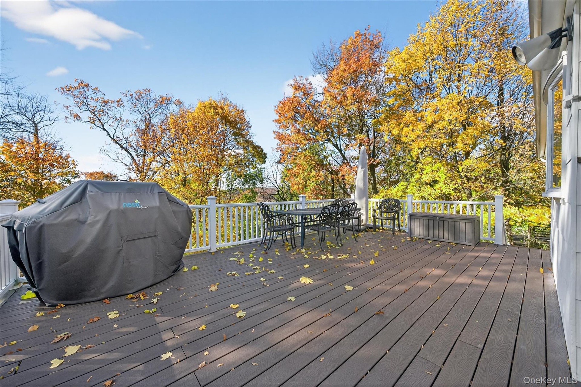- Wooden terrace featuring area for grilling and outdoor dining area