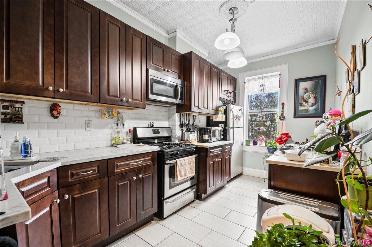 Featuring a total of five spacious bedrooms and three full bathrooms, this home provides plenty of room for comfortable living. The second floor is a legal income-producing apartment, adding an additional layer of income and flexibility for the new owner. Both units feature updated kitchens with custom cabinetry, stainless steel appliances, and stylish subway tile backsplash.