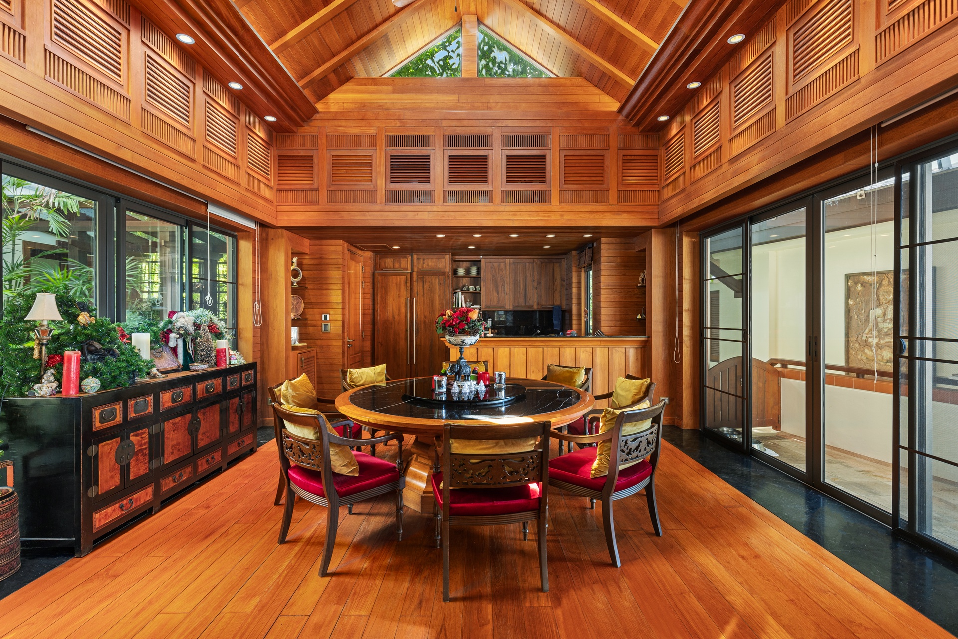 The spacious dining room has a 10-seat marble top and wooden trim dining table and upholstered velvet chair seats with wooden frames. Past this room, is the marble foyer with beautiful wooden panels painted by a famous Thai artist which connects to the living room. Looking out dining room glass doors toward the wood decking and the entrance pond adorned with water plants and mini waterfall.