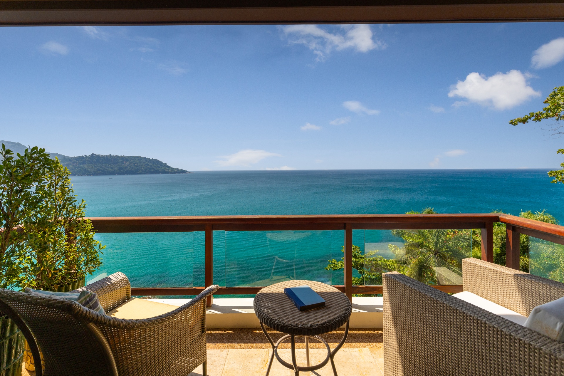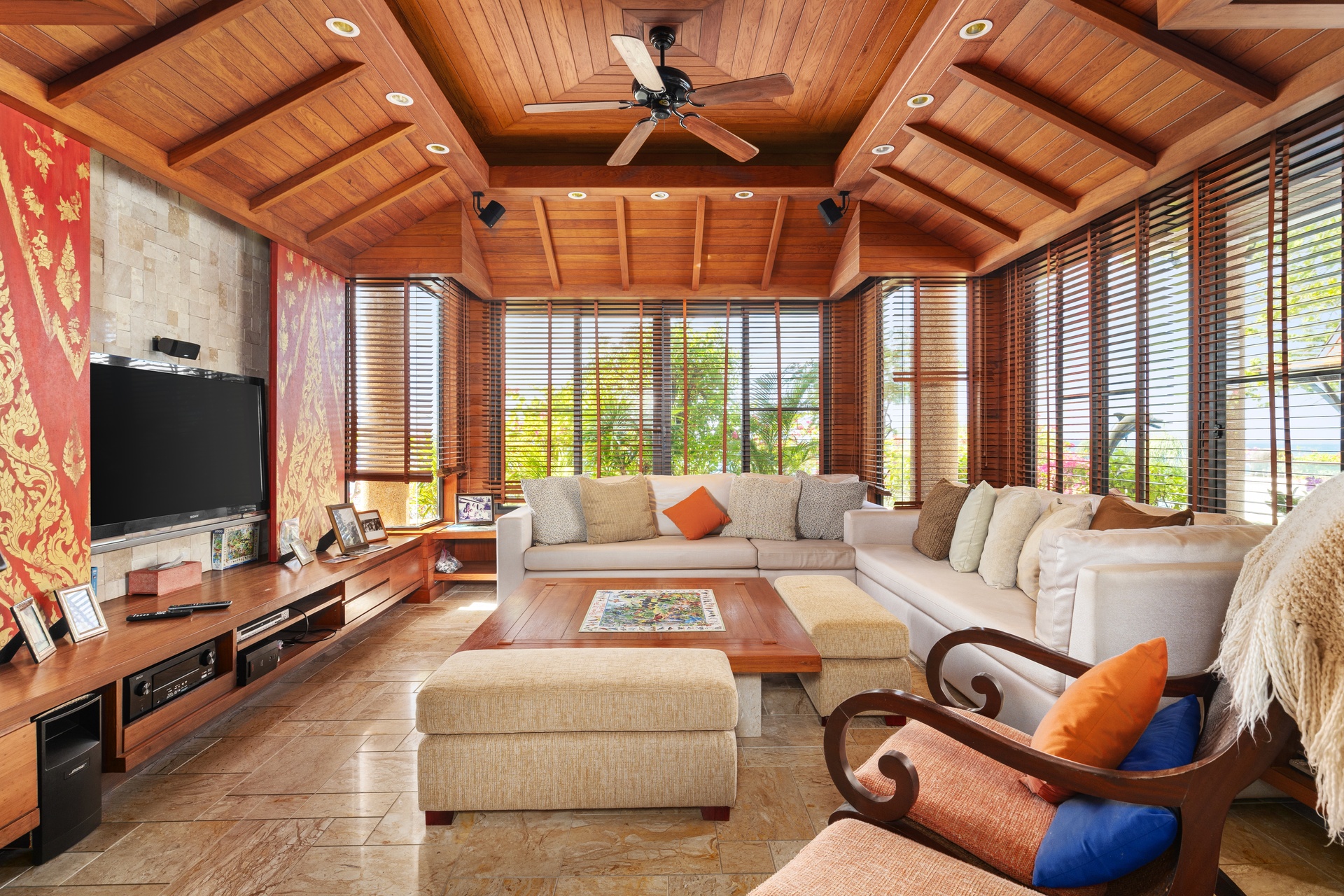 The villa enjoys uninterrupted 180-degree panoramic ocean views. Spacious airy living space of this 4 bedrooms villa blends seamlessly with outdoor area, complete with private infinite-edge swimming pool plus sizable decking, a living sala and large manicured tropical garden with direct ocean access.