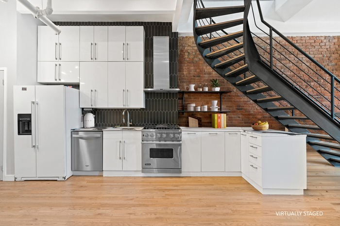 Inside, classic loft details abound: high ceilings, exposed brick walls, and original hardwood floors create an atmosphere of warmth and texture, while a top-of-the-line Viking kitchen, sunlit open layout, and spa-like primary suite bring elevated modern style.