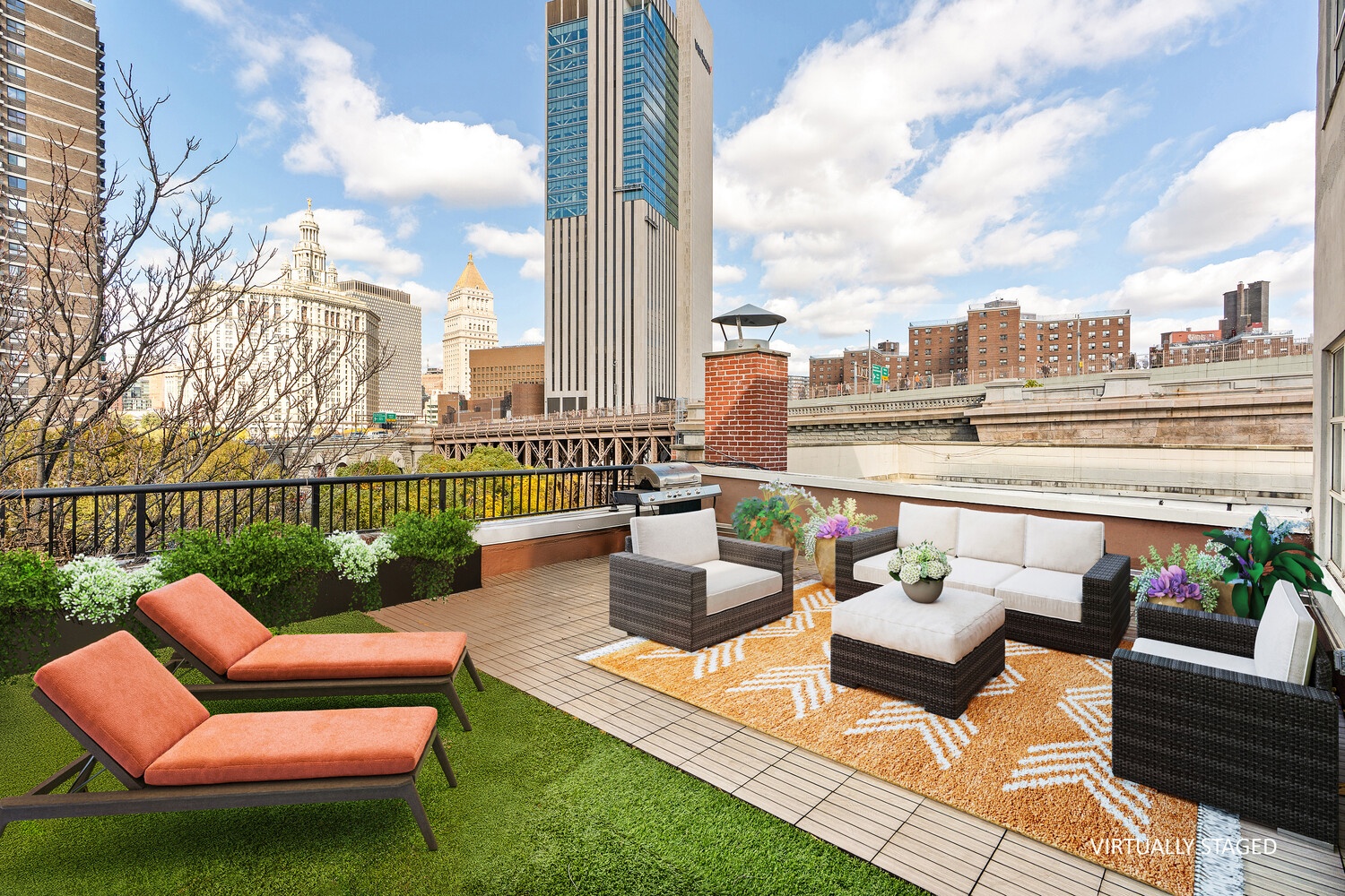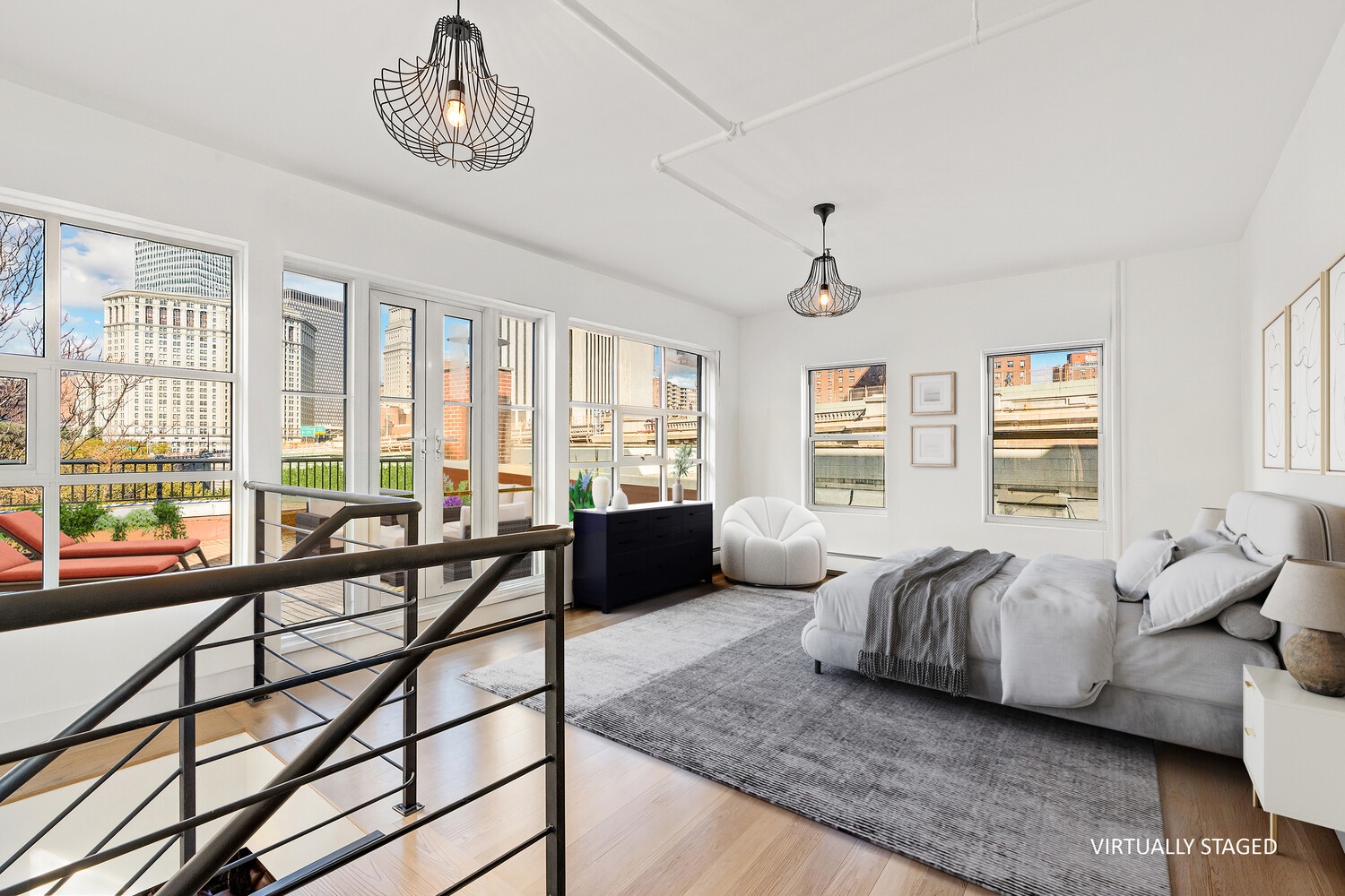 A curved staircase leads to the primary bedroom suite, where French doors open to the private terrace for relaxing, entertaining, or simply enjoying iconic views of the Brooklyn Bridge, Gehry Building, and World Trade Center.