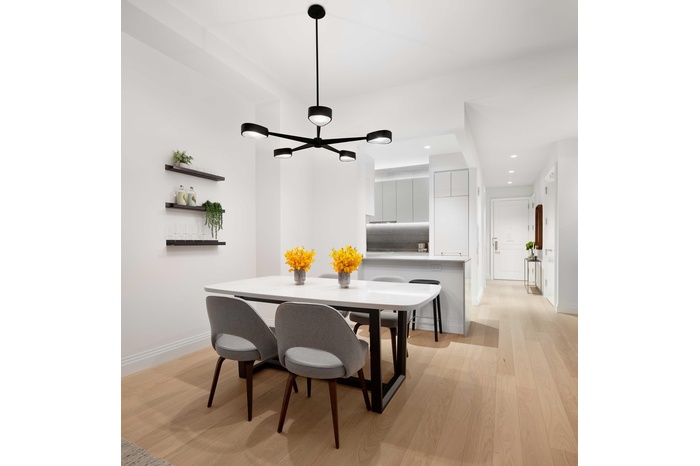 Warm stone primary bathrooms feature a soaking tub with thermostatic controls. Mirrored medicine cabinets are integrated with LED lighting and Bianco Dolomite marble surround. The building’s one-of-a-kind residences maintain the integrity and character of the 1930s scale, a modern take to art deco detailing, and boast ceiling heights over ten feet throughout with wide-plank French Oak hardwood floors underfoot.