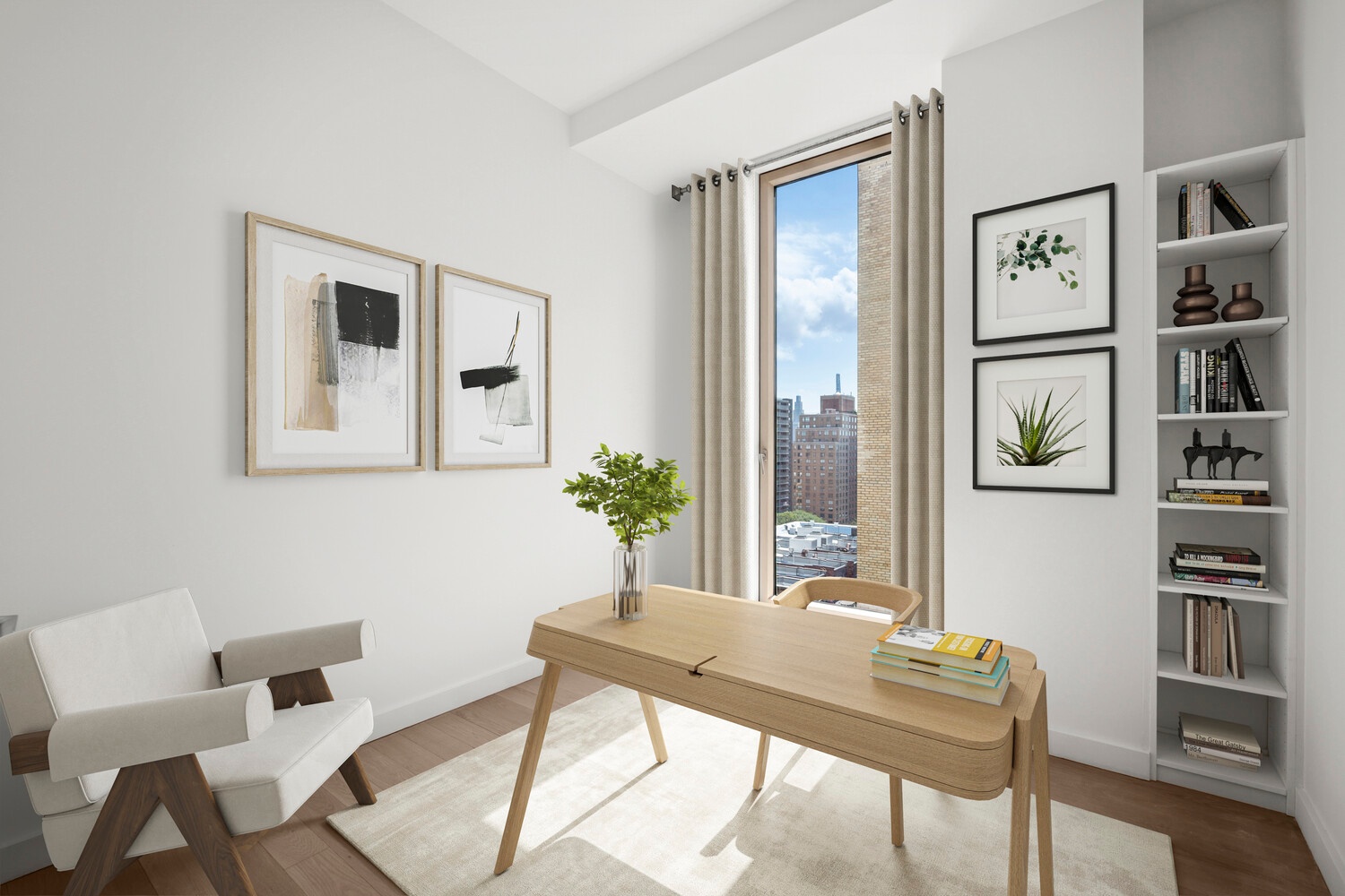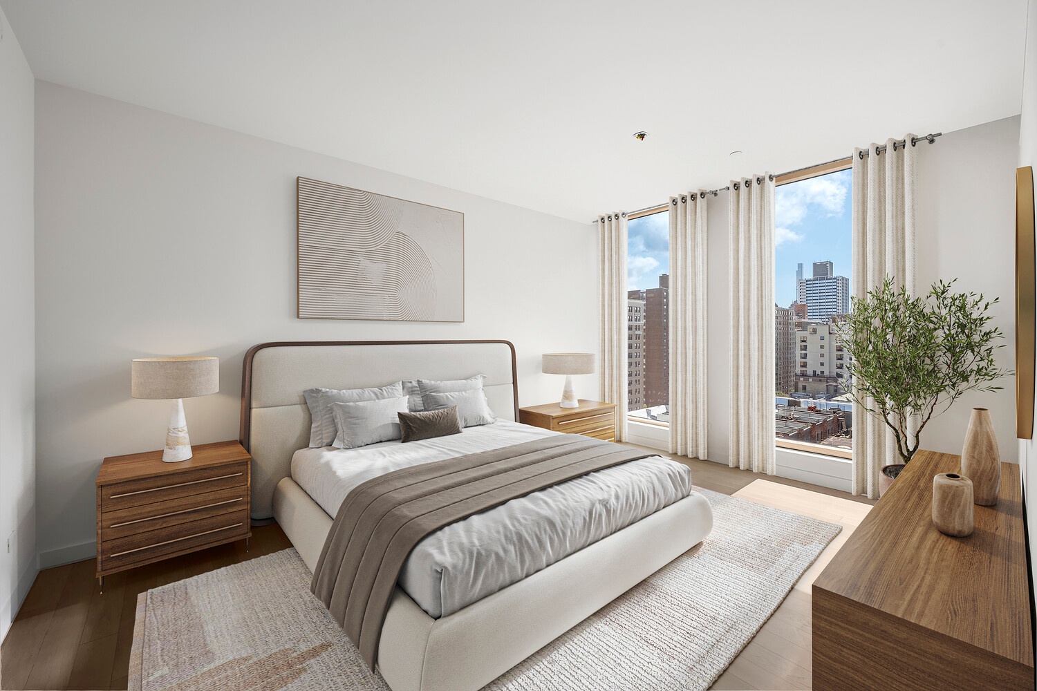 An intimate full-floor home, Residence 11 includes all the features of a luxurious, discrete townhouse; a private entrance, abundant outdoor garden/terrace space and complete separation of the sleeping quarters. The living dining room is a striking 22'5" by almost 21' room with three exposures: west, north and east. A true luxury, the 489sf terrace essentially doubles your living area and is accessed from both the living room and kitchen. The south-facing sleeping quarters can be entered from two separate hallways through pocket doors. One secondary bedroom includes an en suite bath, while the two others share a large adjacent bath with double vanities. The bright and sunny primary suite includes a gracious walk-in closet and en suite bath with separate tub and shower.