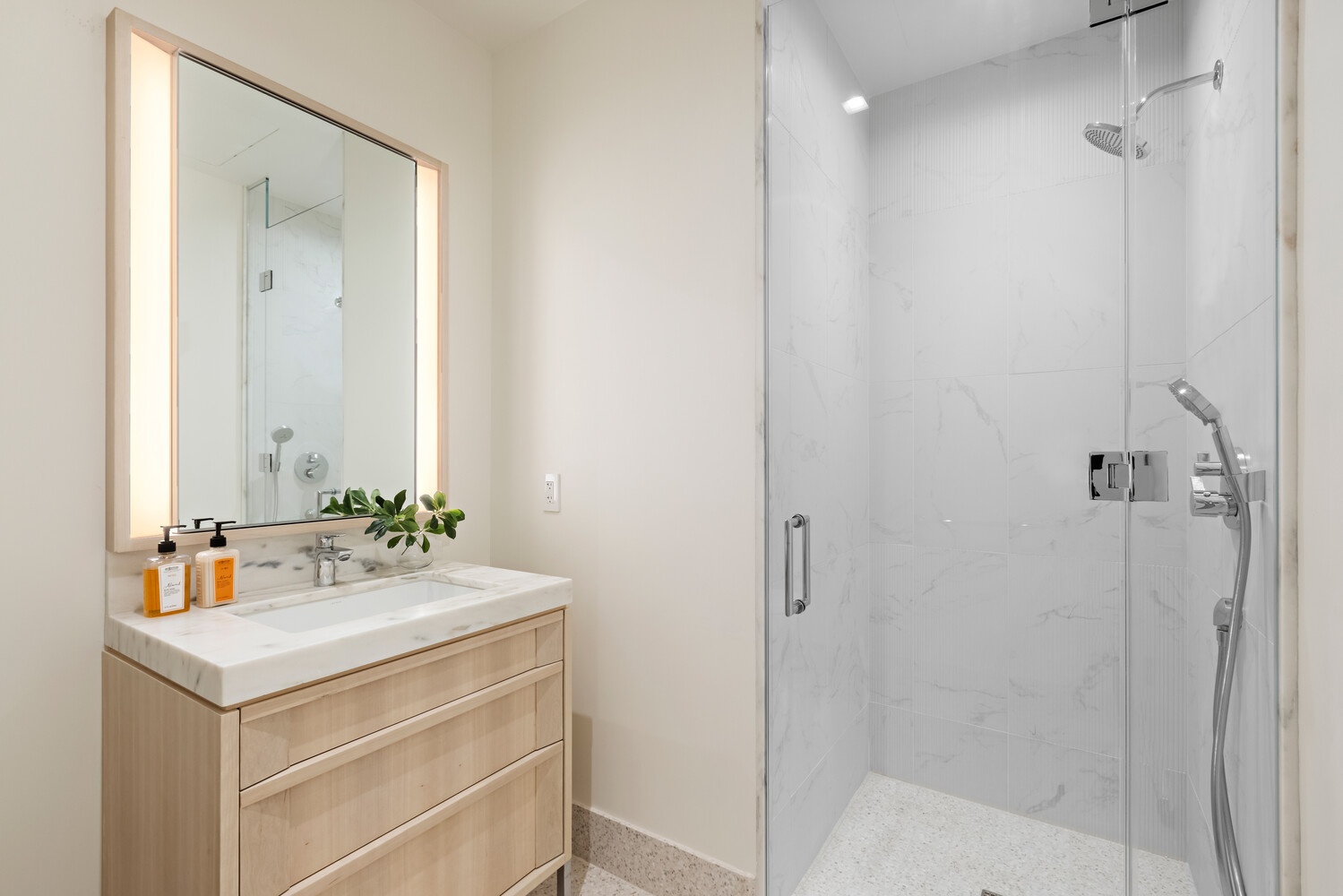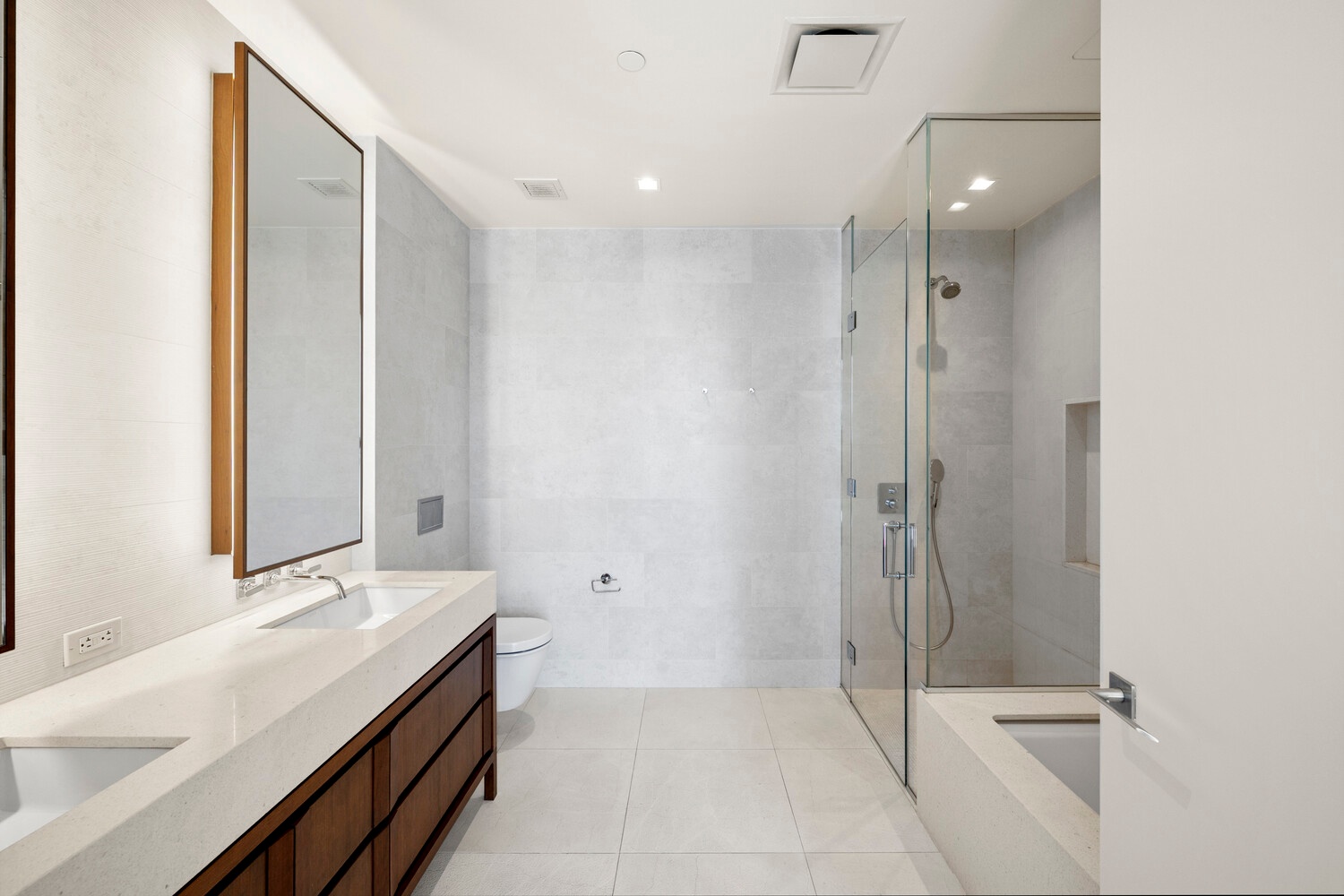 The artistic design and décor of the bathrooms bring tranquil textures and calming hues to everyday regimens. Primary baths feature a striking backlit fluted feature wall behind a custom designed dual-sink vanity. Italian Lymra limestone covers the floors and countertops while a frameless shower glass enclosure accentuates a seamless, spa-like design throughout. Heated floors and elevated fixtures by Hansgrohe, Duravit and Kaldewei add to this timeless bath design.