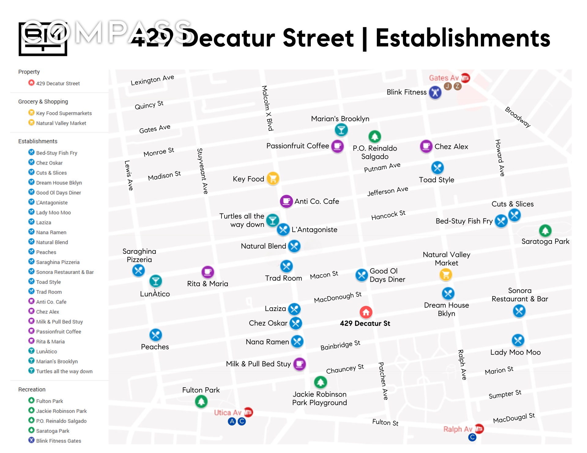 Situated on a picturesque tree-lined block in the heart of Bedford-Stuyvesant, 429 Decatur Street offers easy access to the best of the neighborhood. Enjoy nearby favorites such as Trad Room, Chez Oskar, Early Yves, Badaboom, and Laziza, or grab a coffee and pastry at Doc's Cake Shop. Convenient transportation via the A/C and J/M subway lines ensures quick access to Manhattan and beyond, while JFK Airport is just a short drive away.