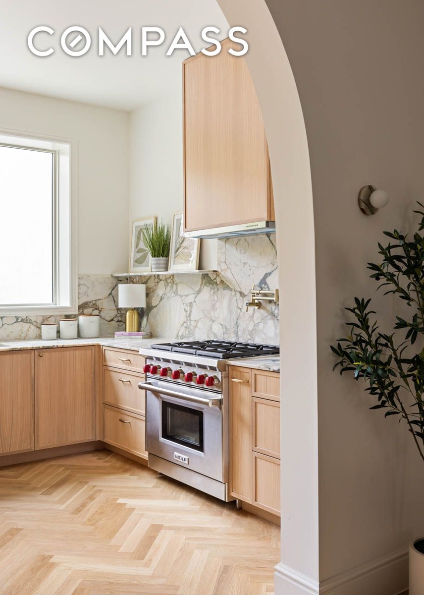 The owner’s three-bedroom, two-and-a-half-bath duplex opens into a gracious foyer and leads to a sun-filled parlor level with soaring ceilings, wide-plank white oak floors, and an open, flowing layout ideal for modern living. The living and dining areas are anchored by a stunning chef’s kitchen outfitted with custom cabinetry, marble countertops, a Fisher & Paykel integrated refrigerator, a six-burner Wolf range, an integrated dishwasher, and a microwave drawer. Massive windows overlook the rear deck and lush backyard, creating a perfect indoor-outdoor connection.