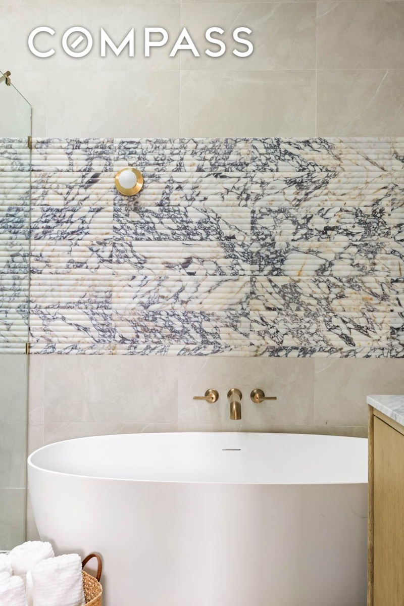 Upstairs, the primary suite overlooks the garden and includes a custom-fitted walk-in closet and a luxurious en-suite bathroom with marble finishes, skylight, a double vanity, and a spa-like glass shower and separate deep soaking tub. Two additional bedrooms share a full skylit bathroom with a bathtub, while a vented washer/dryer adds everyday convenience on this floor.