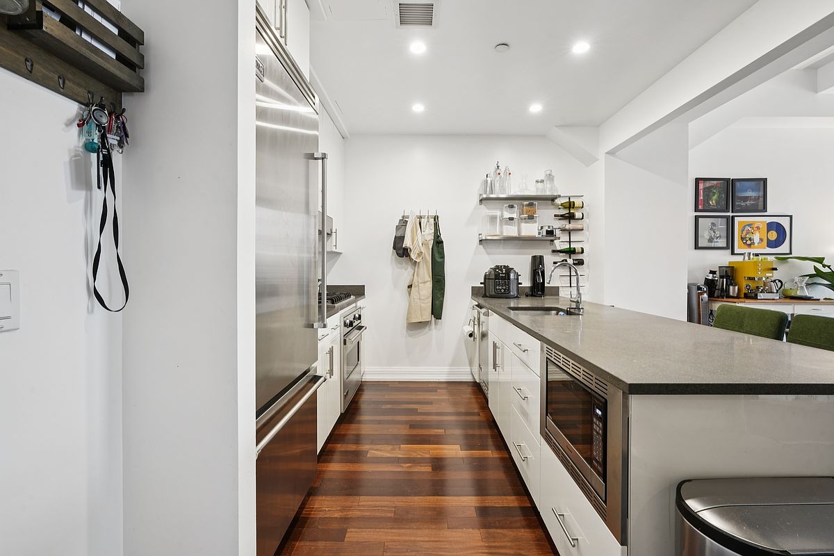The chef’s kitchen features top-of-the-line Viking appliances, custom-lacquered cabinets, and striking lava stone countertops, while the marble bathroom offers a separate soaking tub and walk-in shower. The king-sized primary bedroom comes with two walk-in closets, and an in-unit washer/dryer adds modern convenience.