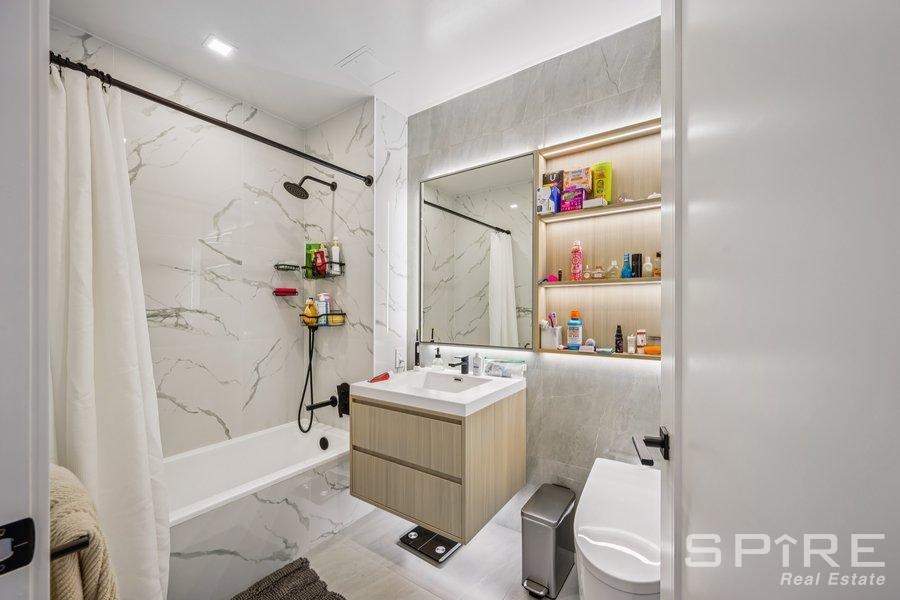The open kitchen features sleek Bosch appliances, an induction cooktop with full exterior venting, and quartz countertops paired with matte black fixtures. High ceilings enhance the sense of space. The bedroom has a large reach-in closet and easy access to a spa-like full bathroom with porcelain tilework, Signature fixtures, radiant heated floors, custom shelving, floating vanity, and a premier Toto Neorest automatic toilet. Laundry is a breeze with an in-unit LG washer/dryer.