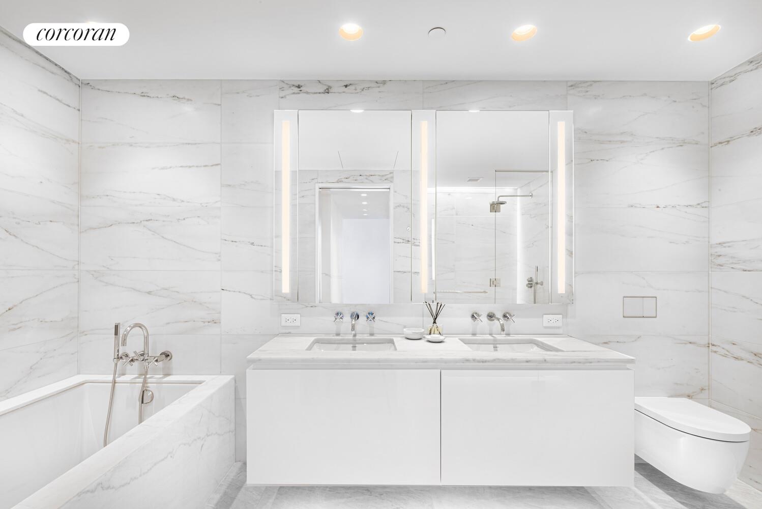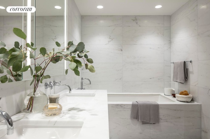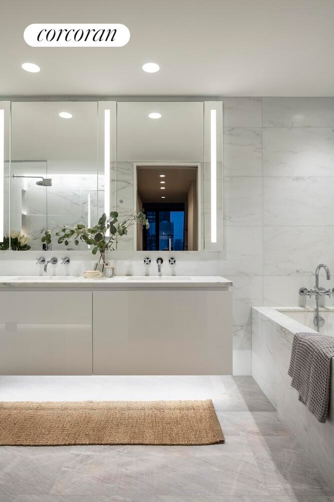 Designed by Meier Partners, the residence interiors are a striking contrast to the black glass exterior, reflecting a white color palette. Living spaces are immersed in natural light radiating through the floor-to-ceiling windows. White oak floors are found in all residences and open kitchens boast white Calacatta Lincoln marble counters, Dornbracht fixtures and Gaggenau appliances clad in custom-crafted Italian white lacquer. Each residence is equipped with a built-in Crestron smart home system that regulates temperature, lighting, and motorized window shades. These functions can be seamlessly controlled by residents through any iOS or Android device.