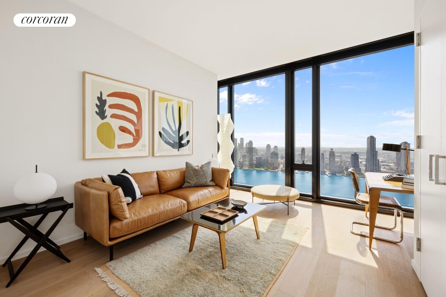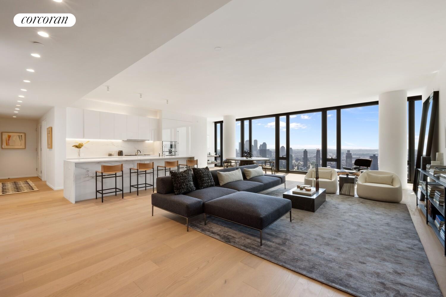 Residence 40A at One United Nations Park is a 2,900sf four bedroom, four bathroom plus powder room, residence overlooking the East River. The generous layout boasts an expansive great room and open kitchen with large island.