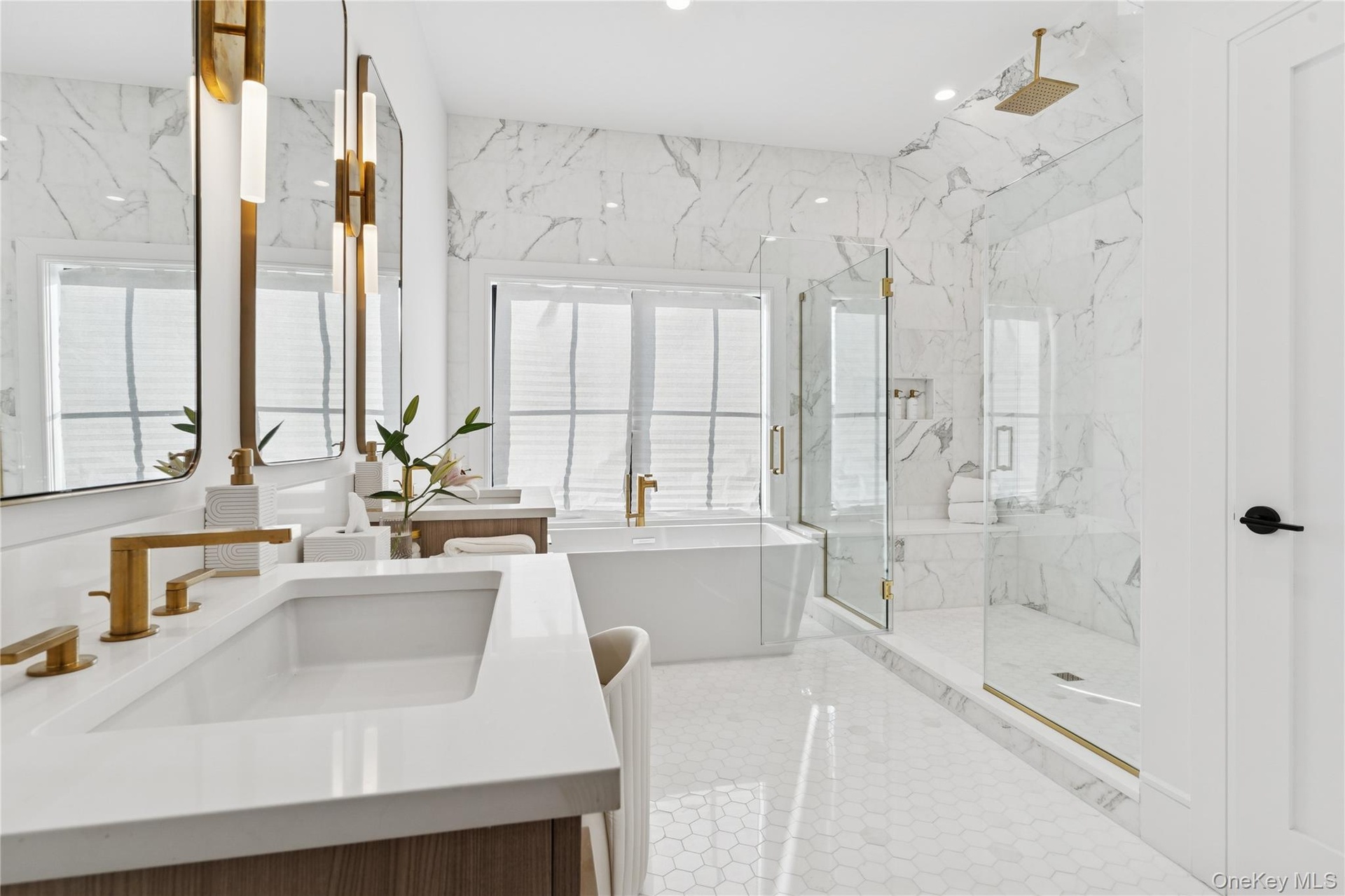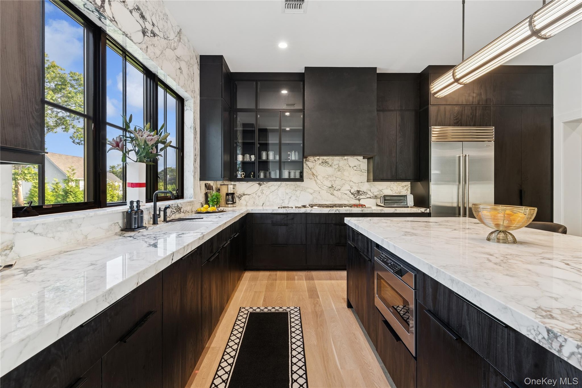 On the upper level, the grand primary suite, which overlooks the lush grounds and pool, hosts a generous bath, and huge closets. Three additional bedrooms, one en- suite, and two which share a decorator designed bath.