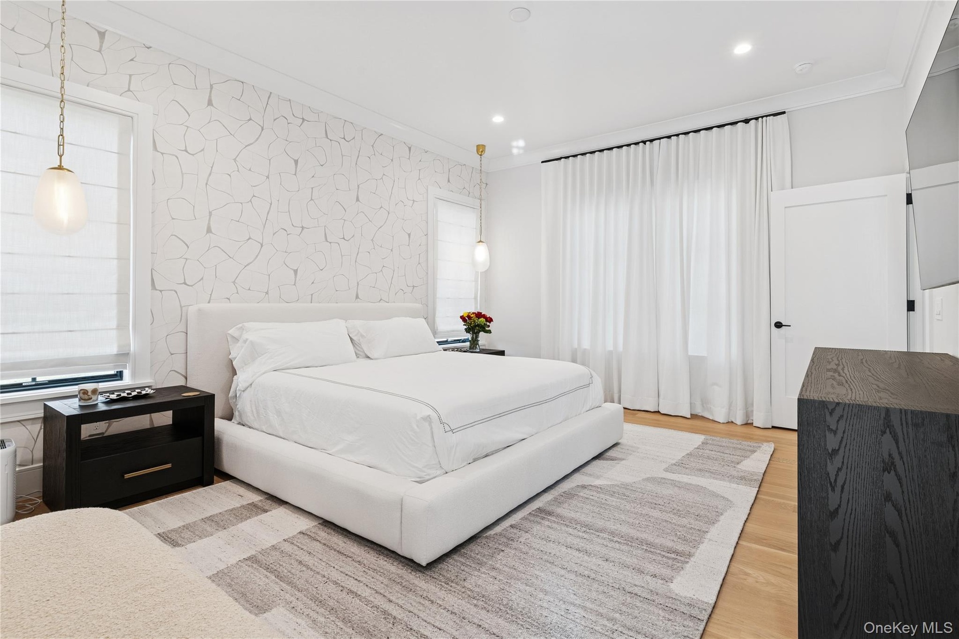 Welcome to Country Point Estates, the newest neighborhood in Westhampton Beach Village. Be the first to rent this up -to -the -minute, five bedroom home, equipped with all of the amenities for a fabulous August in the Hamptons. Enter through a bright and opulent foyer which leads to the open plan, featuring a gracious, clean and modern living room with views of the private green space and sparkling heated pool. Open plan gathering in the beautifully appointed kitchen and media room. An ample en-suite guest bedroom, two additional beautiful half baths, one centrally located, and the other with easy pool access.