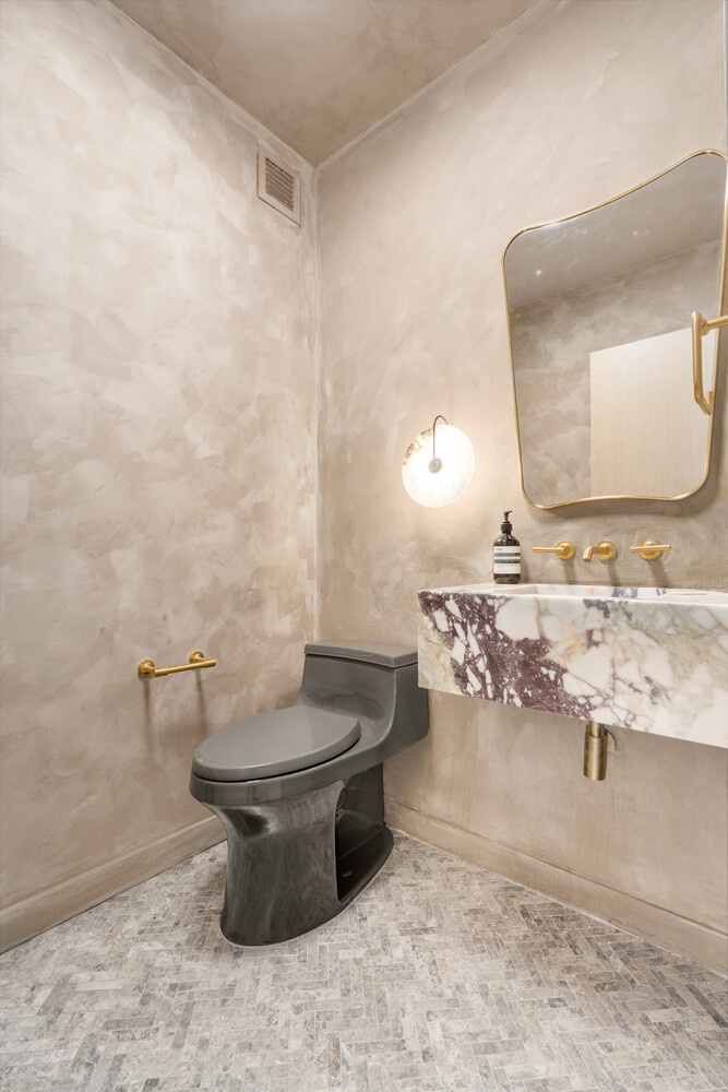 The spacious primary suite features motorized window treatments, a custom walk-in closet, and a luxuriously renovated en-suite bath outfitted with Calacatta Vagli marble, Waterworks and Kohler fixtures, heated floors, and a heated towel rack.