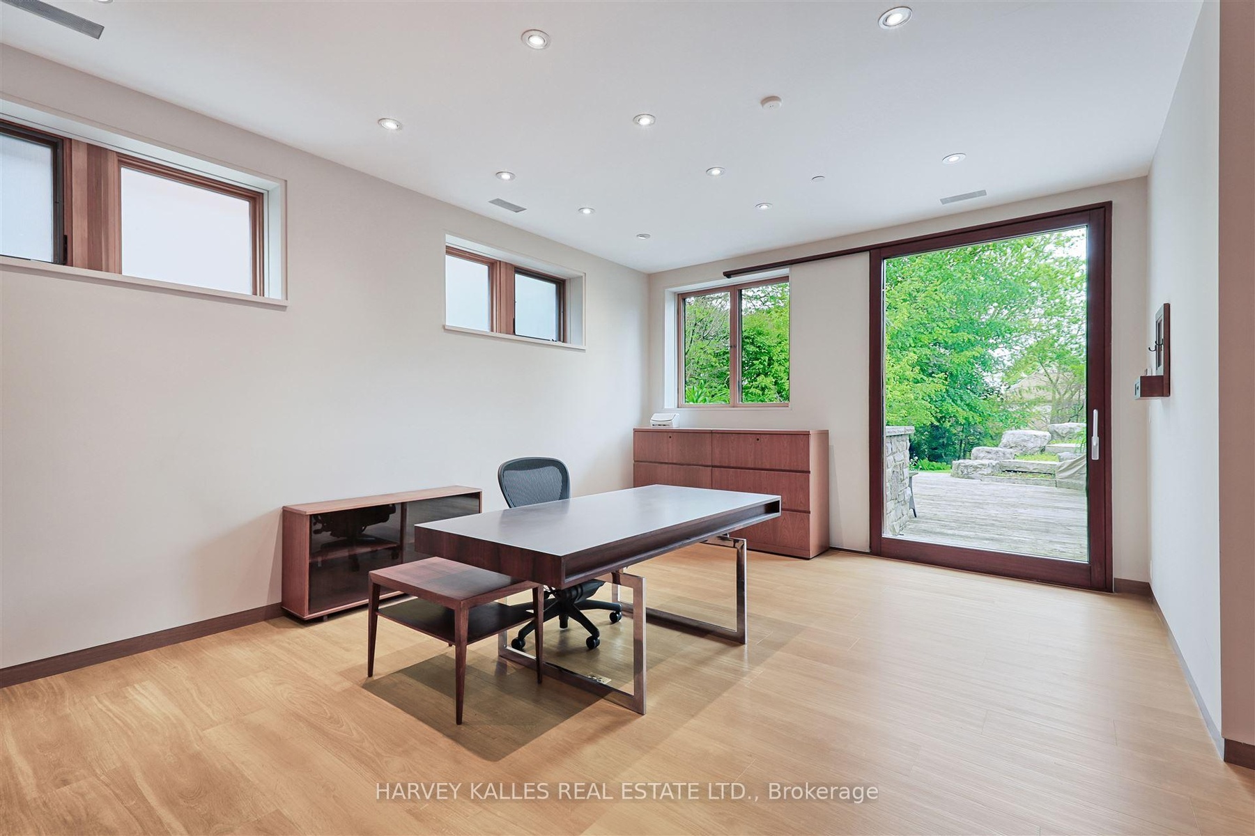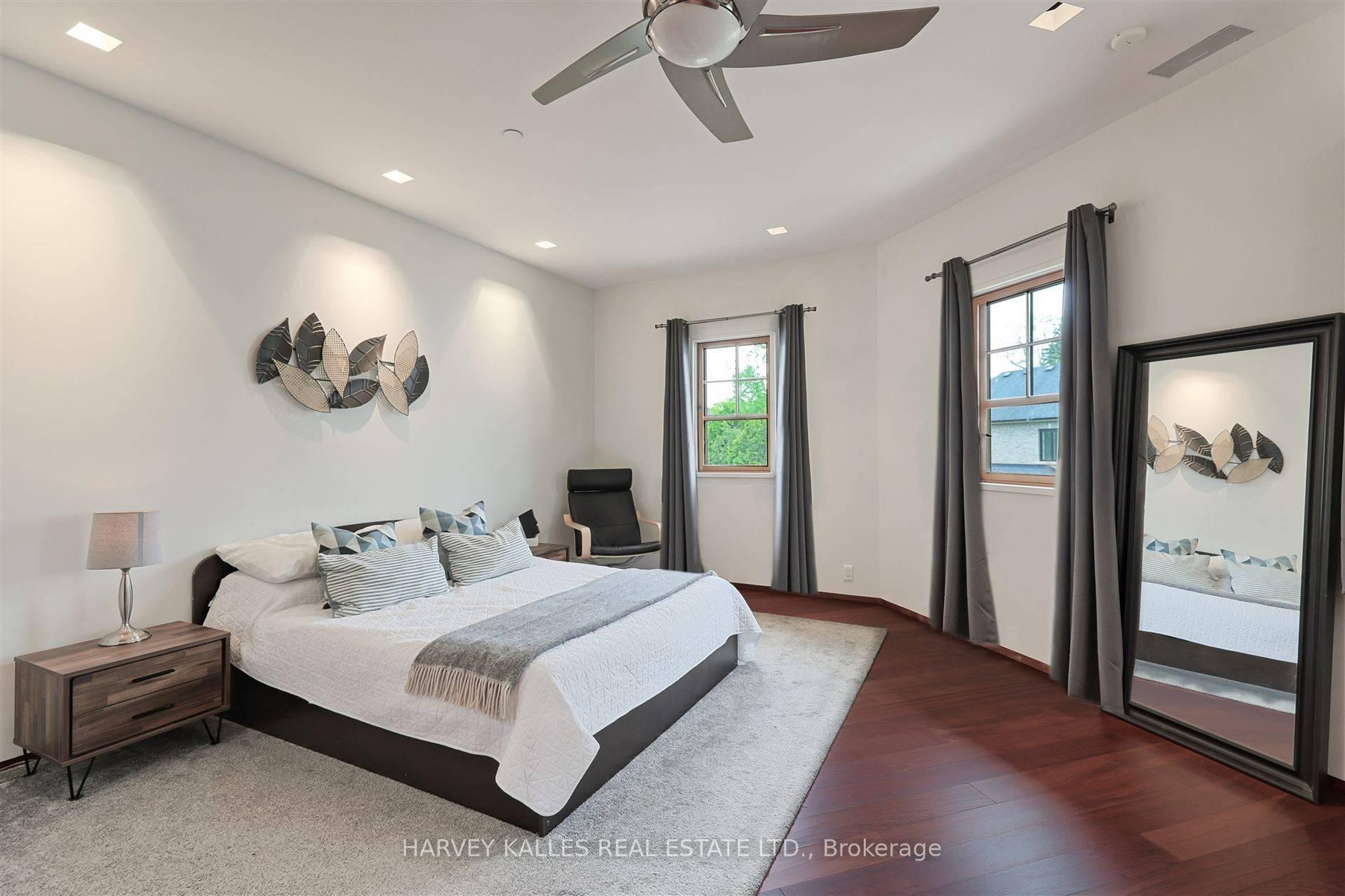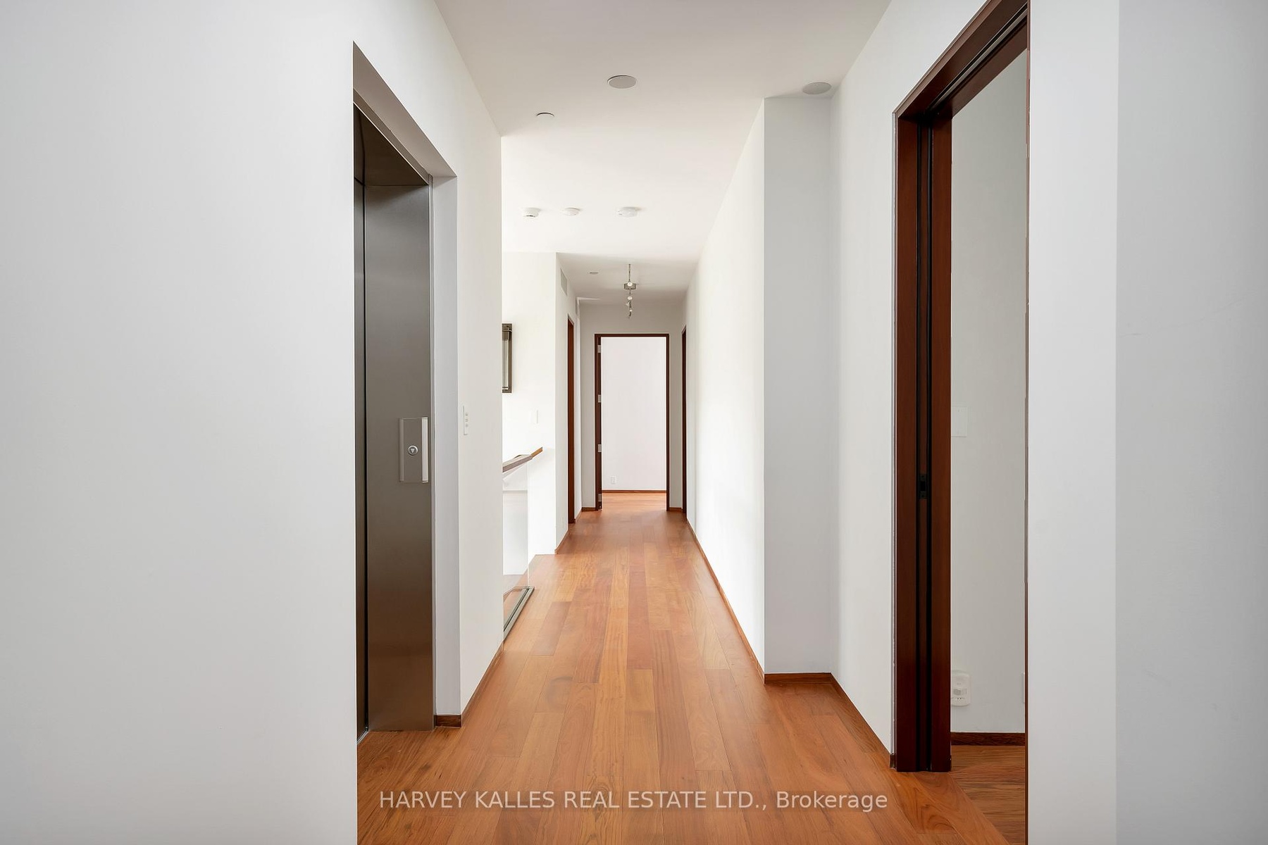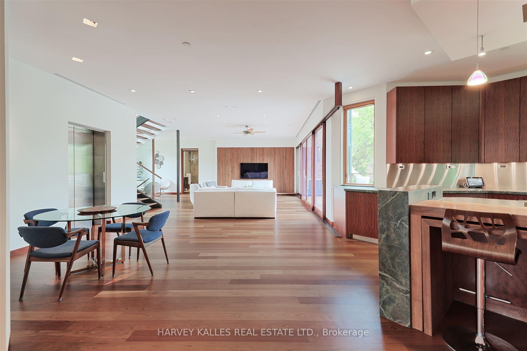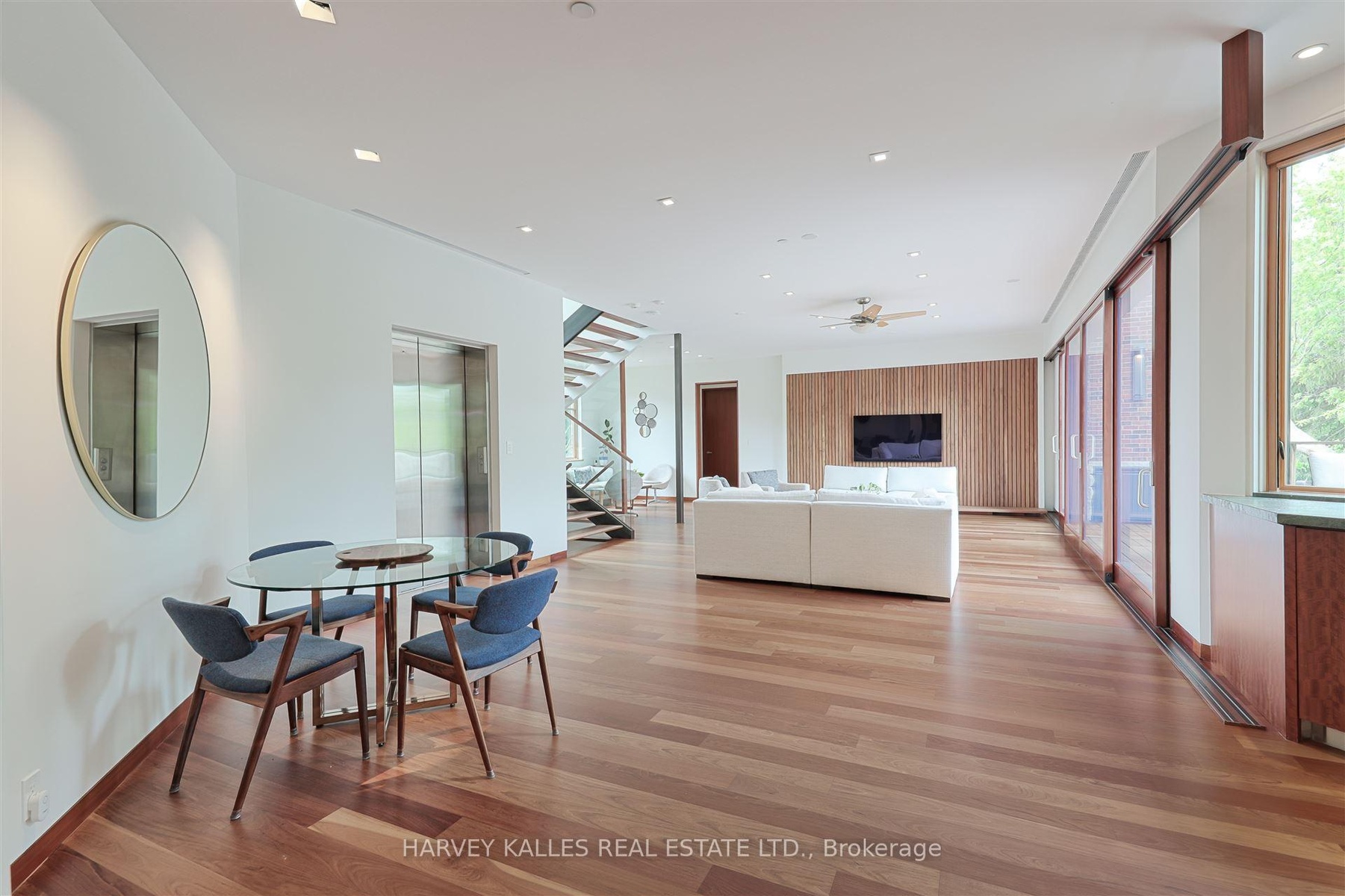 Discover a gem, custom-built as a multi-generational home, offering over 11,000 sq ft of luxurious living space on a rare 125ft double lot at the edge of the Humber Valley in the tree-lined Kingsway neighbourhood. This residence is a statement of contemporary elegance and sophistication, perfect for the discerning family.Inside, experience clean lines and exquisite details that enhance comfortable luxury living, including sound-isolated suites, Jatoba hardwood floors, stunning Persian serpentinite kitchen countertops, and heated stone floors for ultimate comfort.Accessibility is a key feature, with snow melt for the front porch, steps, ramp and driveway, a commercial 4x6 ft elevator, and 4 ft wide hallways to ensure effortless movement throughout the residence.The ground floor features a bright, open-plan living area that seamlessly integrates the chefs kitchen, dining, and living spaces, extending to a partially covered upper deck with a 17ft wide opening. A heated 3-car garage is cleverly positioned at the side of the house.The primary retreat is where luxury meets tranquility, featuring two generous walk-in closets and two ensuites one complete with a massage room and whirlpool tub offering tree-top views. Two additional spacious bedrooms, each with walk-in closets, share a thoughtfully designed bathroom suite with dual sinks, ample storage, and a separate area for added privacy. The oversized fourth bedroom also includes its own ensuite bathroom and walk-in closet, providing comfort and convenience for family or guests.The ground floor bedroom suite with a Juliet balcony offers a perfect retreat for guests.Venture to the finished lower level, where 10+ ft ceilings create a light and airy ambiance.This expansive space features a wide sliding door leading to the lower deck, ideal for entertaining.With multiple entertainment areas, including a stepped home theatre and sprawling park-like backyard, this home is designed for those who appreciate spacious comfort.
