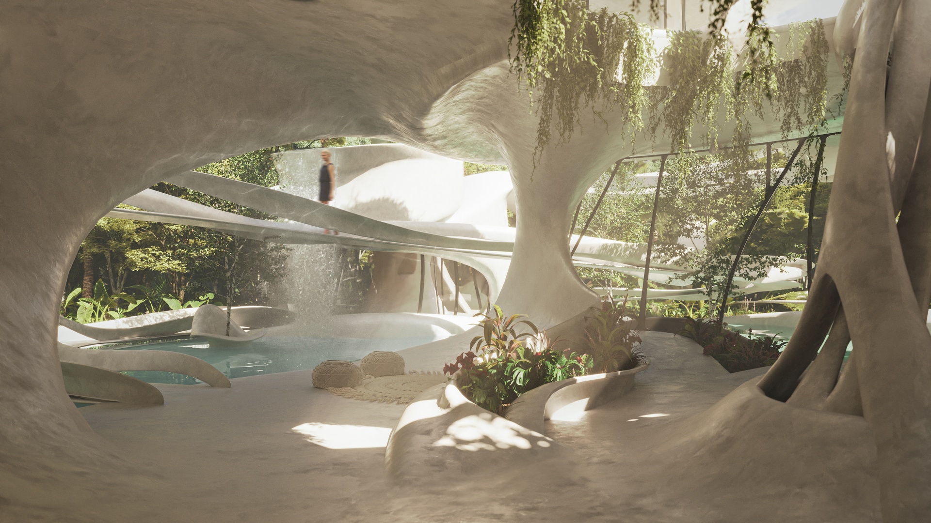 With a 60 % construction / 40 % free-area balance, Villa Turquesa feels alive: terraces dissolve into the jungle, water features reflect filtered sunlight, and woven canopies breathe with the rhythm of the forest.