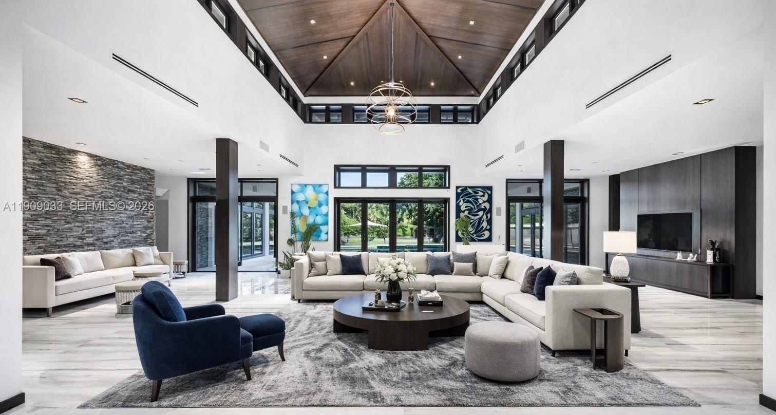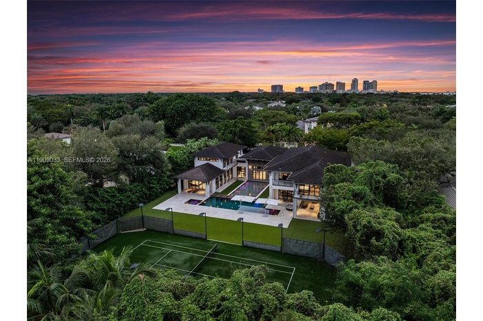 Welcome to The Sanctuary at Pinecrest, a private haven of modern elegance and timeless design. This gated estate offers approx. 11,300 SF of living space on a 1.16-acre lot with 7 bedrooms and 11 baths, including two luxurious primary suites. Soaring ceilings, walls of glass, and refined finishes define the interiors, featuring a chef’s kitchen, formal and casual living areas, gym, media room, office, and guest quarters. Outdoors, enjoy an infinity-edge pool, summer kitchen, covered terraces, PRIVATE TENNIS COURT, and two fountains framing the main entrance. Complete smart-home automation, elevator, and lush tropical landscaping enhance this architectural masterpiece.