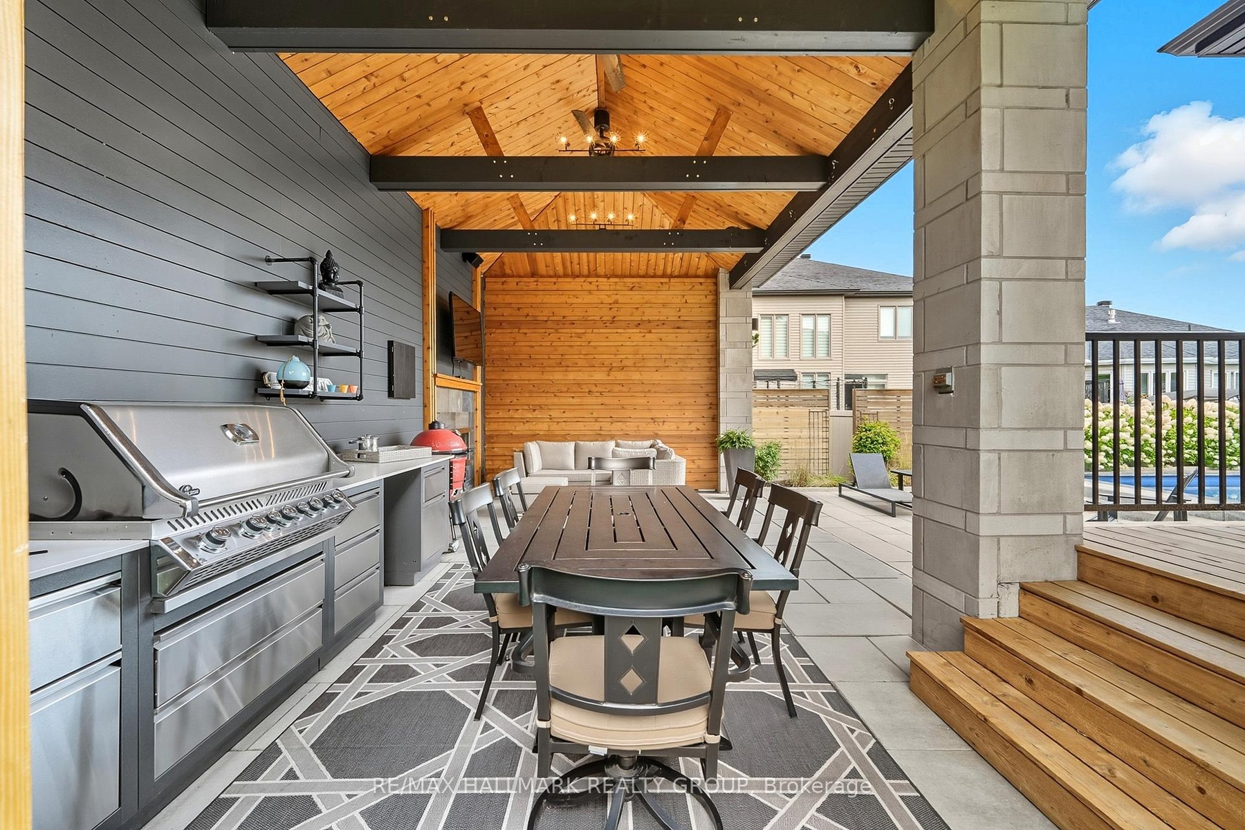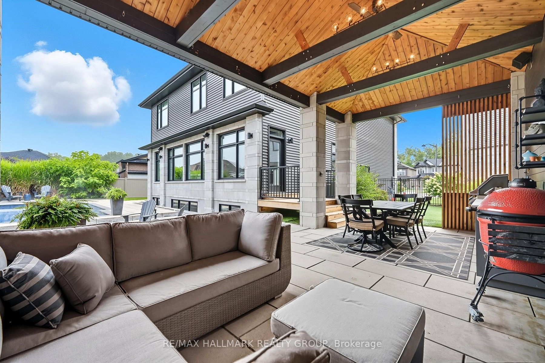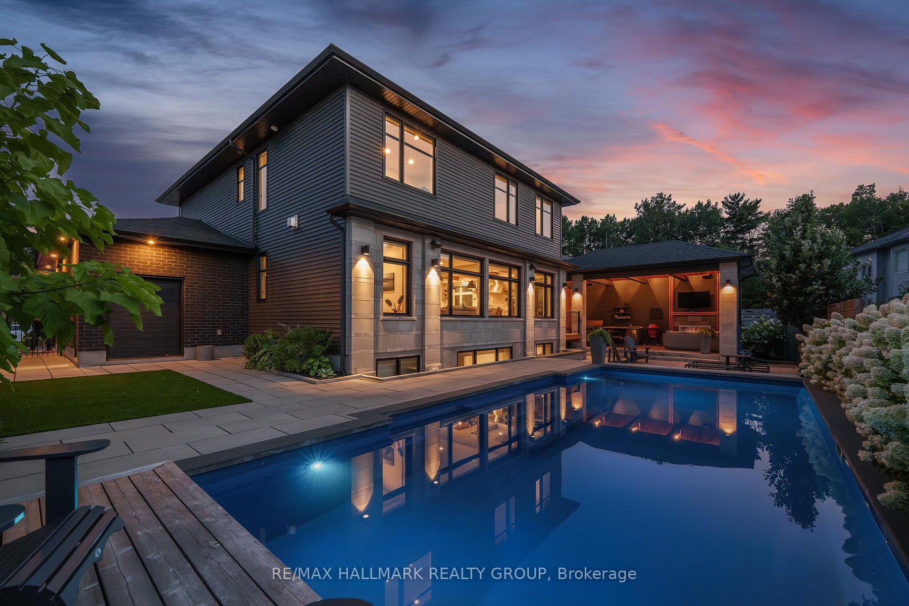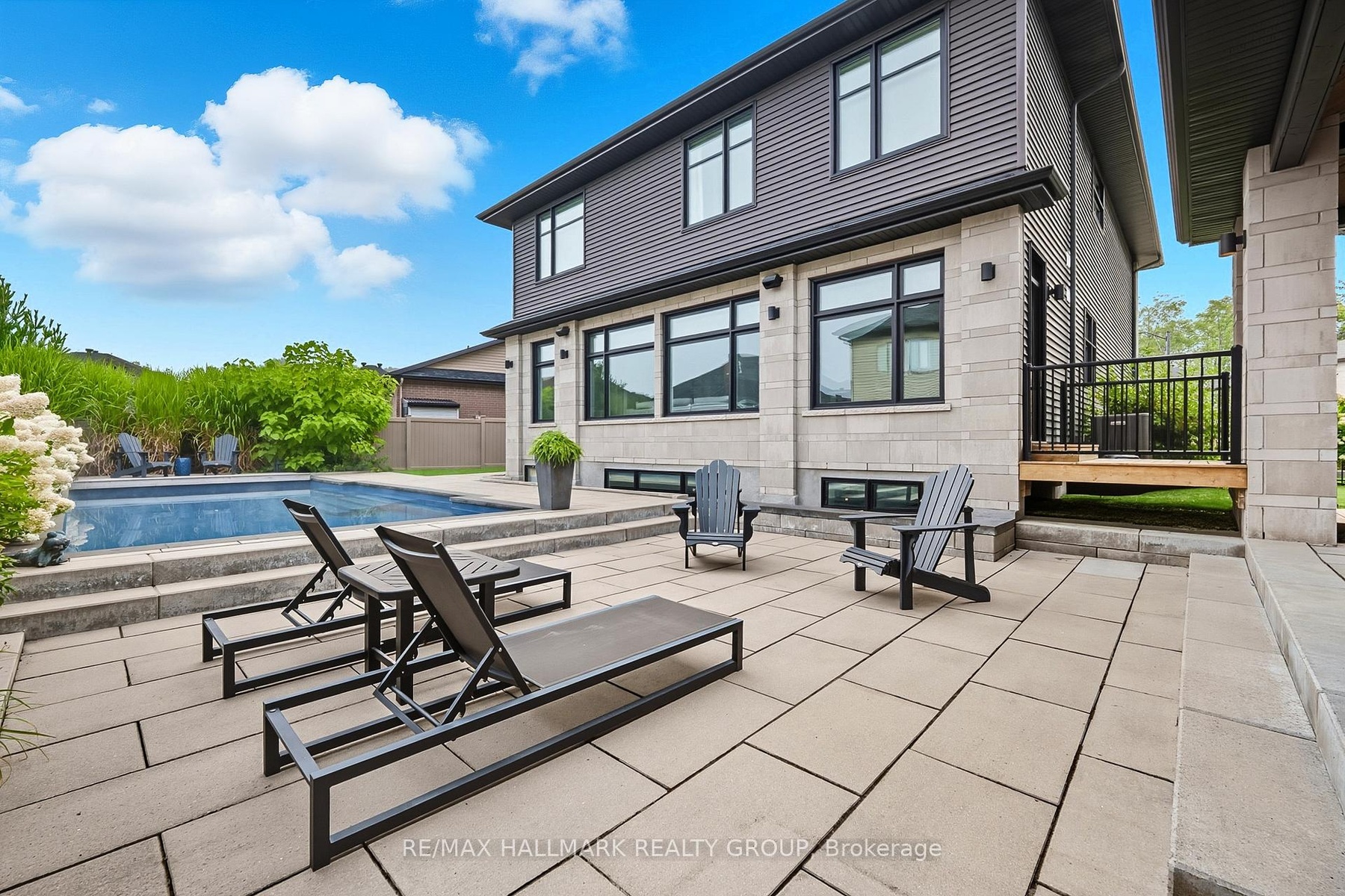 **OPEN HOUSE SUNDAY, NOVEMBER 9, BETWEEN 2-4PM** This stunning 5 bedroom home blends architectural sophistication with modern comfort, set in one of Orleans' most prestigious communities of Trails Edge. Its striking stone-and-brick exterior, modern landscaping and triple-car garage make an unforgettable first impression. Step outside to your backyard oasis - an entertainer's paradise featuring an inground pool, sleek stone patio, and a rustic-style covered pavilion with exposed beams, built-in gas BBQ, gas fireplace, TV area, and ample space to dine or lounge in style. Professionally landscaped for elegance and low maintenance, this outdoor retreat is perfect for summer gatherings and entertaining. Inside, rich hardwood flows throughout, complemented by pot lights and expansive windows that flood the home with natural light. The main level features a living room with gas fireplace, a private office with built-ins, and a chef's kitchen designed to impress - high-end appliances, gas stove, oversized island with seating for six, custom drawers, accent wood beams, and a convenient butler style service kitchen with two mini fridges, perfect for coffee, cocktails, or entertaining guests. Upstairs, the lavish primary suite boasts a boutique-style walk-in closet with island and a spa-inspired 5-piece ensuite with soaking tub, glass shower with rain head, and floating dual-sink vanity. Each secondary bedroom offers a walk-in closet and ensuite bath, while a generous laundry room with built-in storage completes the upper level. The finished lower level expands living space with a recreation area, wet bar, two bedrooms, a full bath, and abundant storage, creating an ideal retreat for family and guests. Combining modern elegance, sophisticated living, and exceptional walking access to top elementary and secondary schools, parks, and amenities, this home delivers the ultimate in comfort and style.