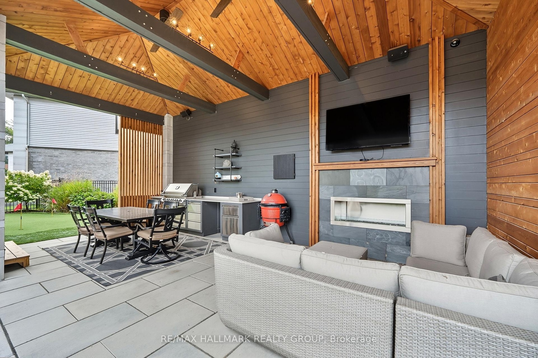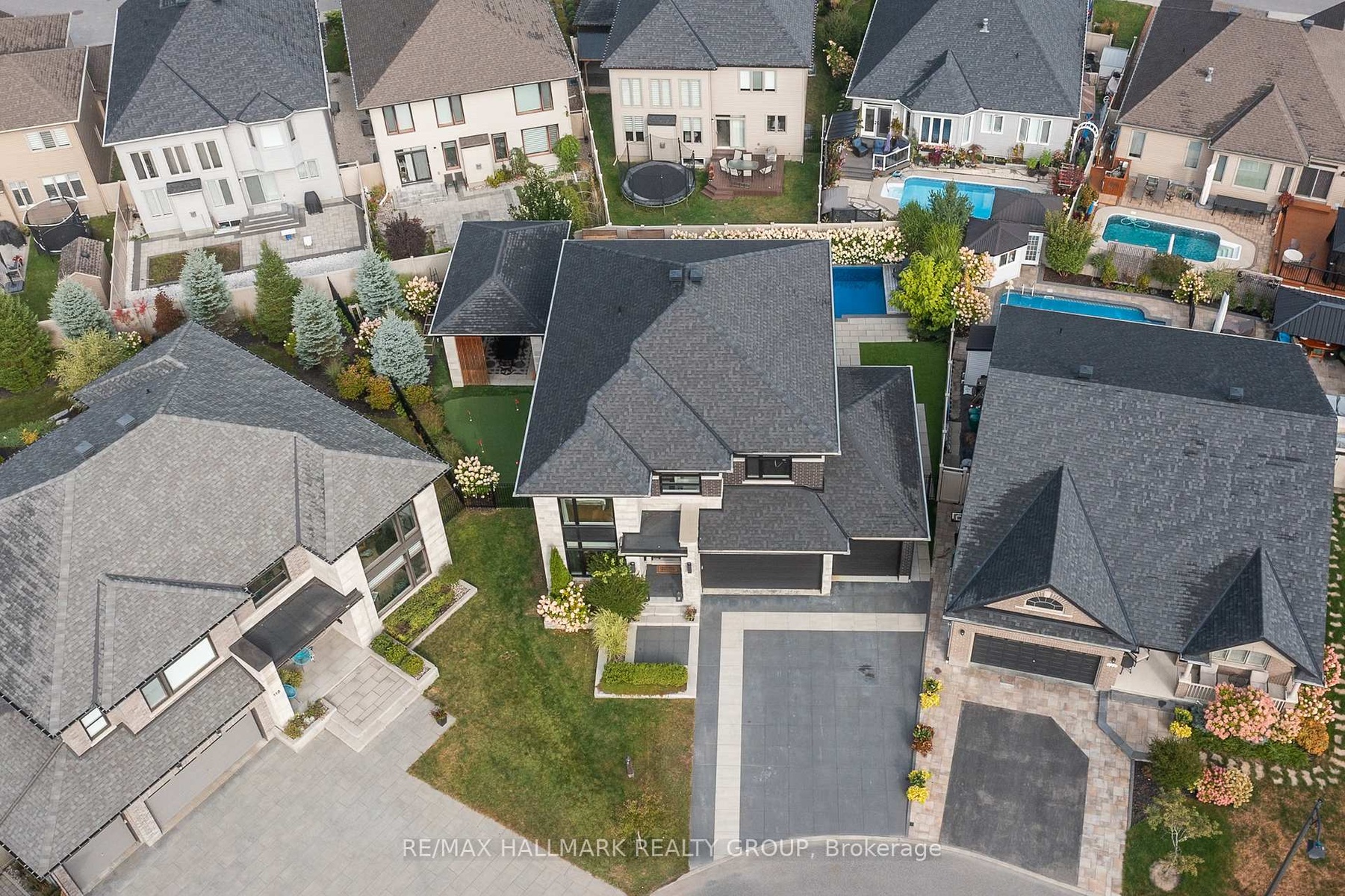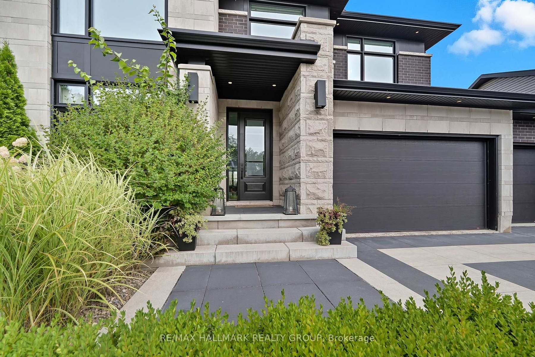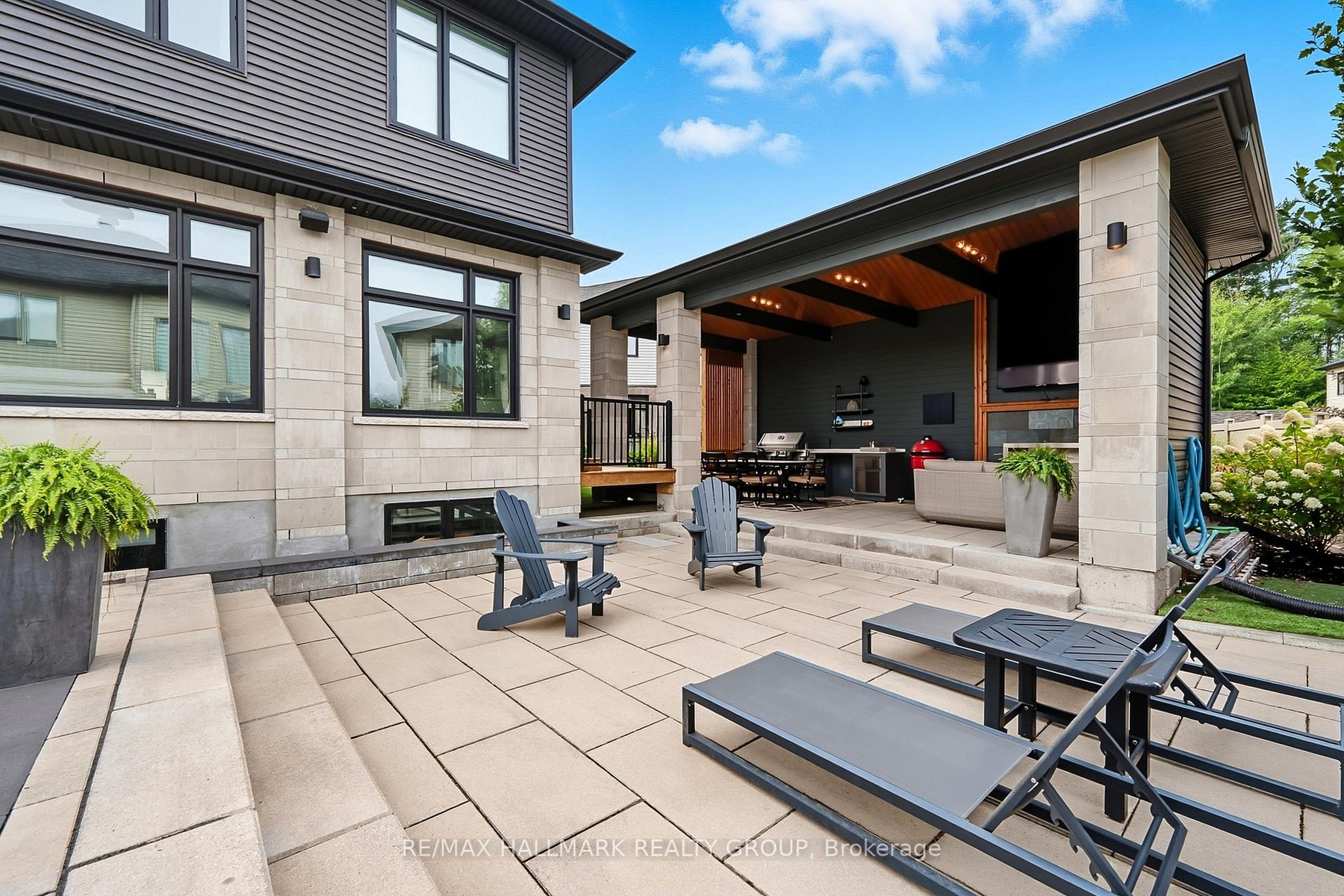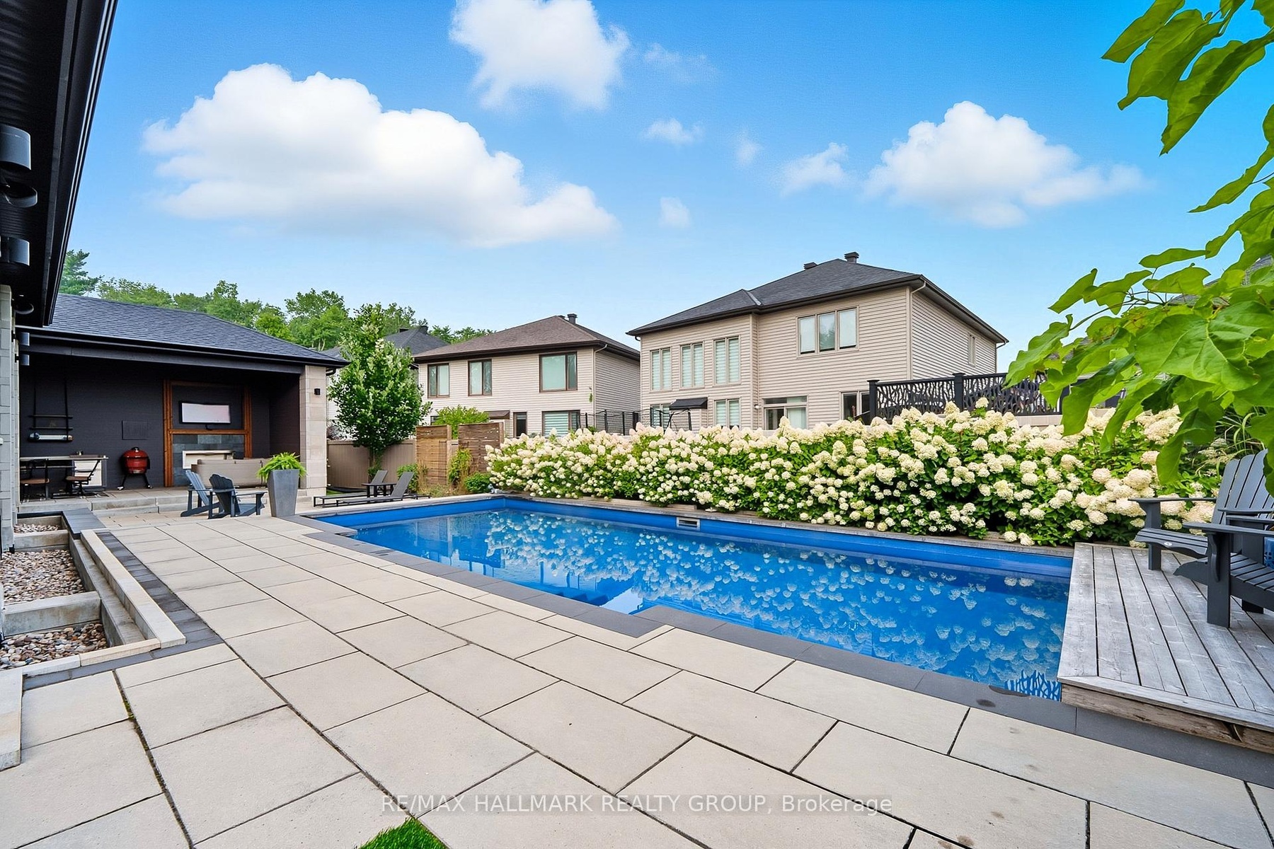 **OPEN HOUSE SUNDAY, NOVEMBER 9, BETWEEN 2-4PM** This stunning 5 bedroom home blends architectural sophistication with modern comfort, set in one of Orleans' most prestigious communities of Trails Edge. Its striking stone-and-brick exterior, modern landscaping and triple-car garage make an unforgettable first impression. Step outside to your backyard oasis - an entertainer's paradise featuring an inground pool, sleek stone patio, and a rustic-style covered pavilion with exposed beams, built-in gas BBQ, gas fireplace, TV area, and ample space to dine or lounge in style. Professionally landscaped for elegance and low maintenance, this outdoor retreat is perfect for summer gatherings and entertaining. Inside, rich hardwood flows throughout, complemented by pot lights and expansive windows that flood the home with natural light. The main level features a living room with gas fireplace, a private office with built-ins, and a chef's kitchen designed to impress - high-end appliances, gas stove, oversized island with seating for six, custom drawers, accent wood beams, and a convenient butler style service kitchen with two mini fridges, perfect for coffee, cocktails, or entertaining guests. Upstairs, the lavish primary suite boasts a boutique-style walk-in closet with island and a spa-inspired 5-piece ensuite with soaking tub, glass shower with rain head, and floating dual-sink vanity. Each secondary bedroom offers a walk-in closet and ensuite bath, while a generous laundry room with built-in storage completes the upper level. The finished lower level expands living space with a recreation area, wet bar, two bedrooms, a full bath, and abundant storage, creating an ideal retreat for family and guests. Combining modern elegance, sophisticated living, and exceptional walking access to top elementary and secondary schools, parks, and amenities, this home delivers the ultimate in comfort and style.
