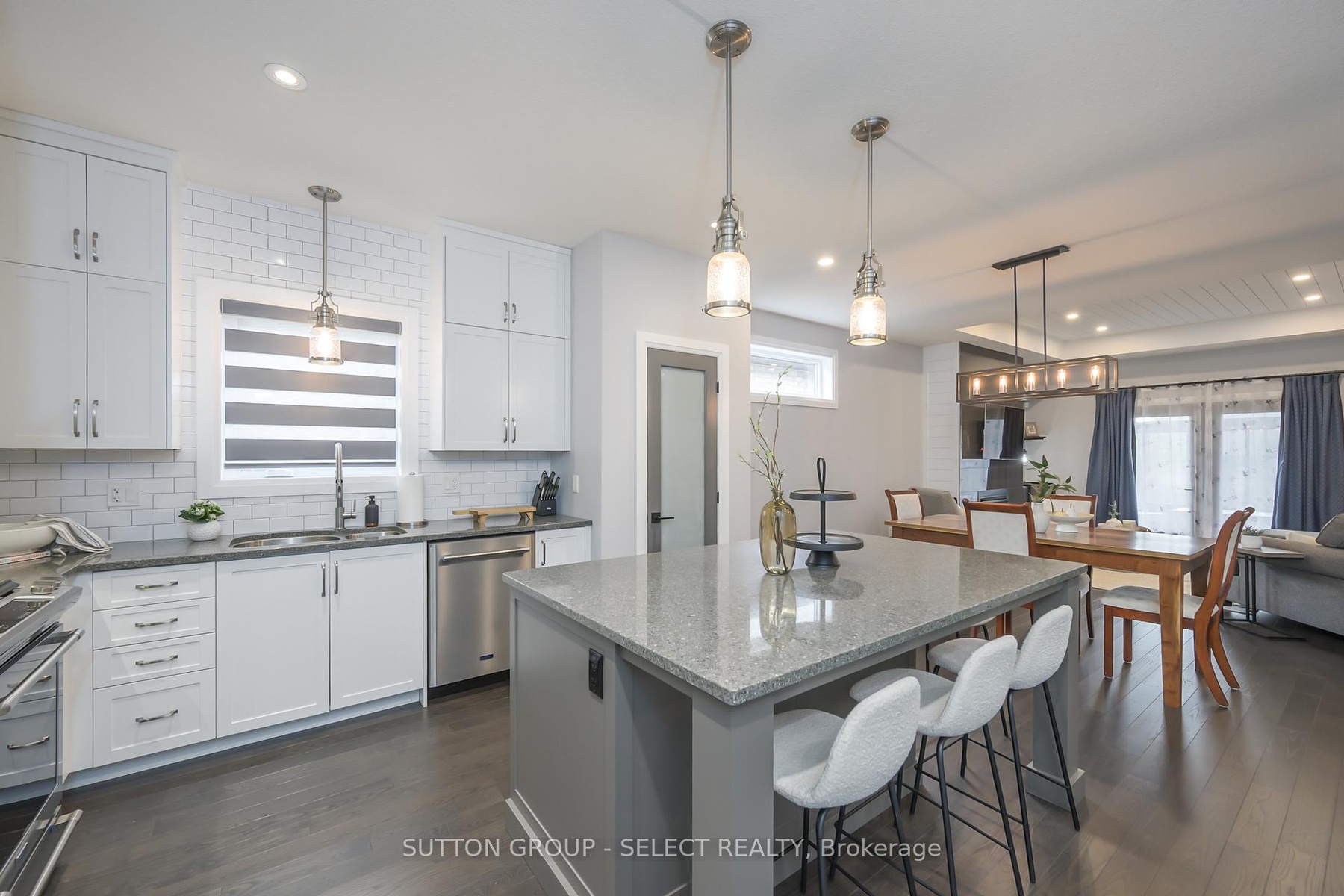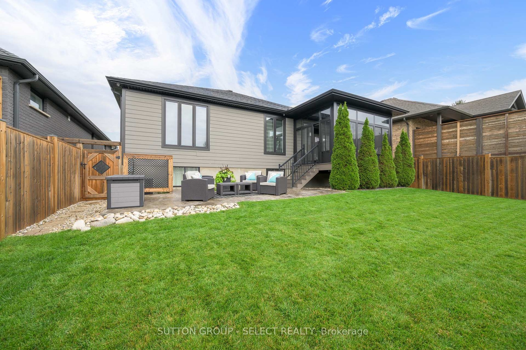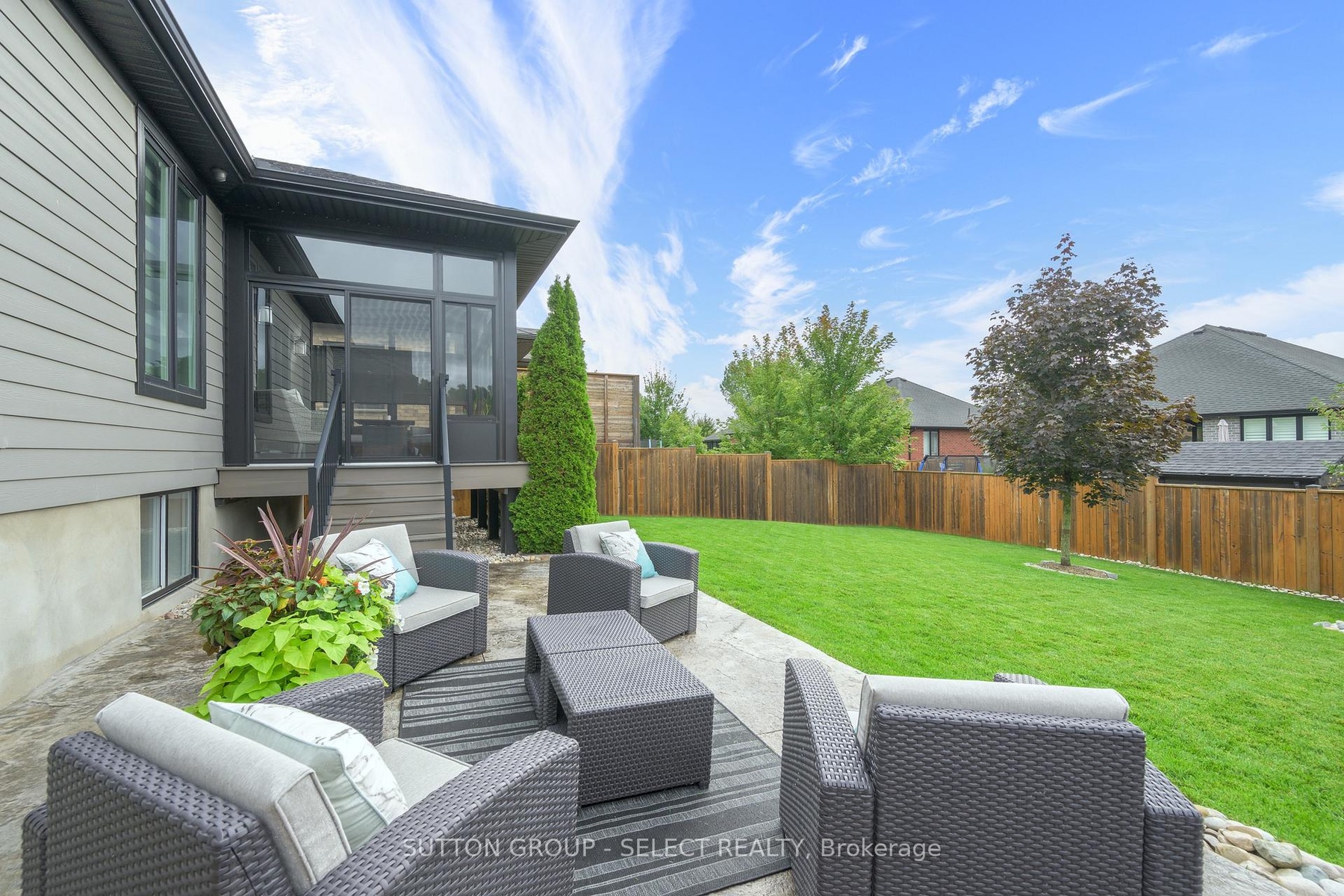 This beautifully maintained bungalow offers just under 1,650 sq ft on the main level plus over 1,000 sq ft of finished living space below, designed for families with teens or couples who love to entertain. With 5 bedrooms (3+2), 3 full bathrooms, and a double garage, theres room here for everyone to spread out.The open-concept main floor boasts 9-foot ceilings, hardwood floors, and a kitchen thats built for everyday living and weekend gatherings alike, complete with quartz countertops, stainless appliances, gas stove, and a pantry. The dining area flows into the living room, where a gas fireplace and tray ceiling create a warm, stylish space. Step out to the 16' x 10' screened-in sunroomperfect for summer evenings and late-night conversations.The primary suite is a private retreat with a walk-in closet and spa-like ensuite featuring a tiled shower. Two additional bedrooms, a full bath, and a large laundry room, round out the main floor.Downstairs (finished in 2019), the vibe shifts to relaxation and fun: a spacious rec room, wet bar, sitting area with fireplace, plus two more bedrooms and a full bath, ideal for teens, visiting friends, or extended family.Outside, you'll love the fully fenced yard with landscaped gardens, concrete patio, sprinkler system, and 10x10 shed, low-maintenance and easy to enjoy.Located in the sought-after South Creek subdivision, you're close to trails, schools, and amenities, with quick access to the 402, just 10 minutes to Strathroy and 20 minutes to London.