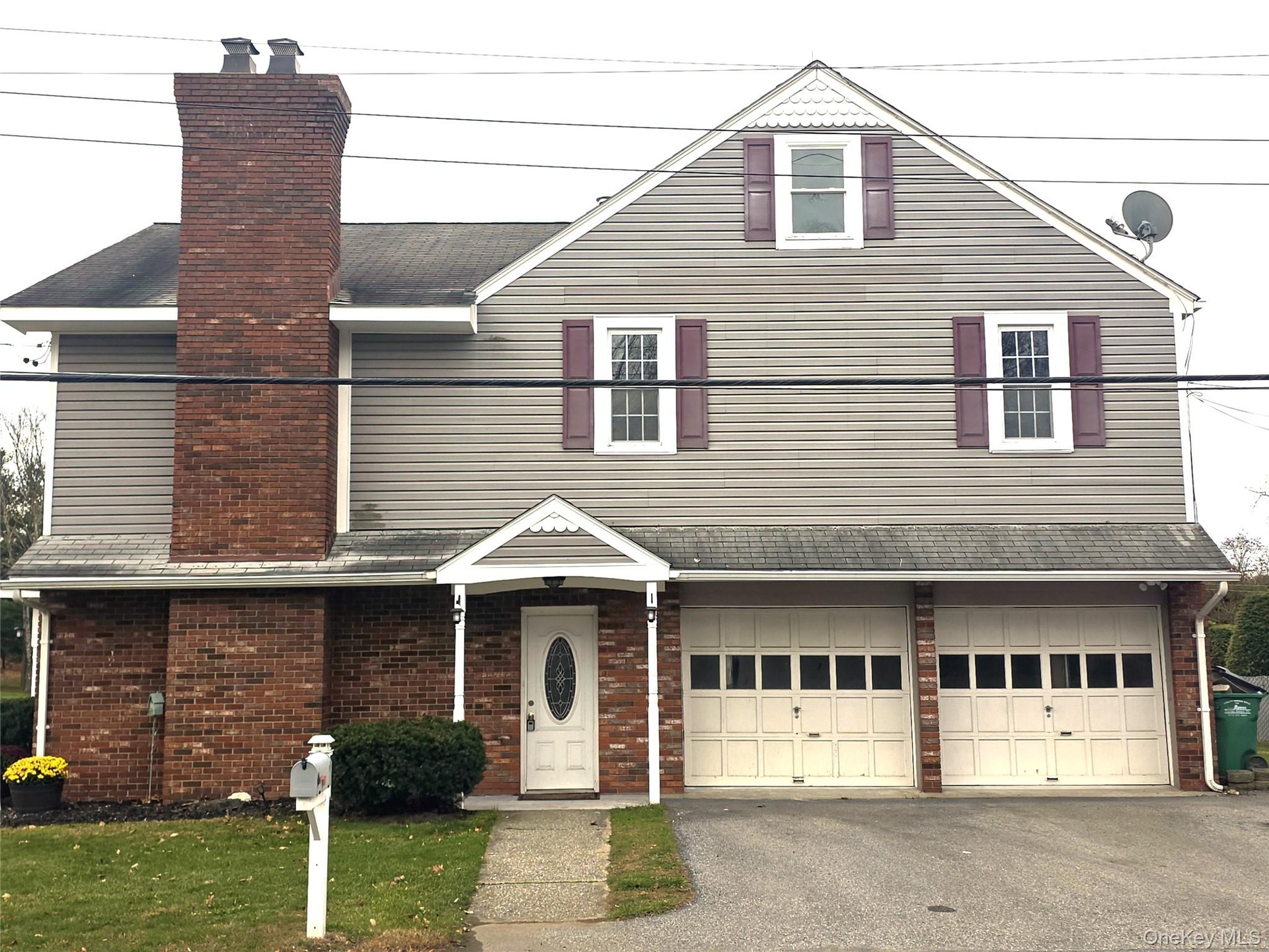 - View of front of home with a chimney, brick siding, and asphalt driveway