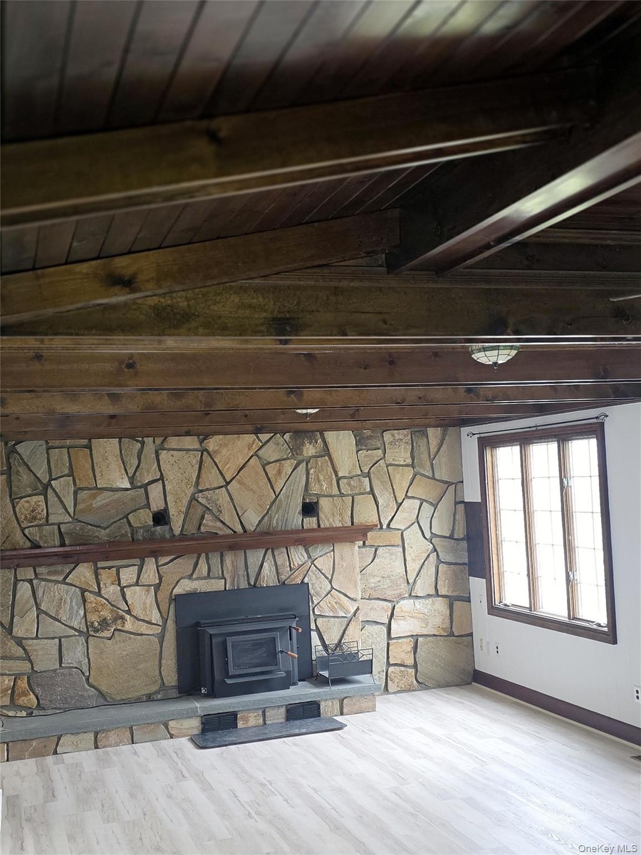 - Detailed view of a wood stove, wood finished floors, and a wooden ceiling with exposed beams