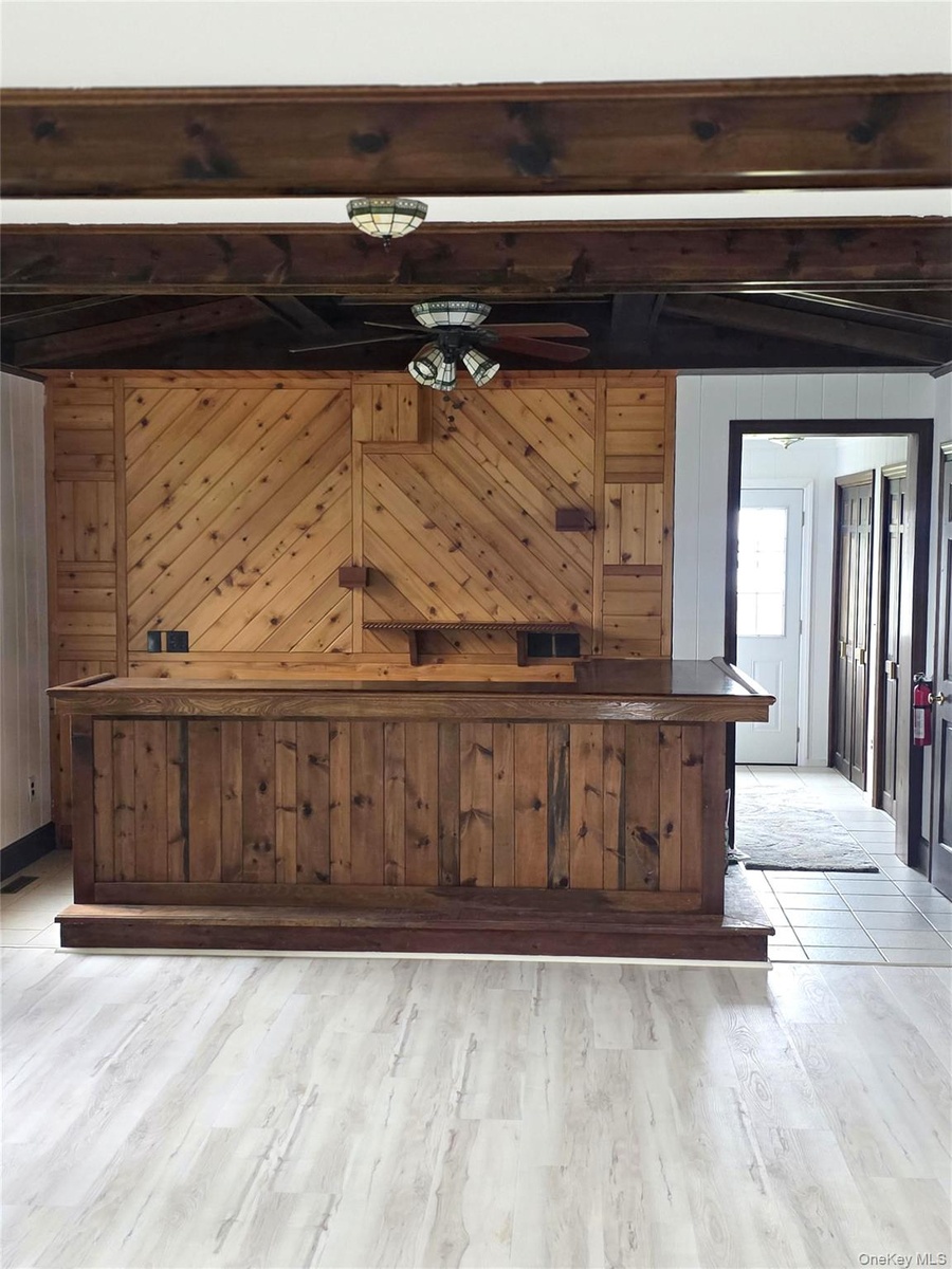 - Bar with wooden walls, light wood-type flooring, beamed ceiling, dark countertops, and a ceiling fan