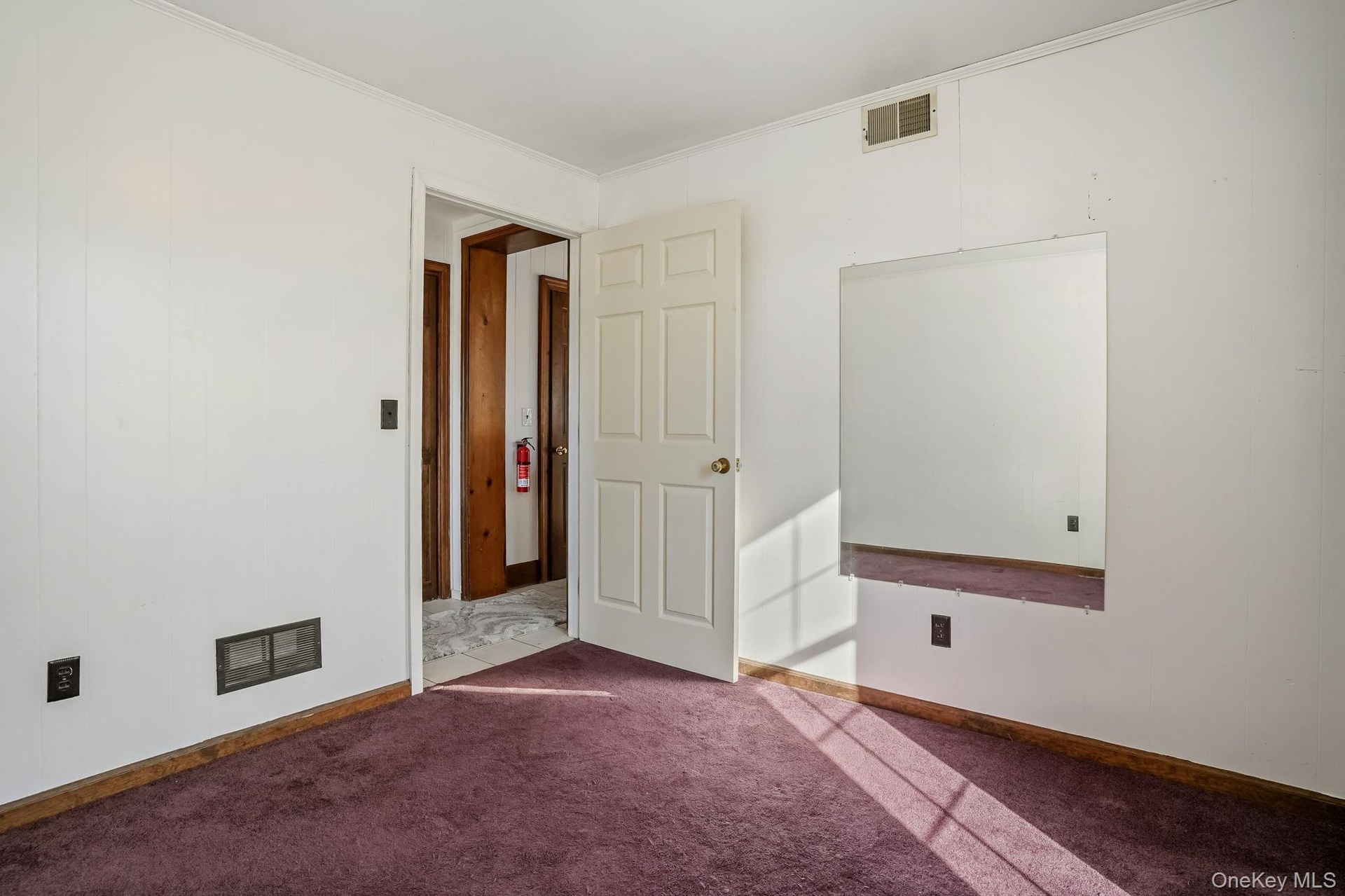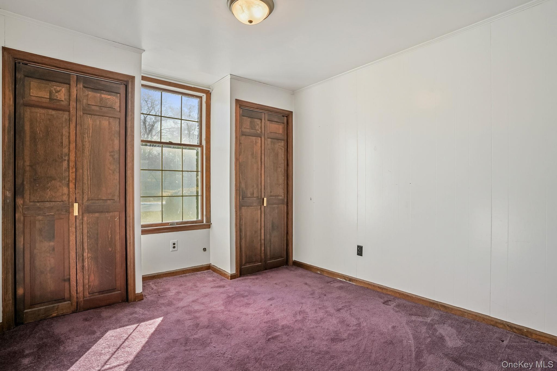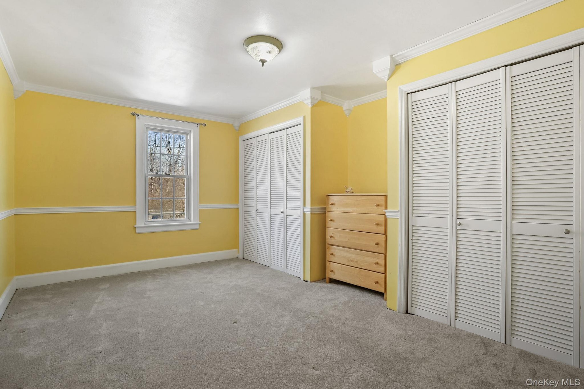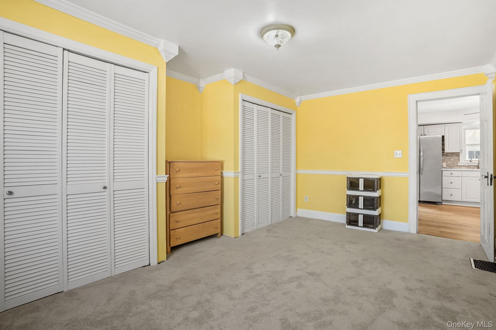 - Unfurnished bedroom with dark carpet, multiple closets, and ornamental molding