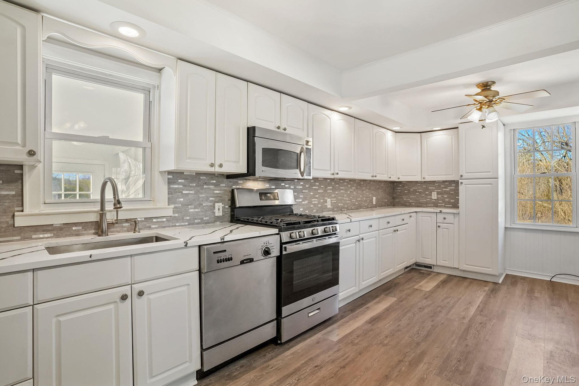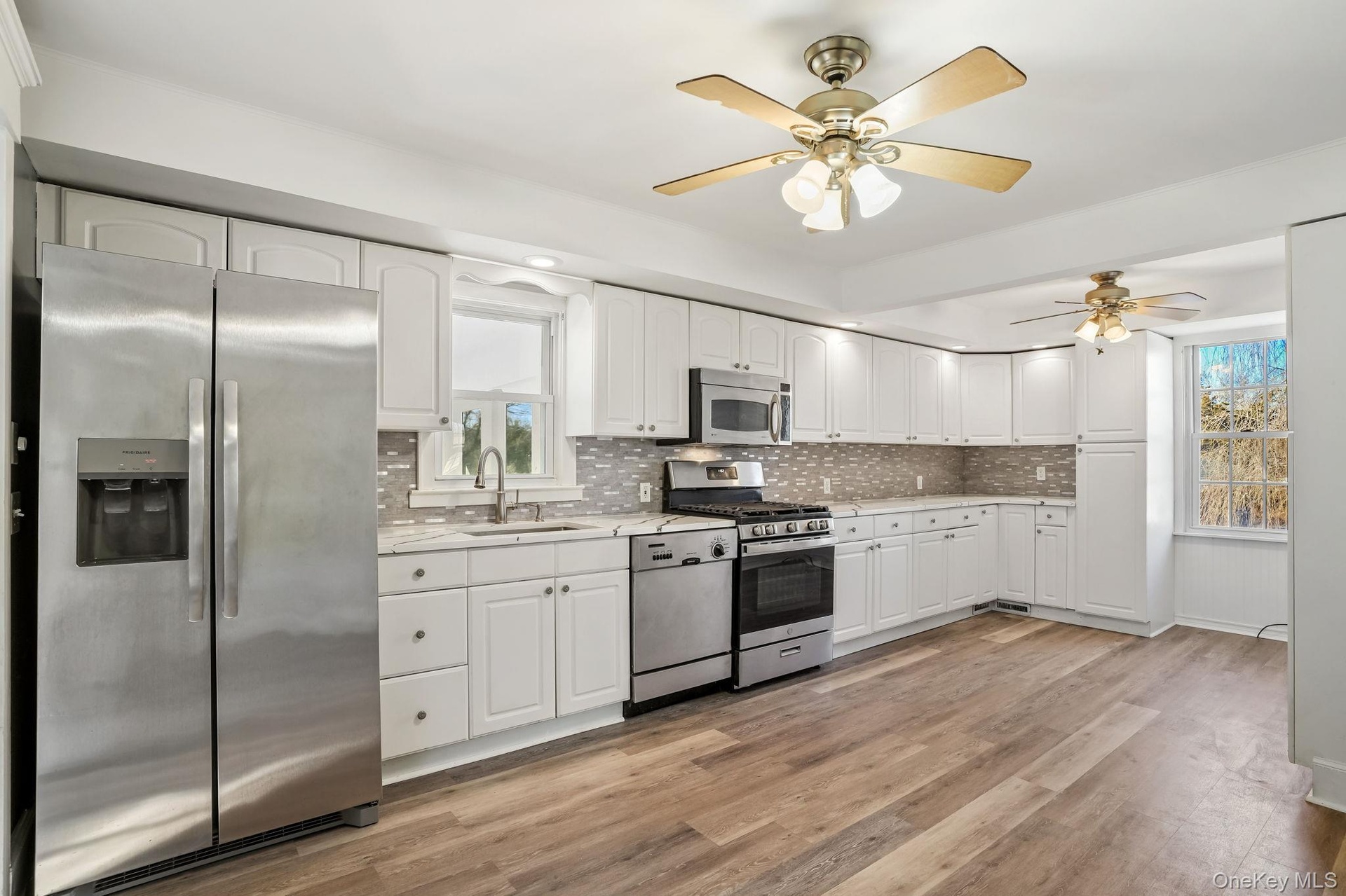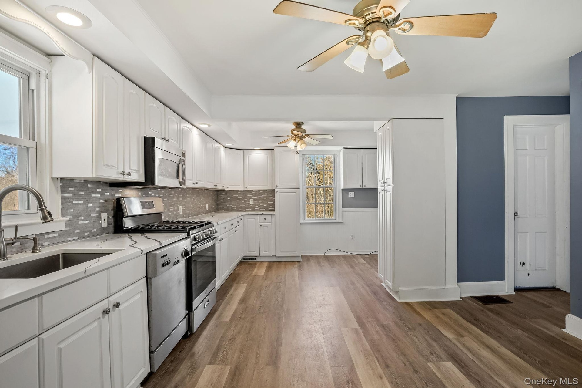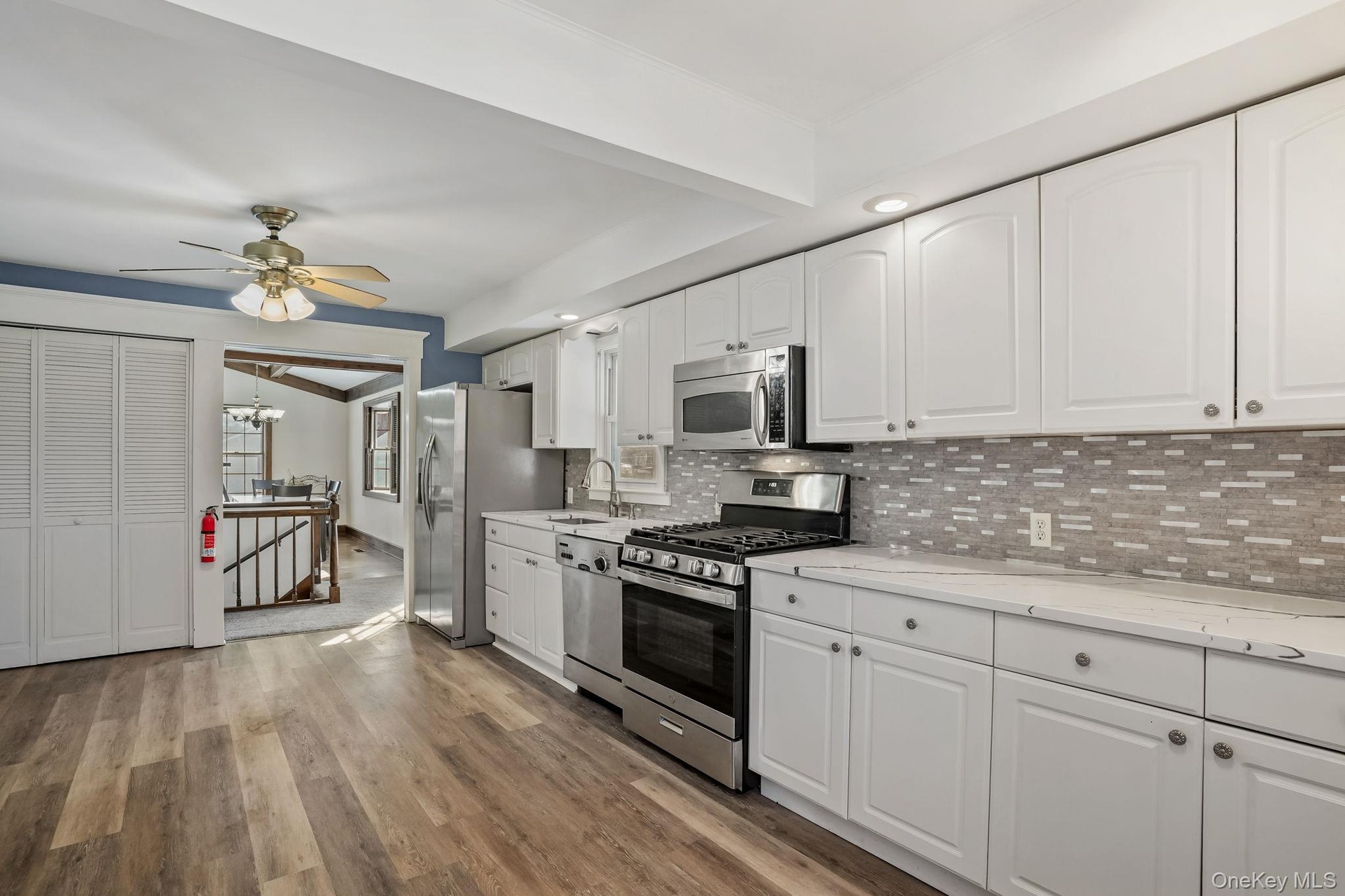 - Kitchen with stainless steel appliances, white cabinetry, dark wood-style flooring, and backsplash