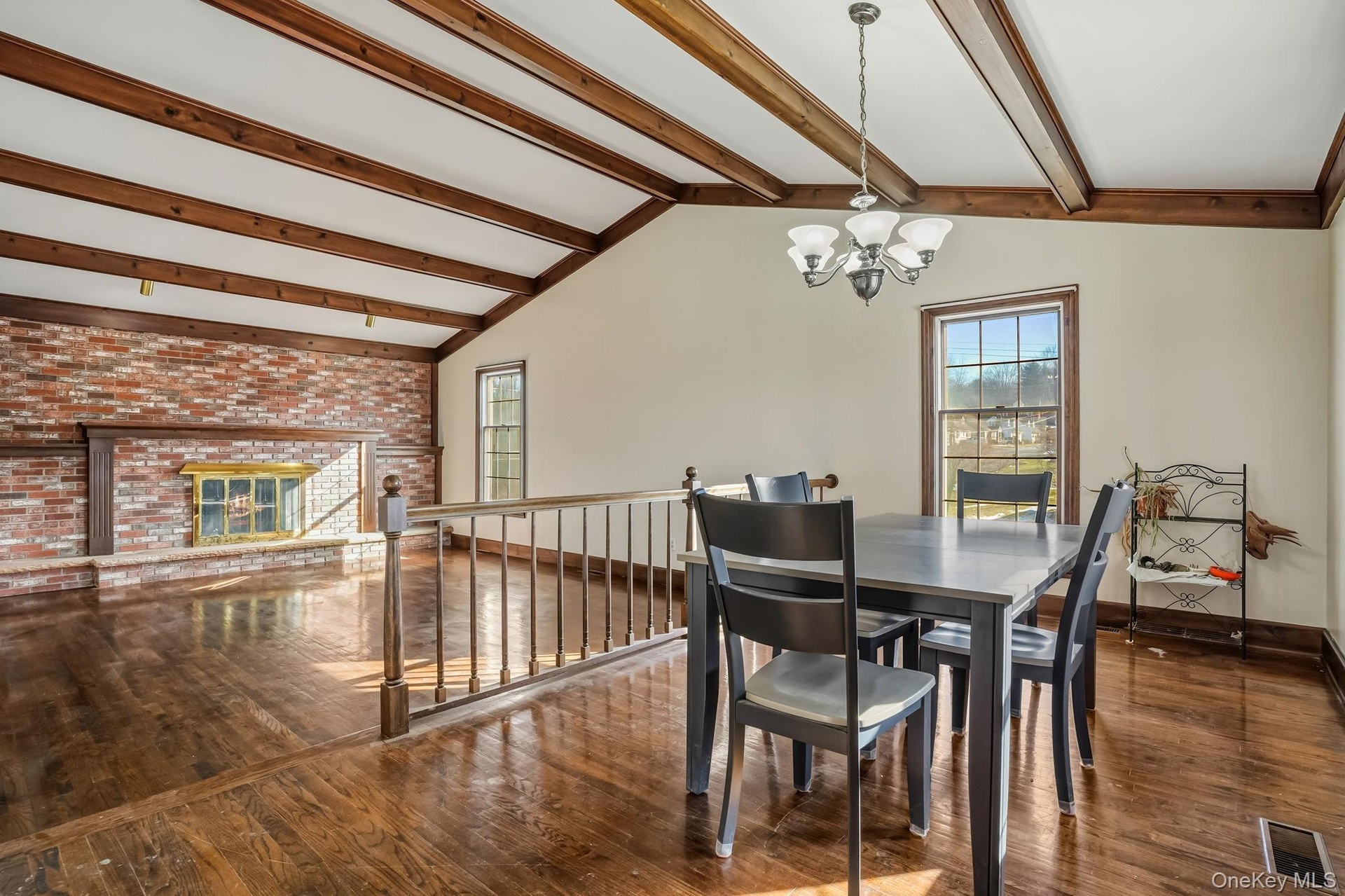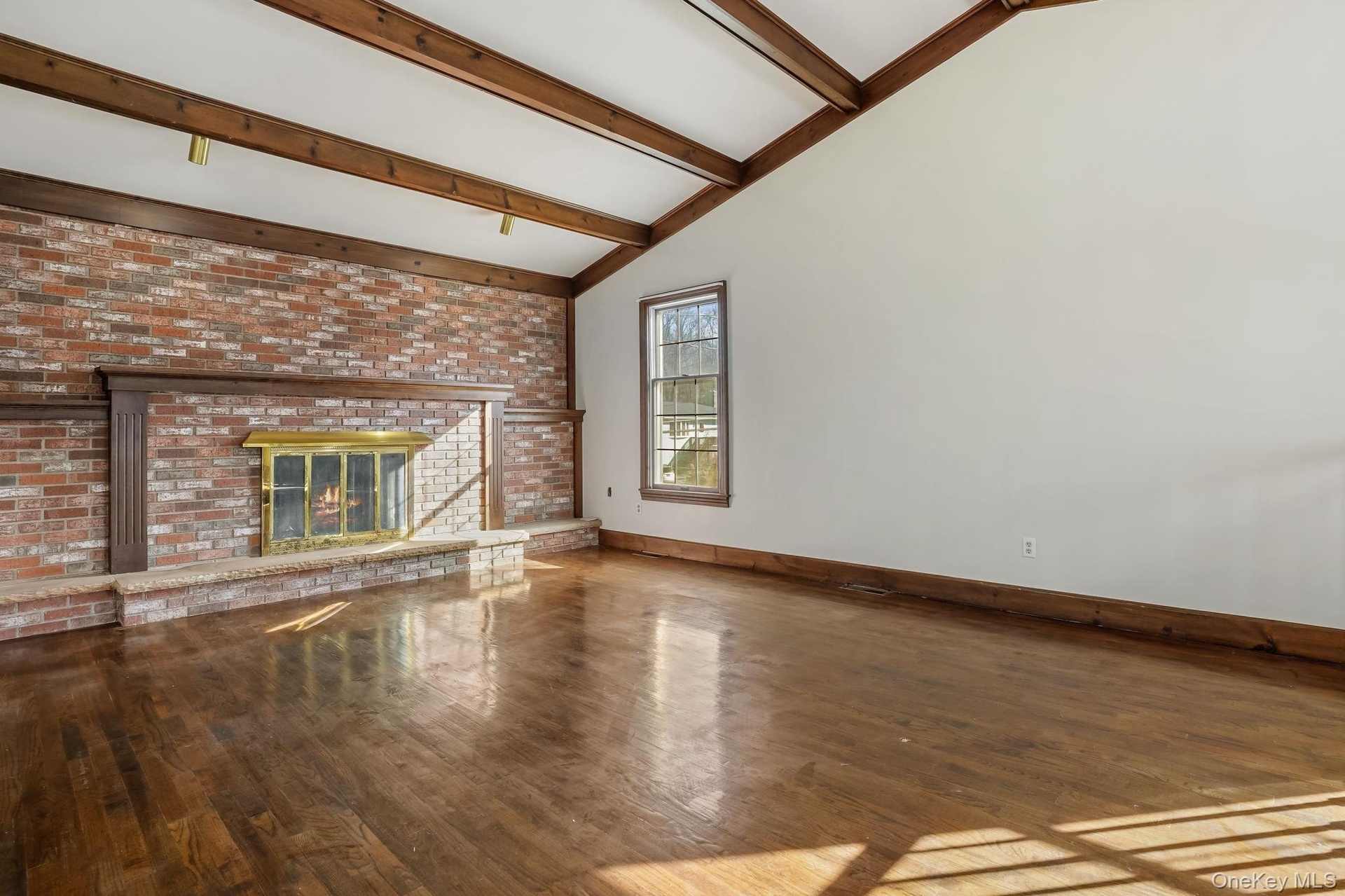 - Grand living room with wood finished floors, beamed ceiling, a brick fireplace, and brick wall