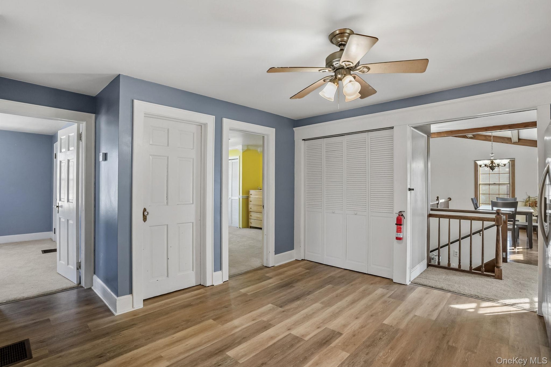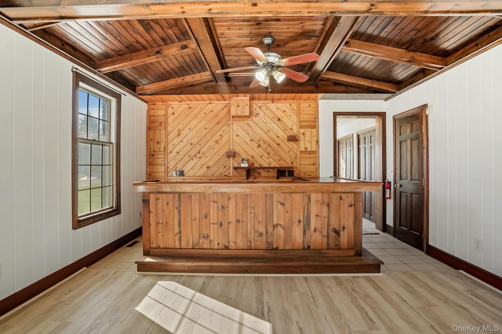 - Entrance foyer with light wood finished floors, beamed ceiling, plenty of natural light, wood walls, and ceiling fan